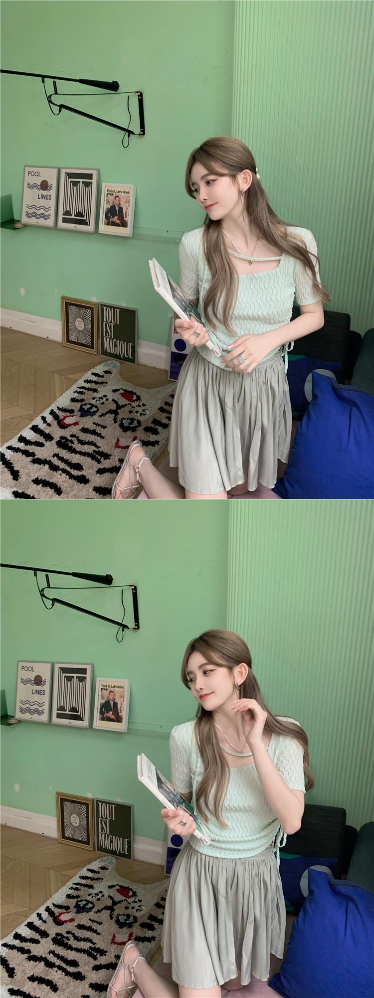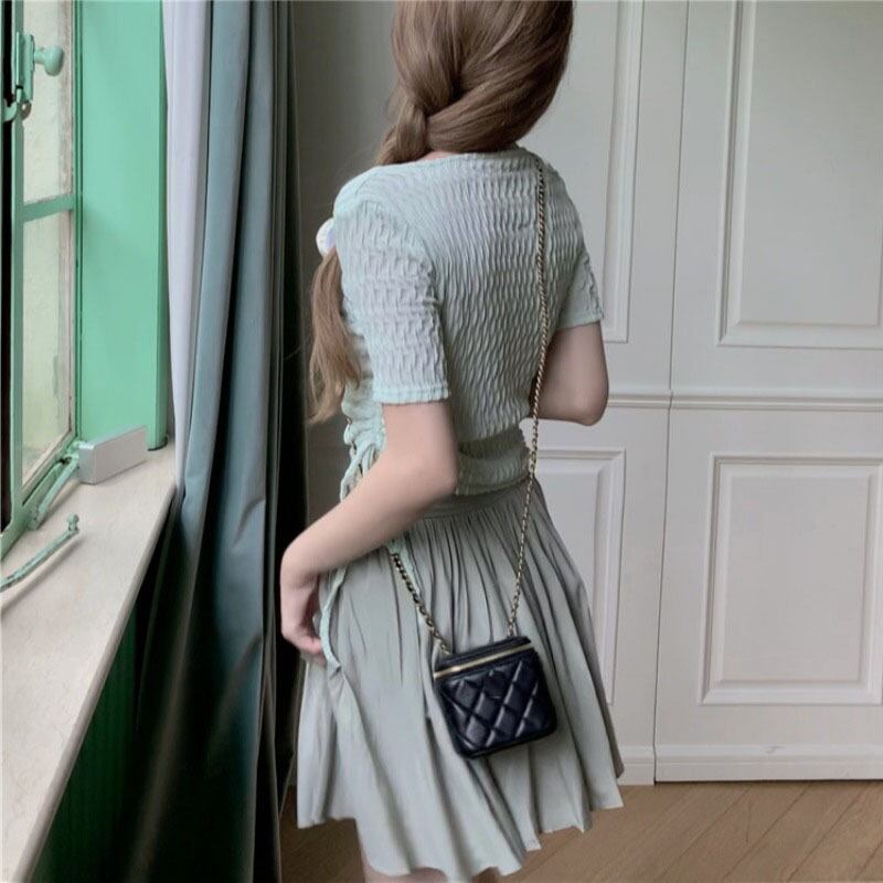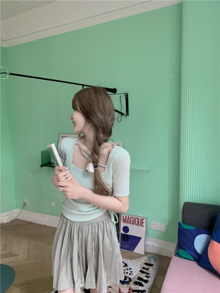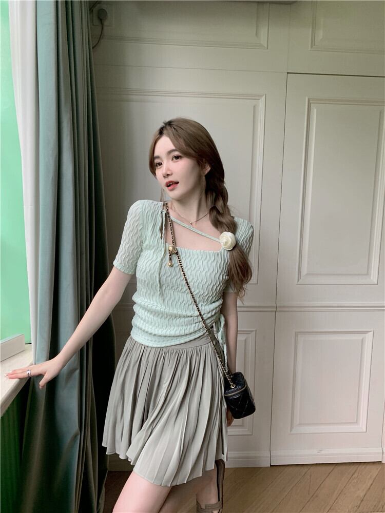 Tシャツ サマーソリッド カラーショートギャザープリーツ薄手トップス 夏物 ソリッドカラー スクウェア YY-ファッション48607608558