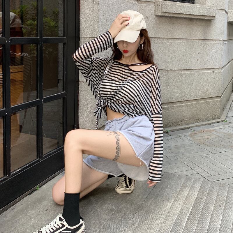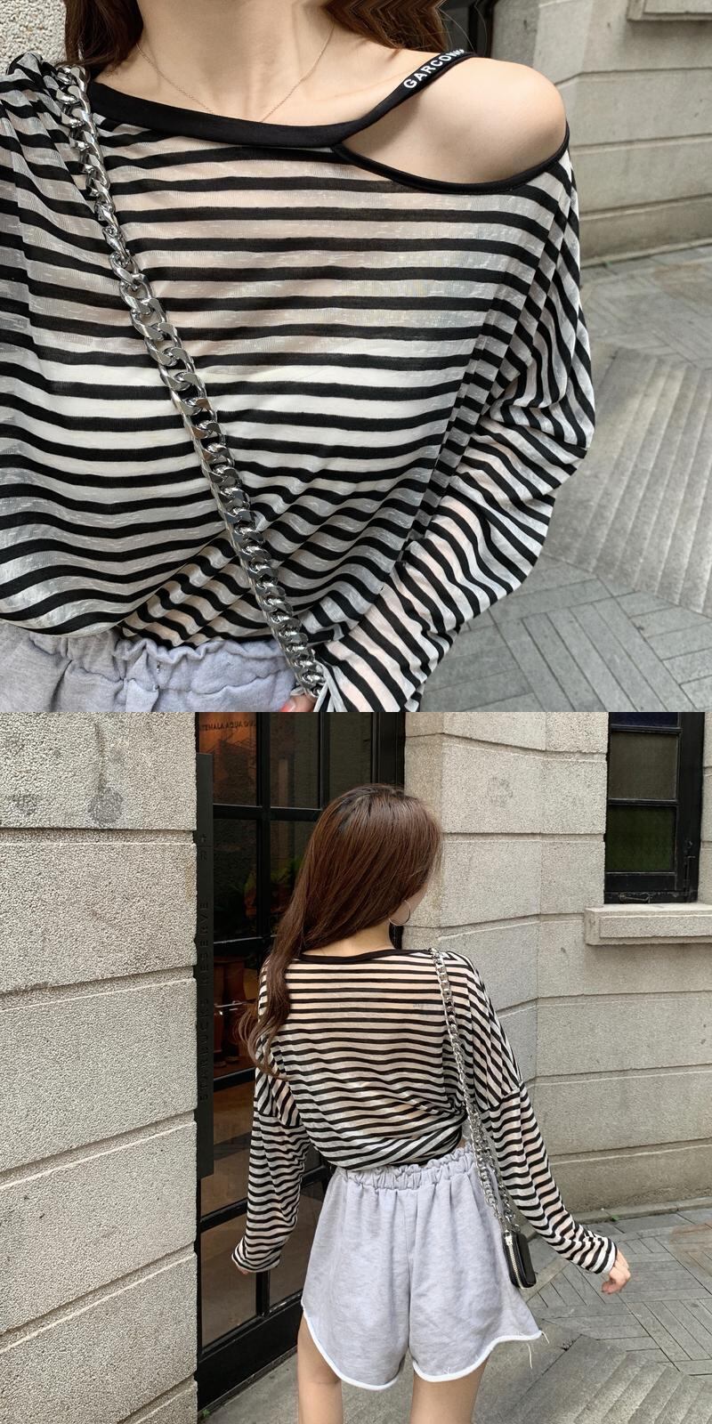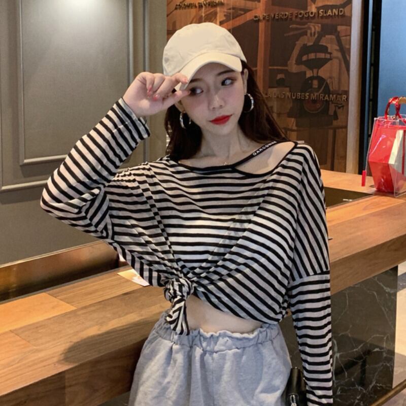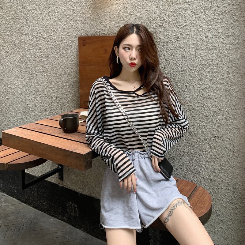 サマーレッドルーズ薄手トップス シャツ ストライプTシャツ レディース ロング 夏物 YY-ファッション48281035837