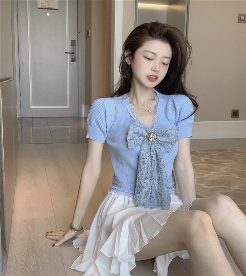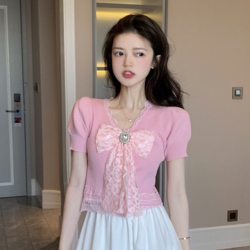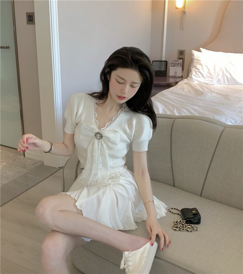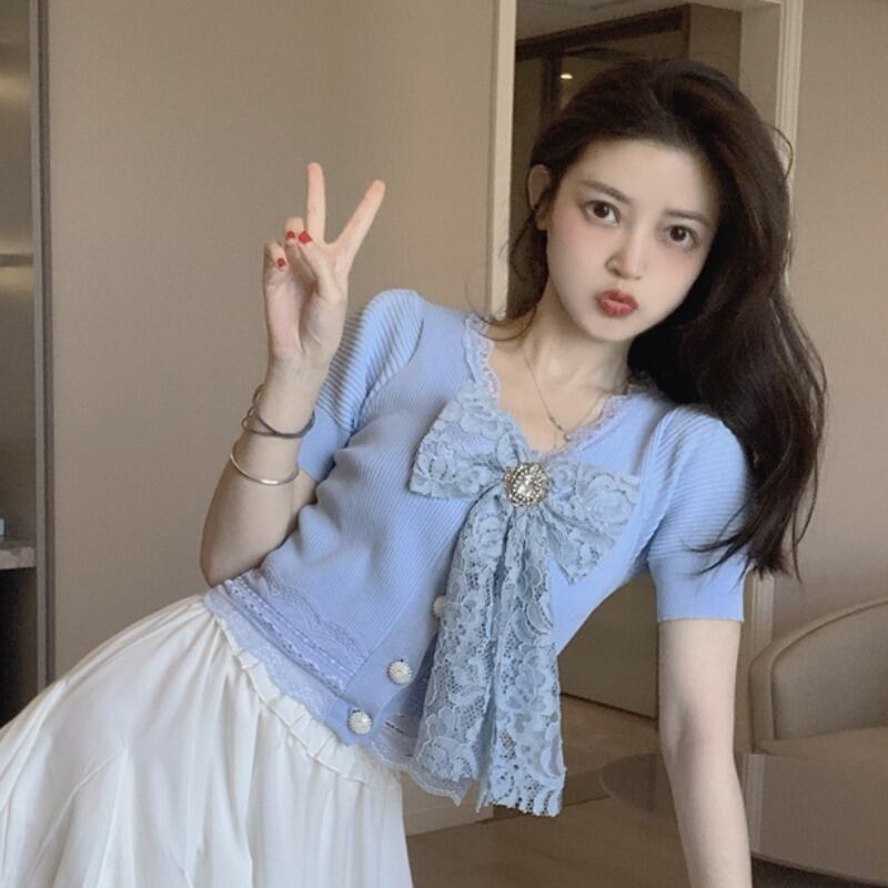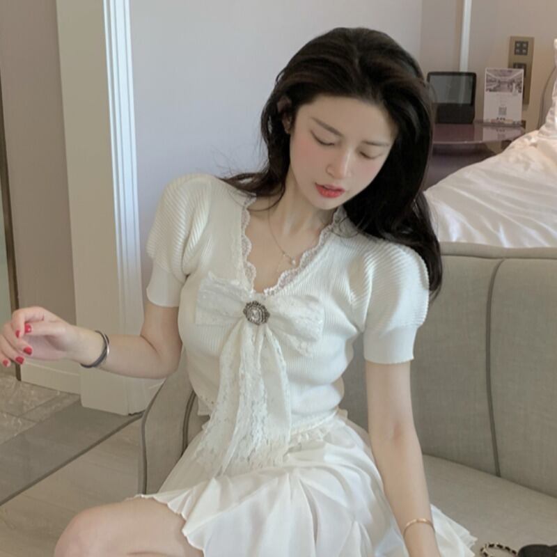 レースリボンホワイトニットセーター 薄手サマースリムVネッククロップドトップス 夏物 YY-ファッション31993098976