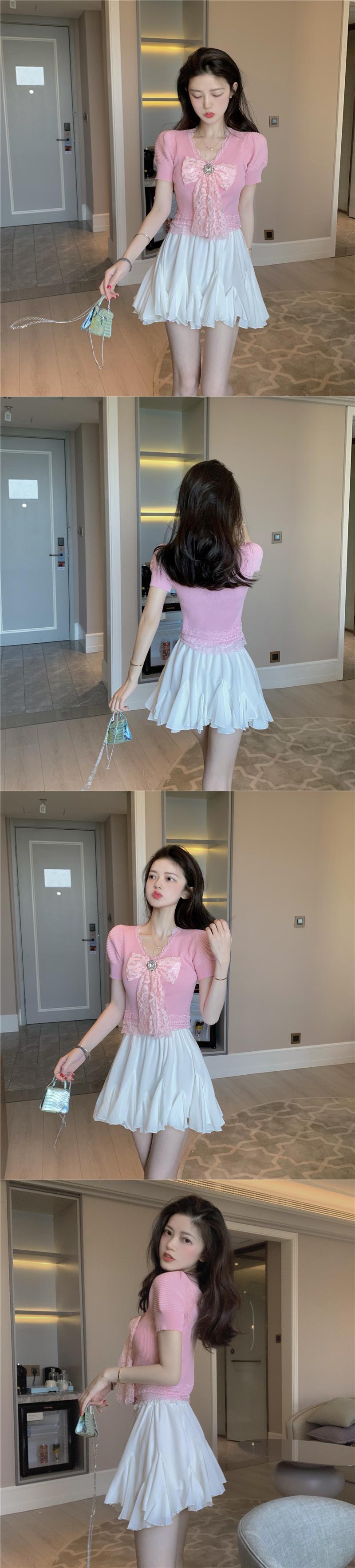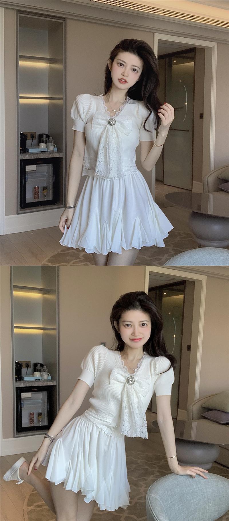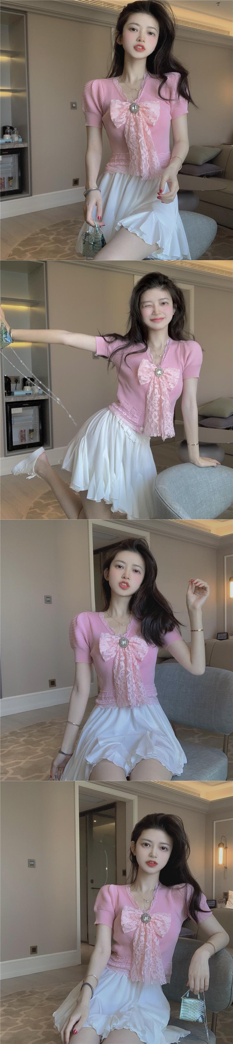 レースリボンホワイトニットセーター 薄手サマースリムVネッククロップドトップス 夏物 YY-ファッション31993098976