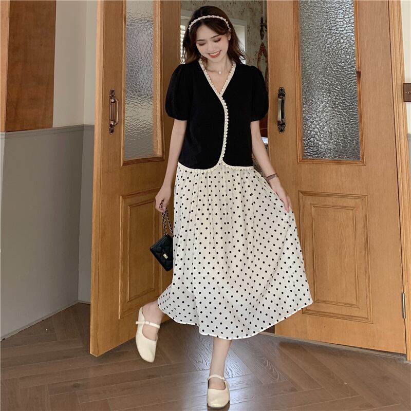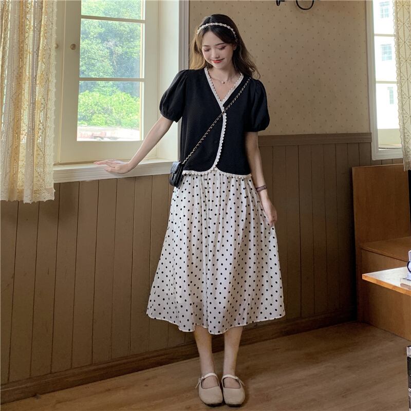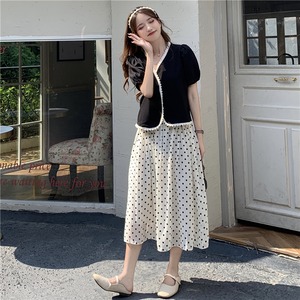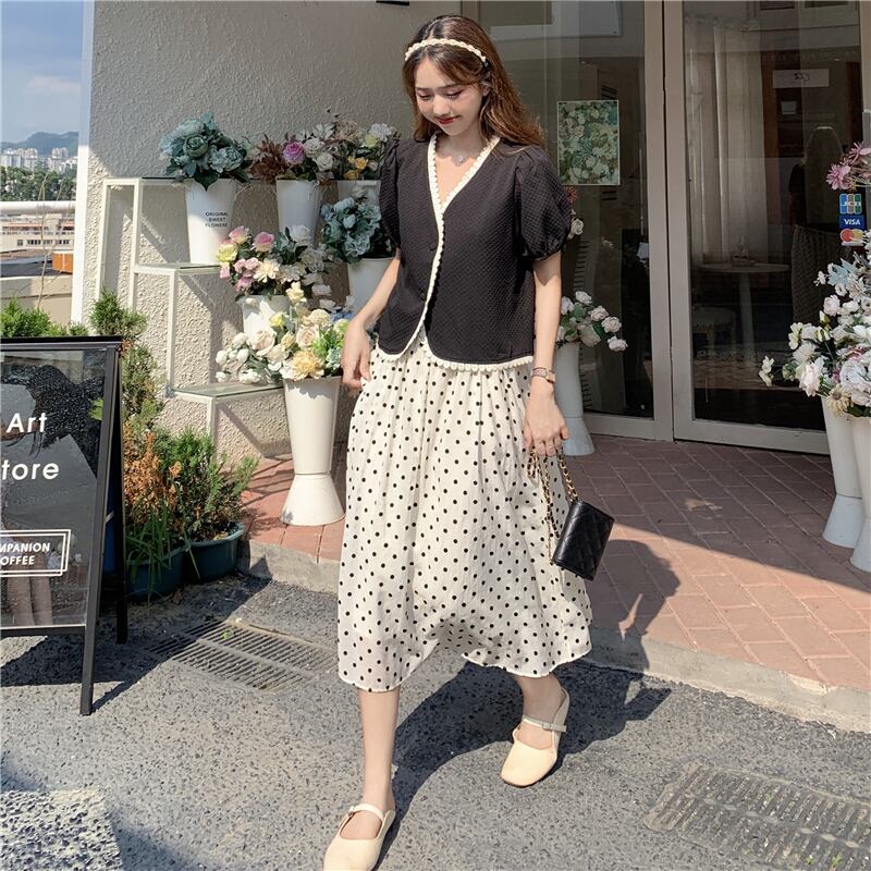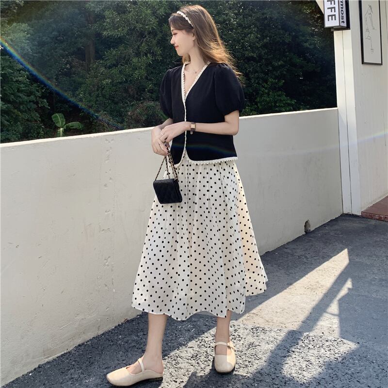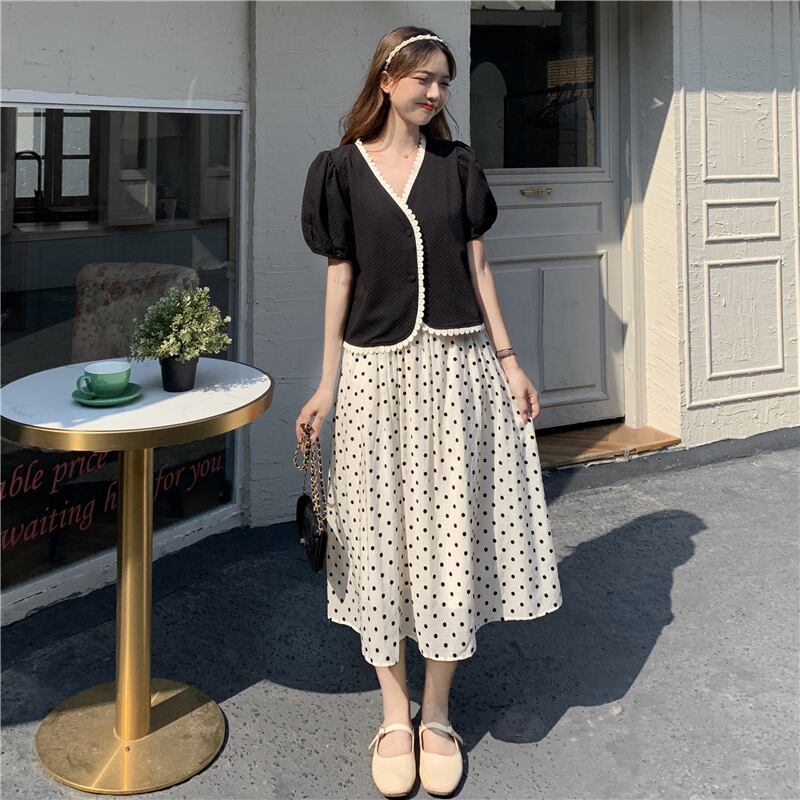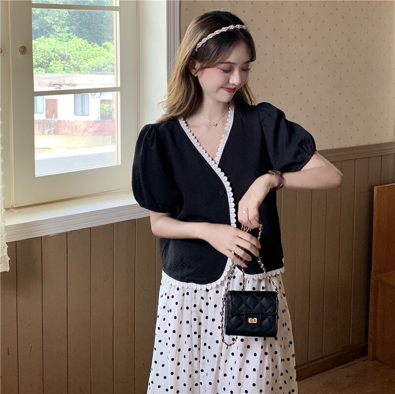 サマースタイルレースVネックブラウス ハイウェストウェストAラインスカート 夏物 YY-ファッション2286686741