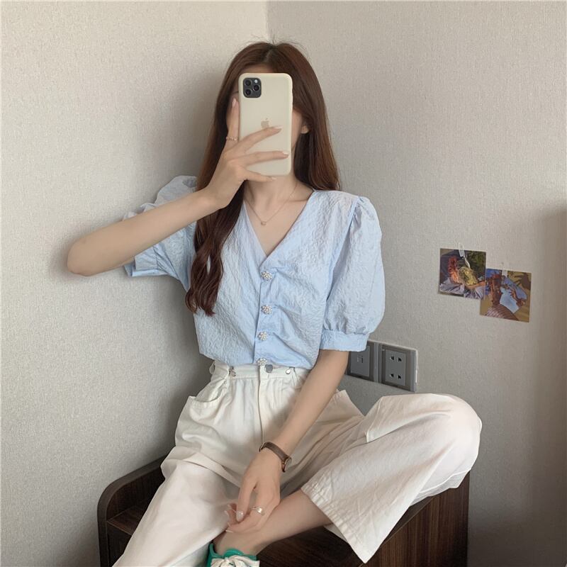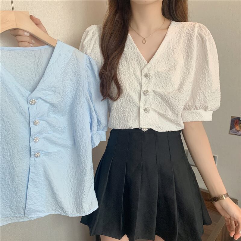 サマースリーブトップス パールボタンプリーツホワイトシャツ 夏物 真珠 YY-ファッション2524373464