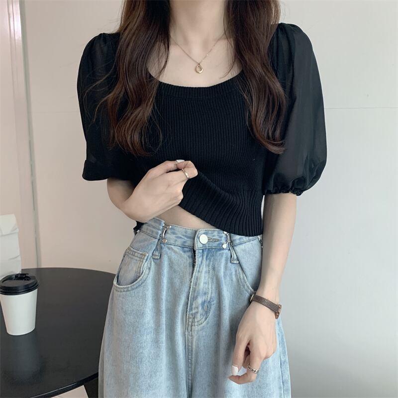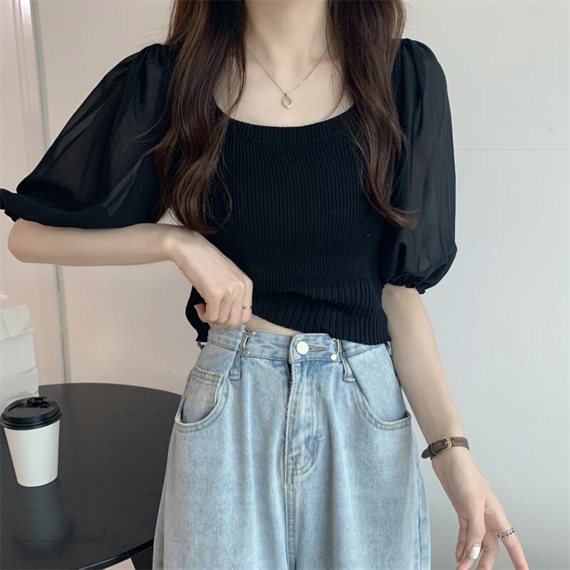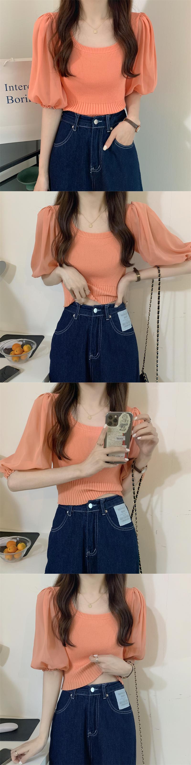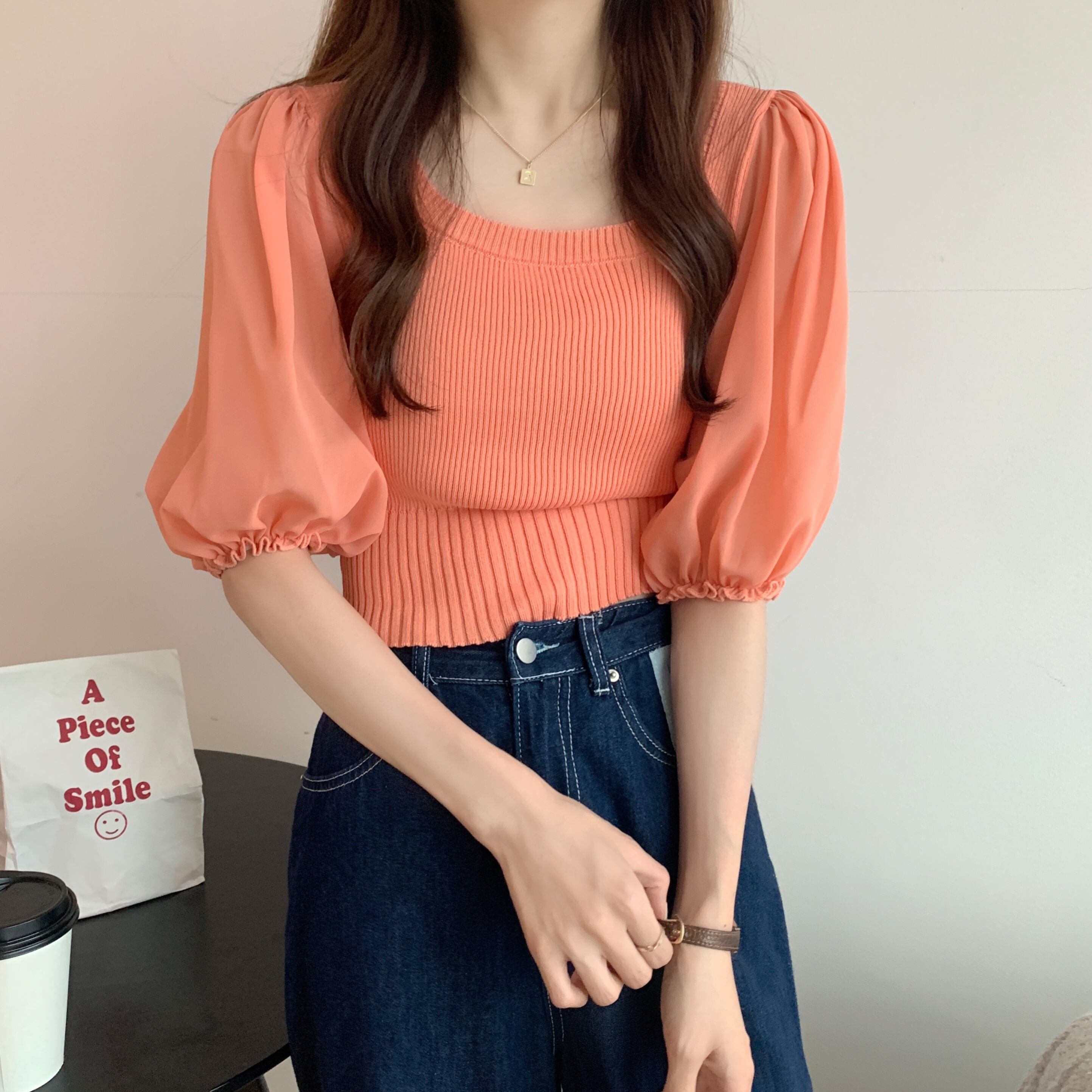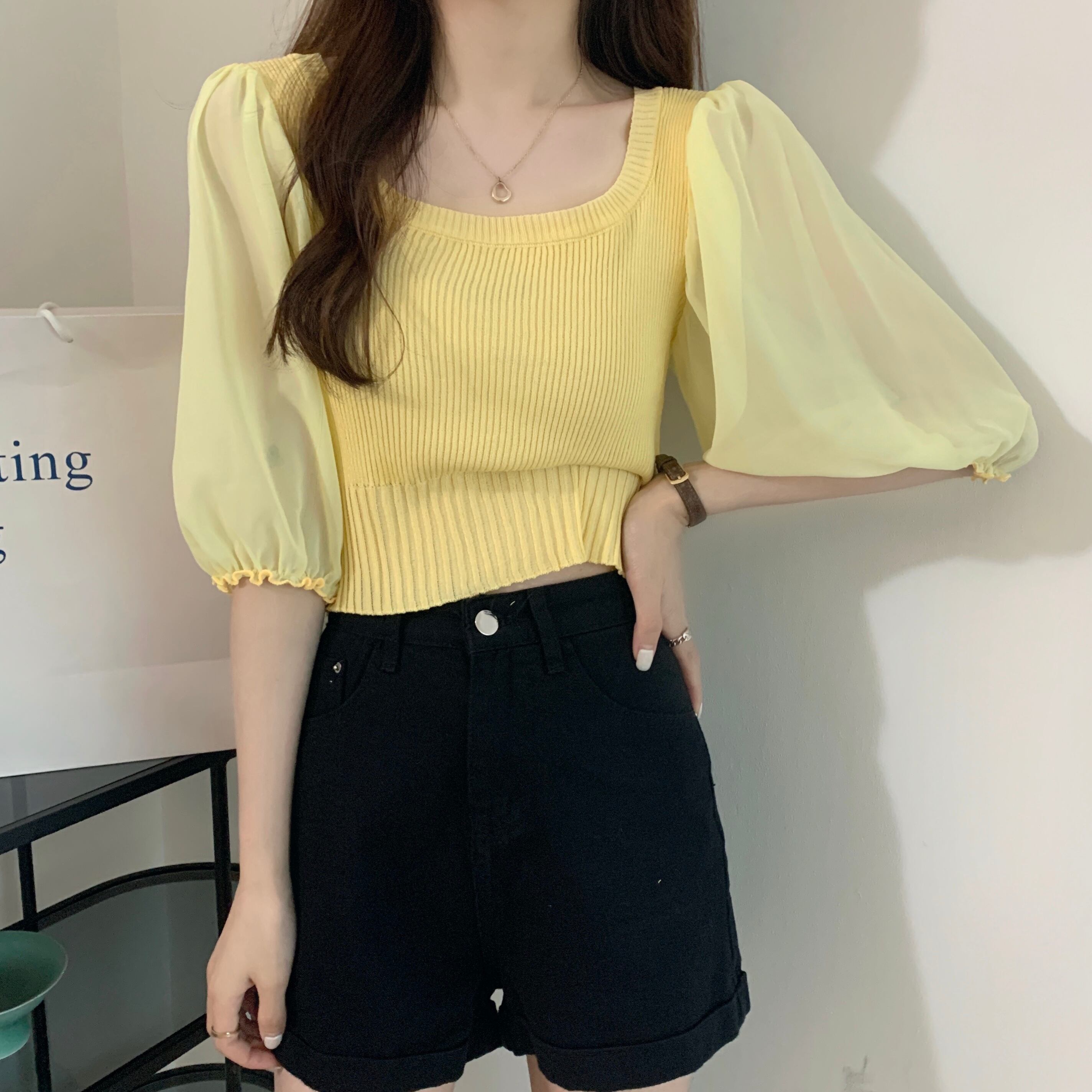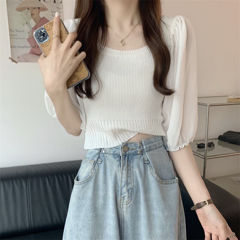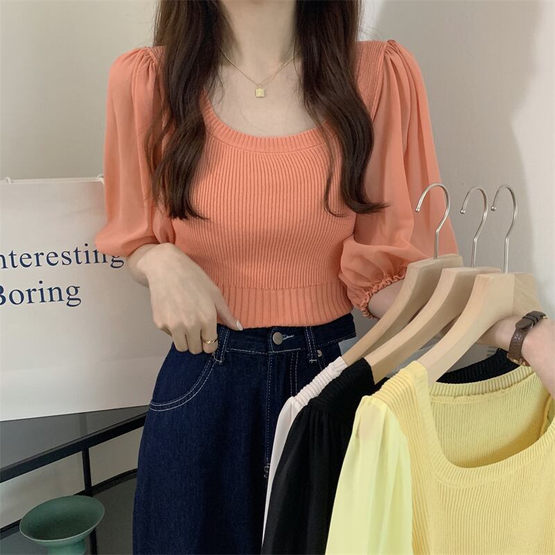 セーター レディースサマー薄手シフォンスリーブシャツ ショートトップス 夏物 シルク ステッチ YY-ファッション87146588755