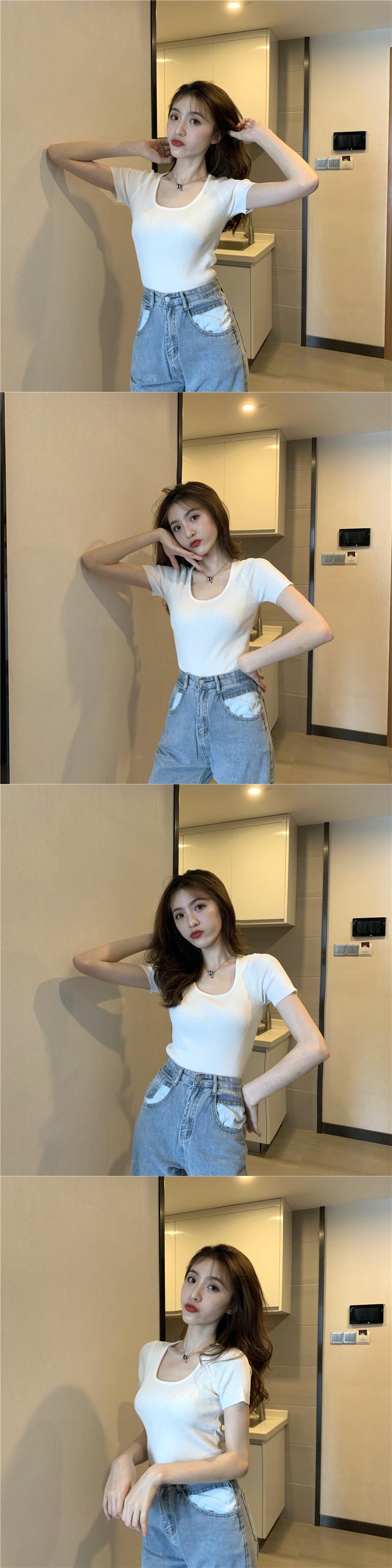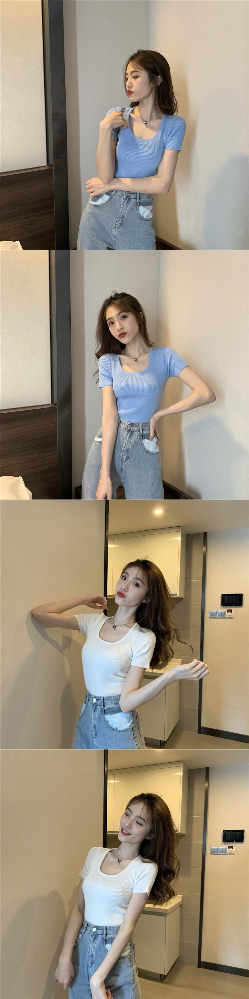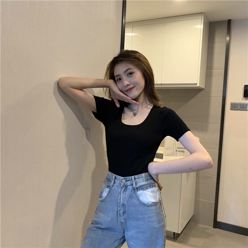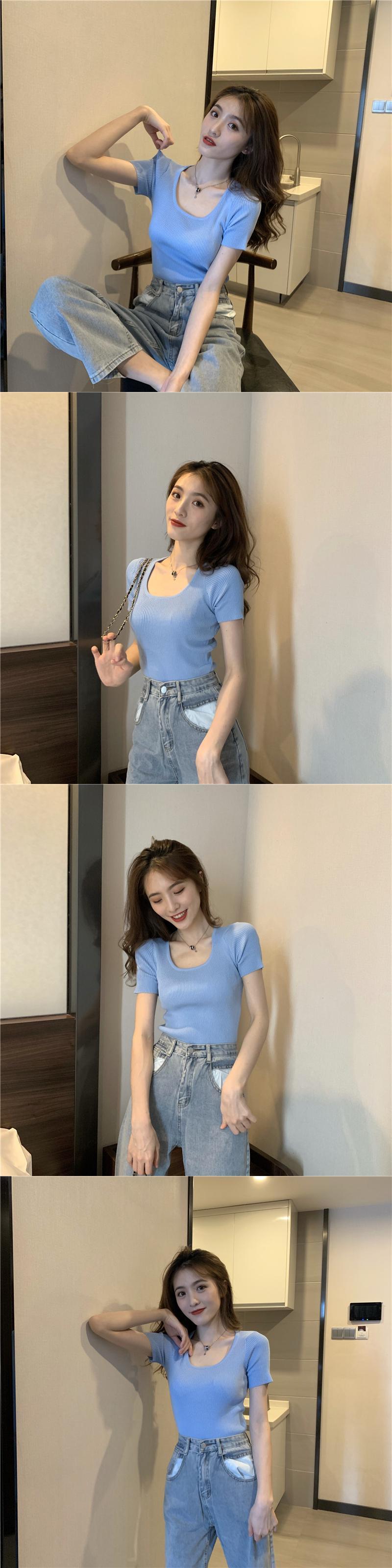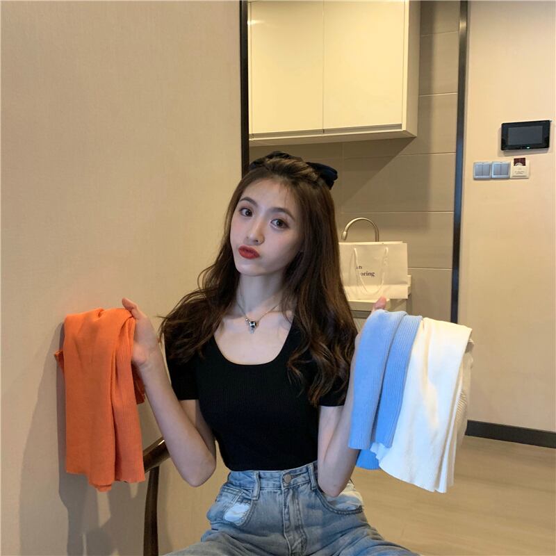 ニットTシャツ シャツ レディースサマースリムソリッド カラートップス 夏物 ソリッドカラー スクウェア YY-ファッション55243974419