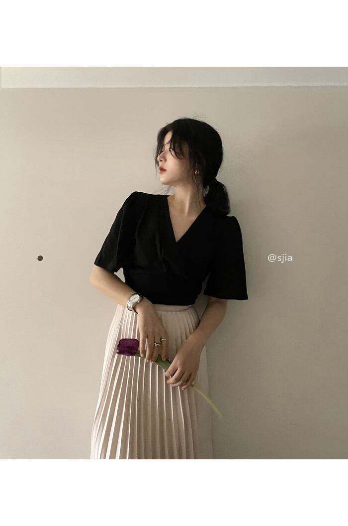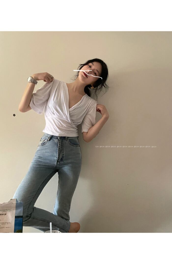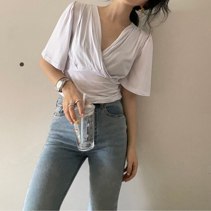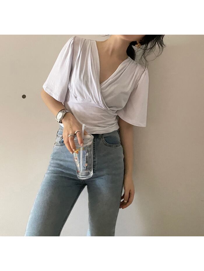 VネックTシャツ サマースリムハイウェストウェストクロップトップ トップス 夏物 YY-ファッション72113497432