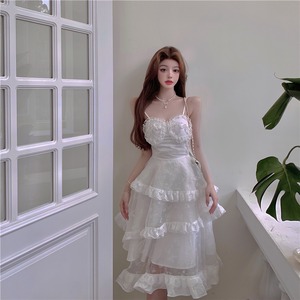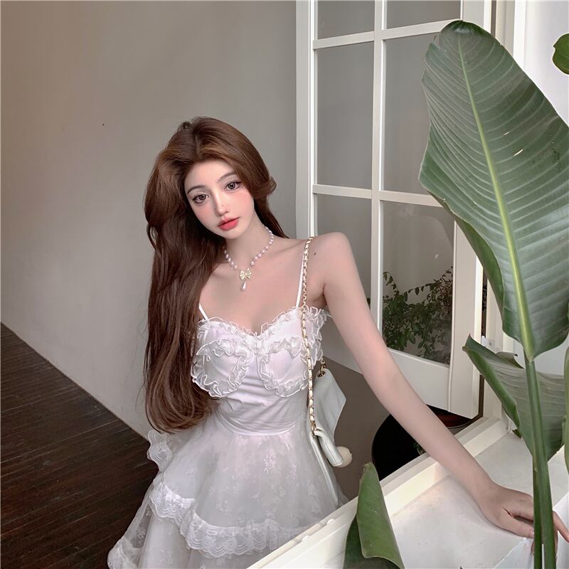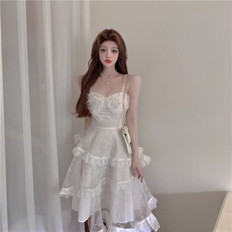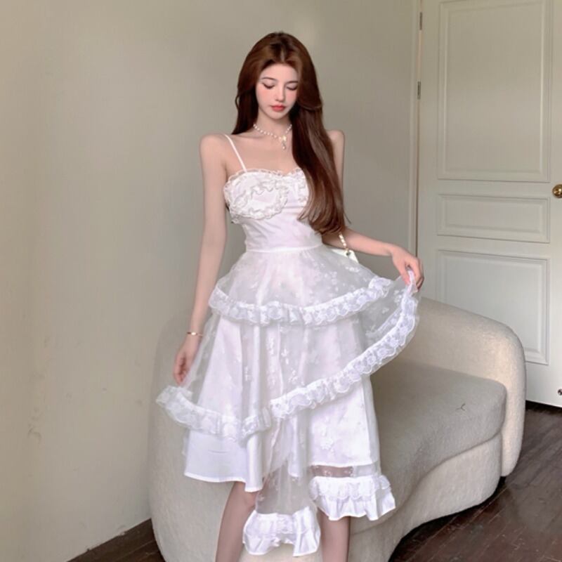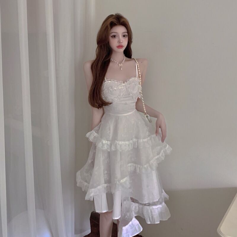 ホワイトドレス サマースタンダードレーススカート ウェストラッフル レトロ 夏物 ステッチ YY-ファッション2296814375