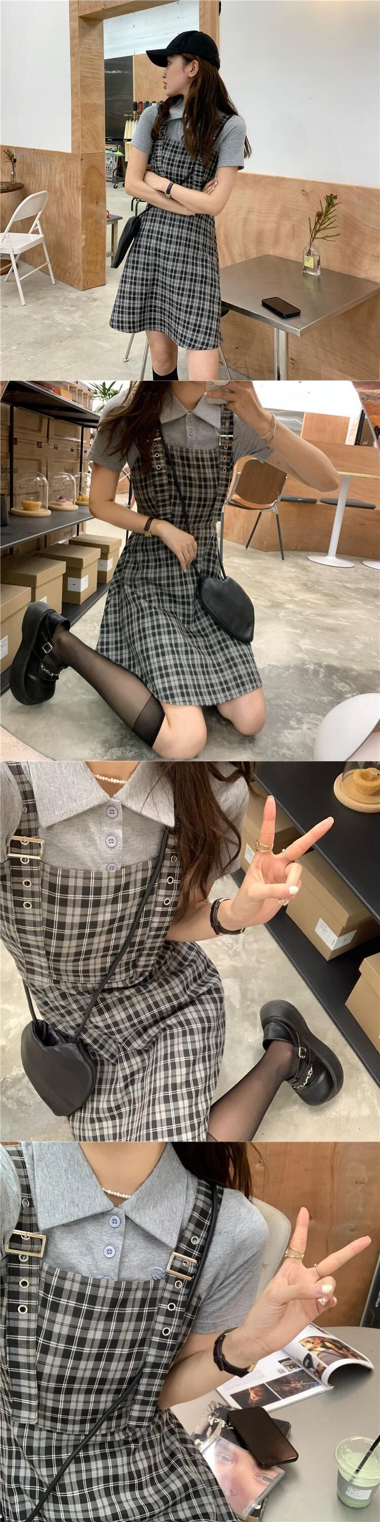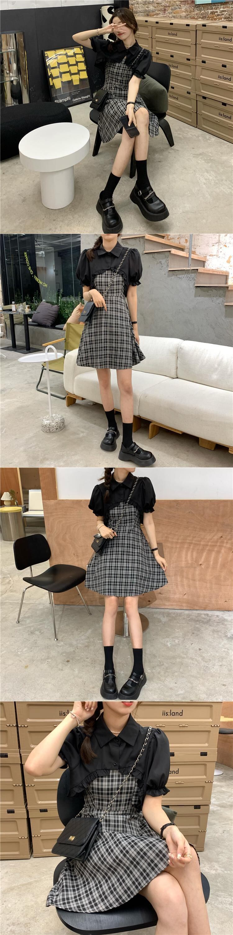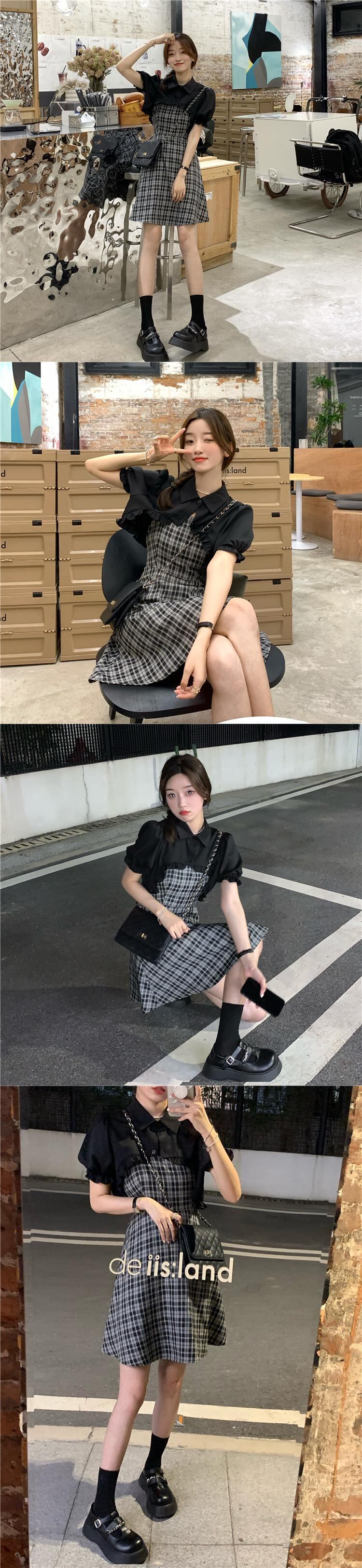 色:白いブラウス,黒のブラウス,チェック柄ホルタースカート,青い服