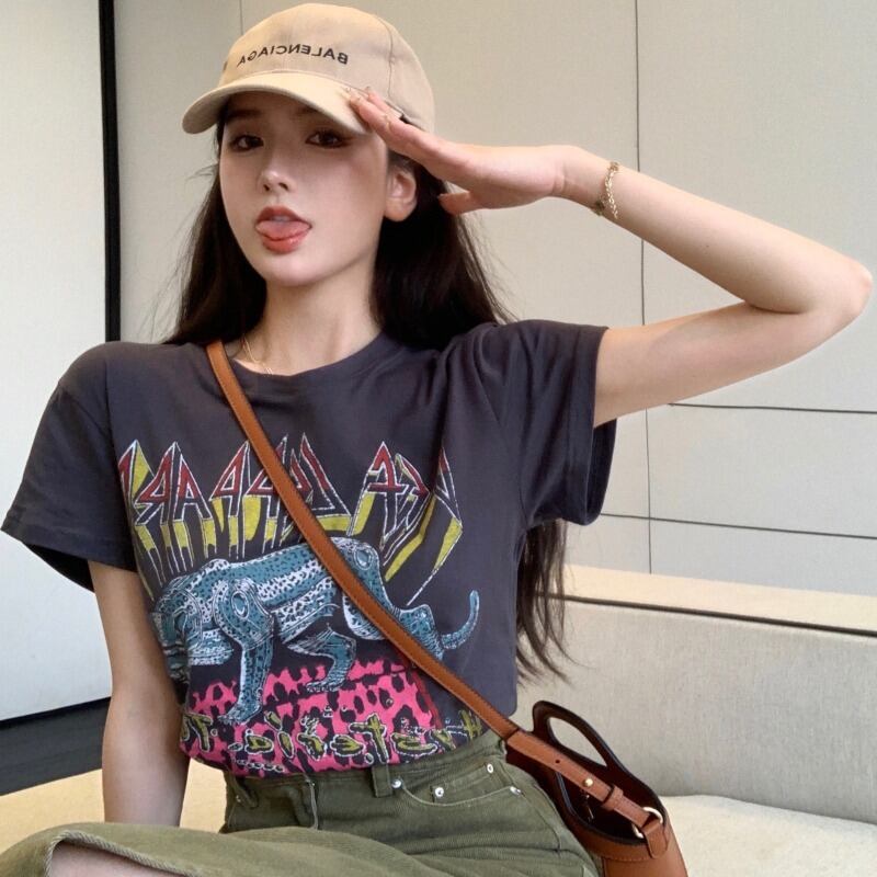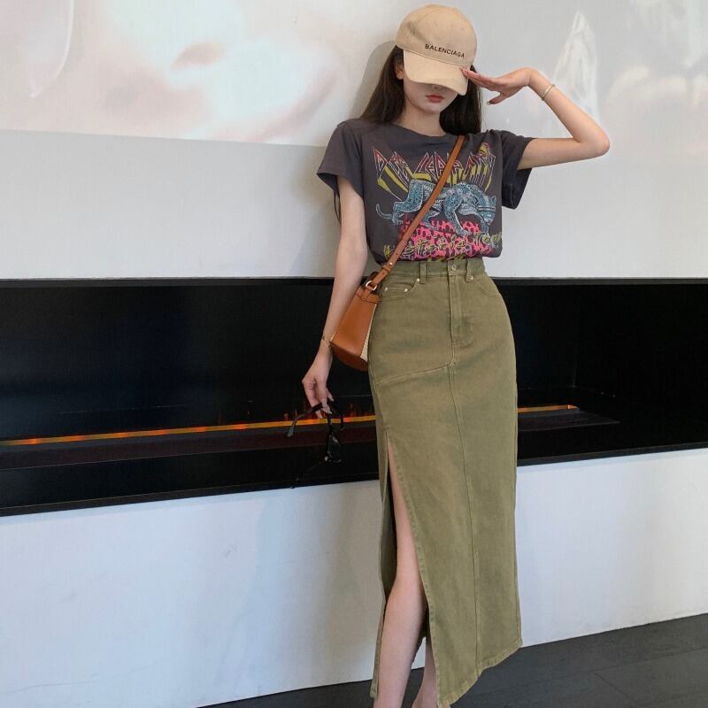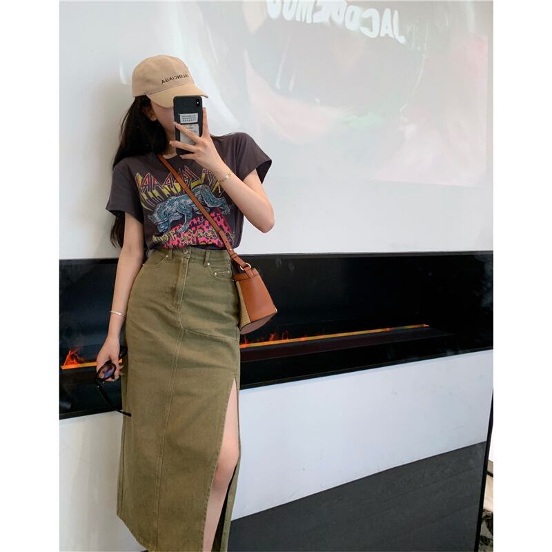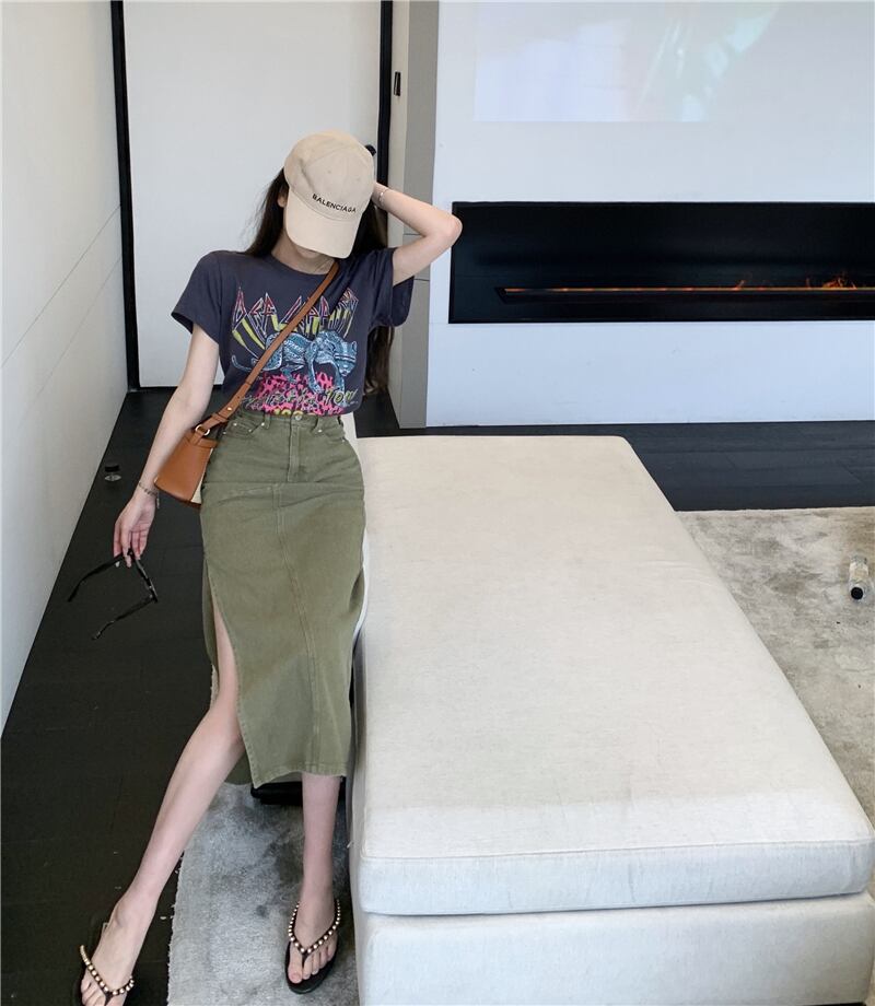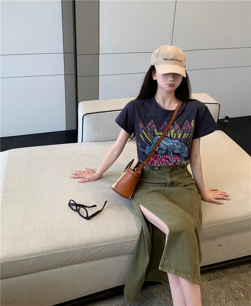 サマースタンダードラウンドネックTシャツ グリーンスカート レトロ 夏物 Oネック YY-ファッション86896480947