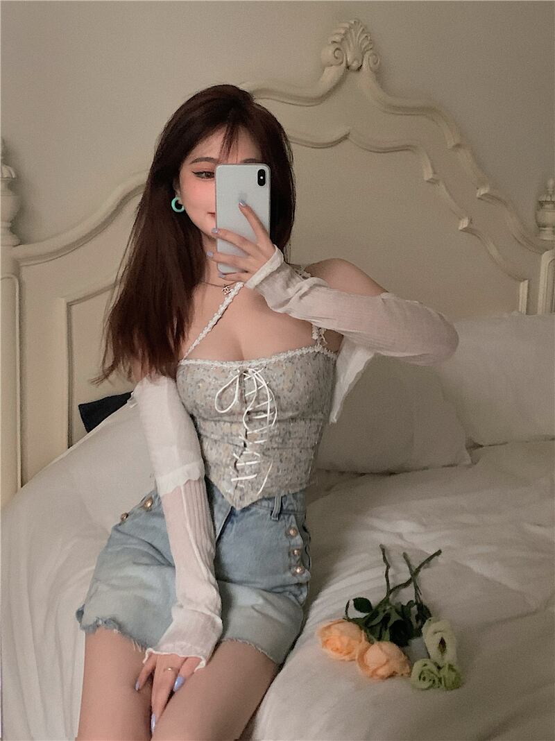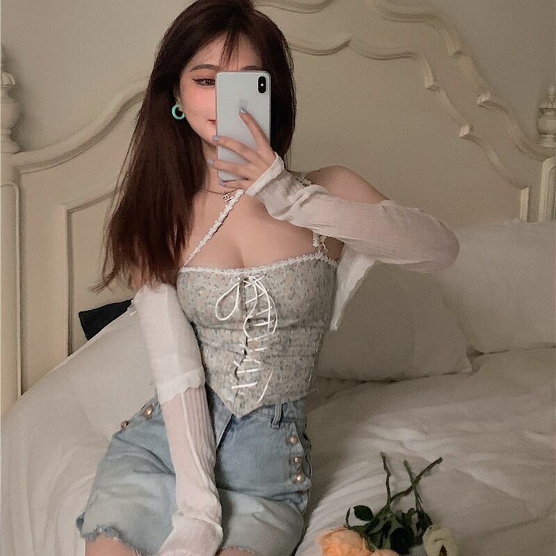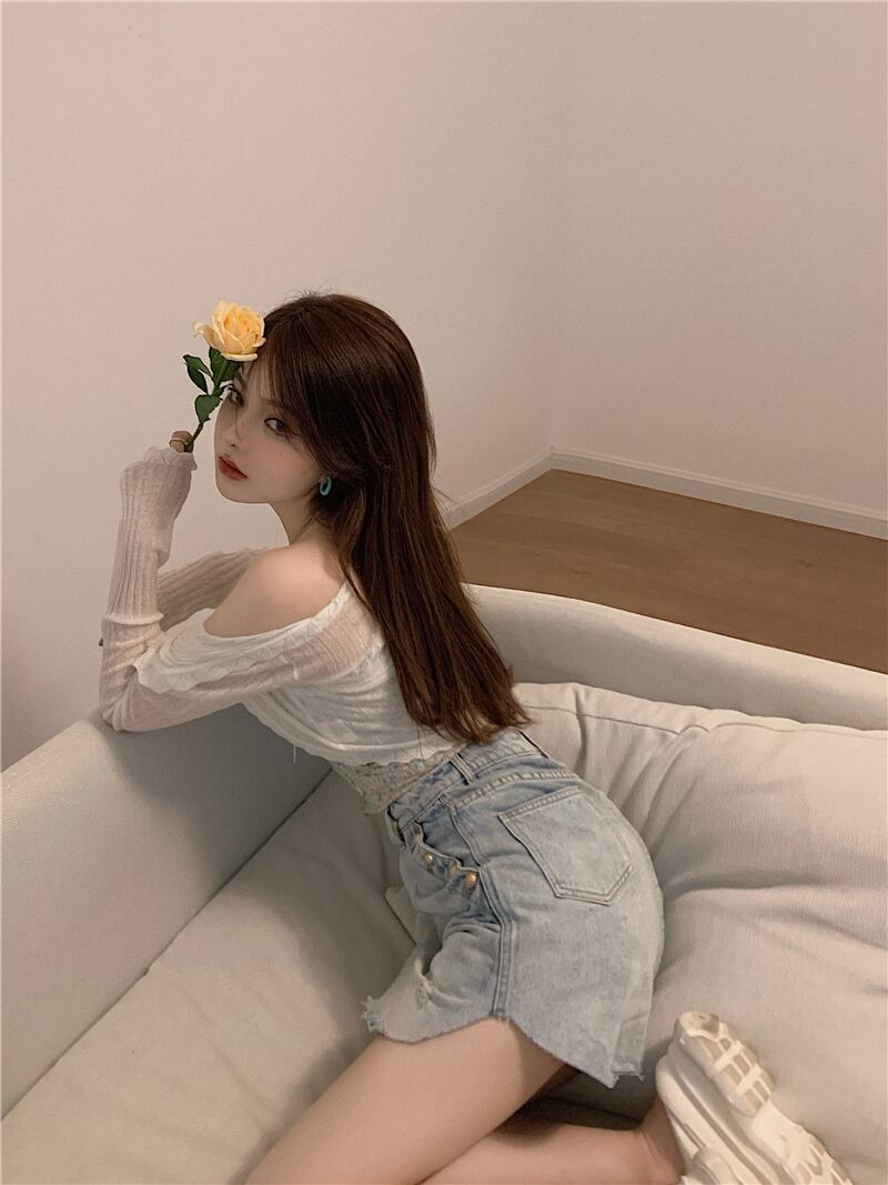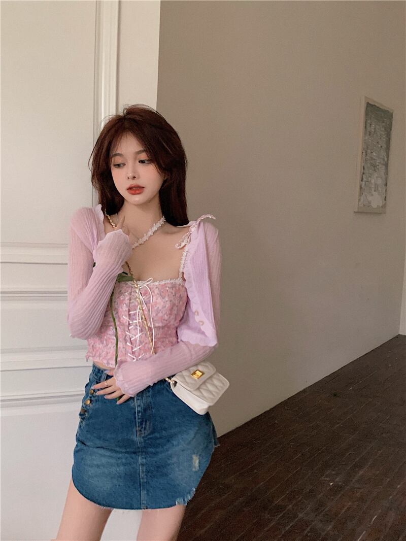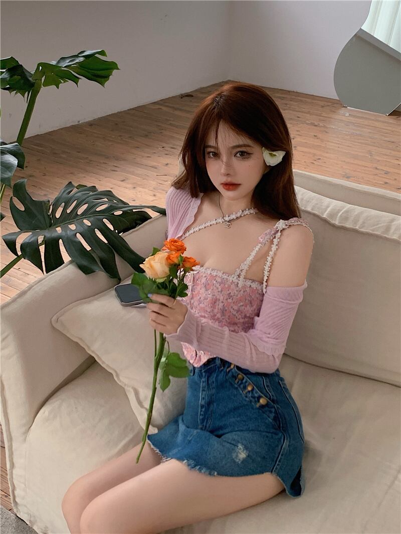 色:ホワイトセーターカーディガンフリーサイズ,ピンクセーターカーディガンフリーサイズ,ホワイトサスペンダー,ピンクのサスペンダー,ダークブルーのジーンズスカート,ライトブルージーンズスカート