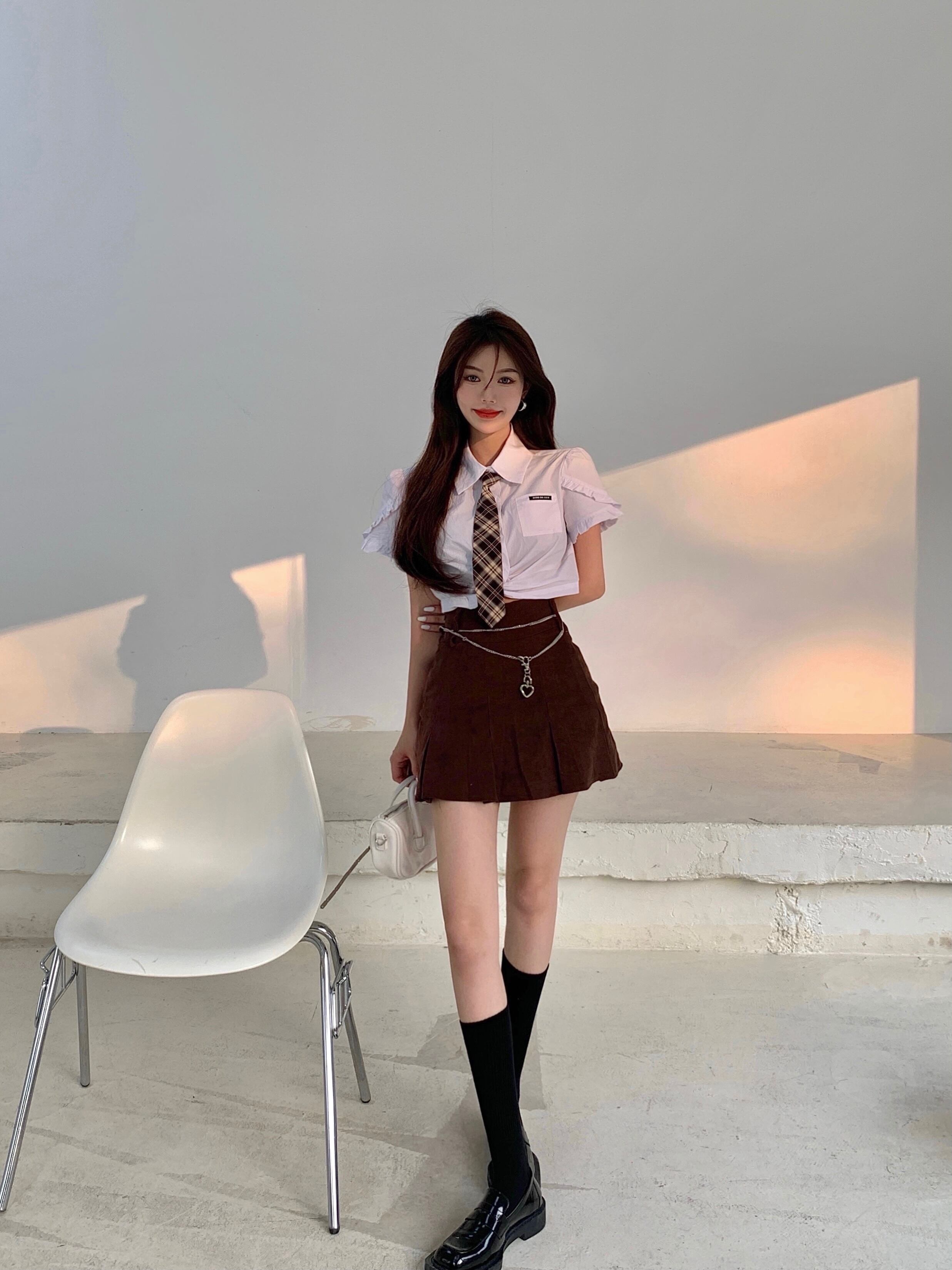 色:ベルト付きコーヒーカラースカート,ネクタイ付きシャツ