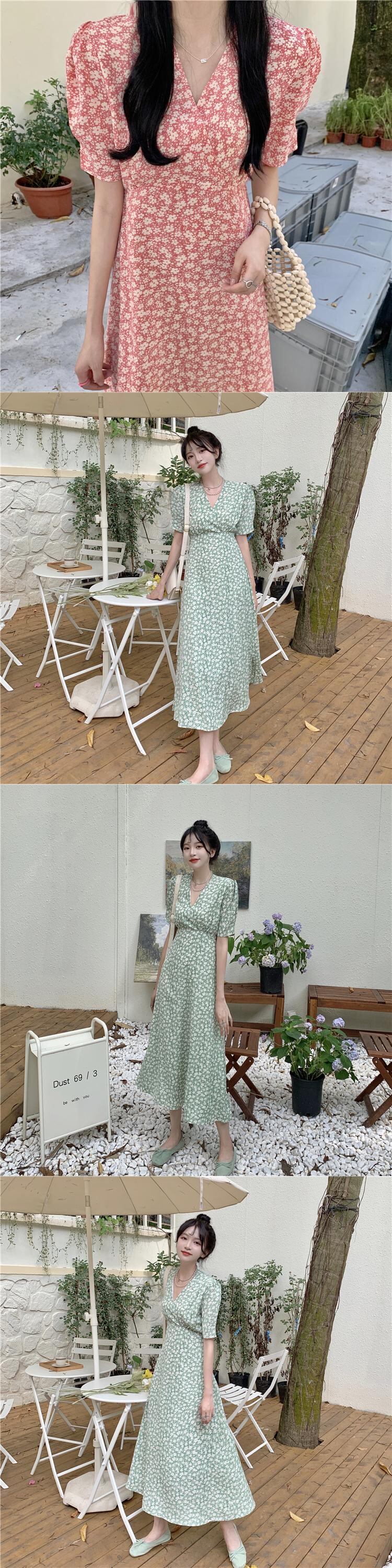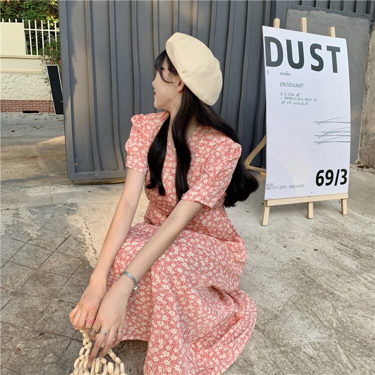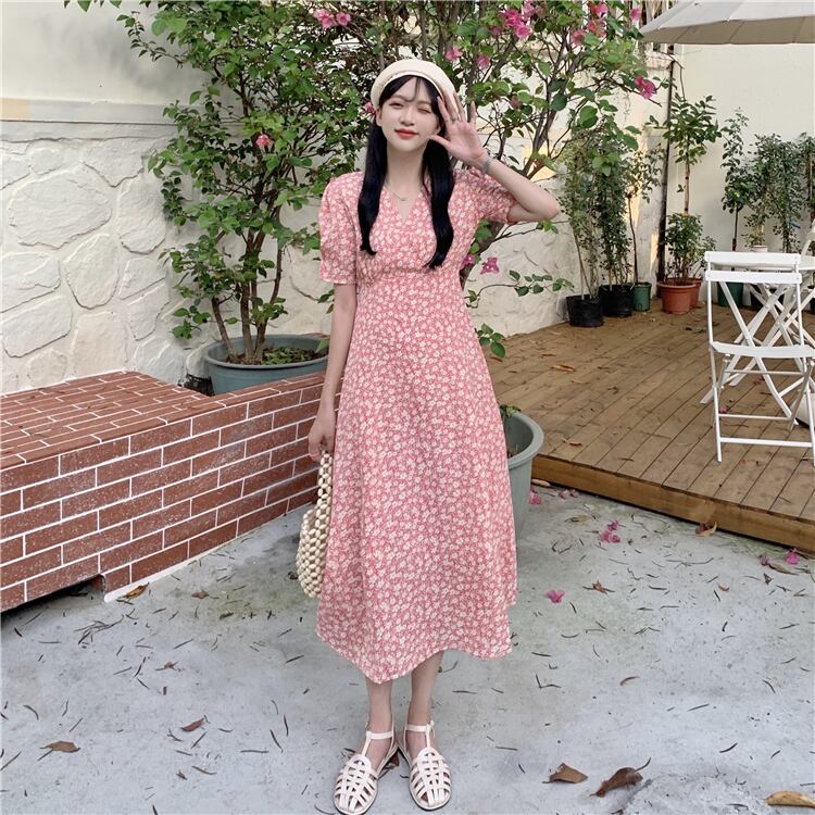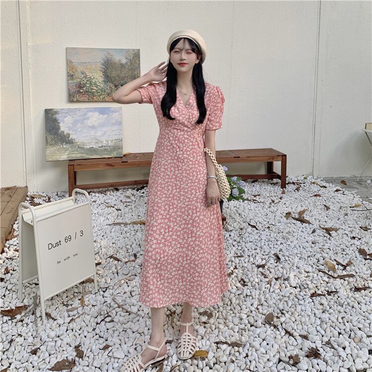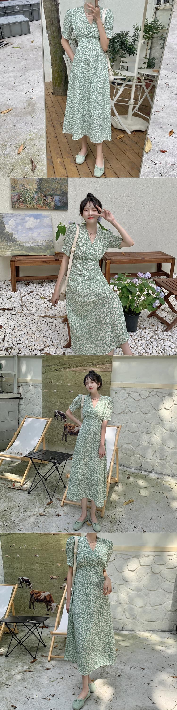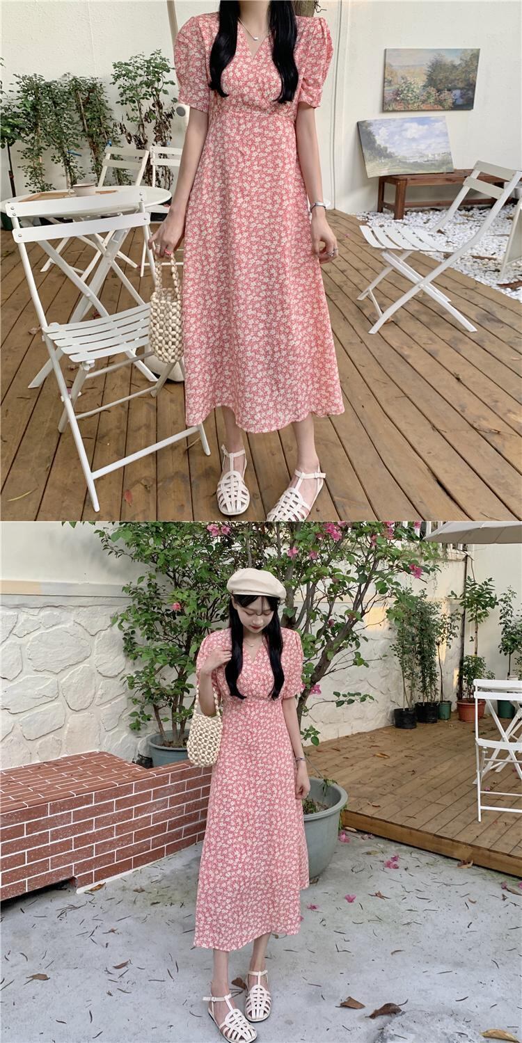 Vネックシフォンフローラルドレス サマースタイルウェストロングスカート 夏物 花柄 YY-ファッション44346876023