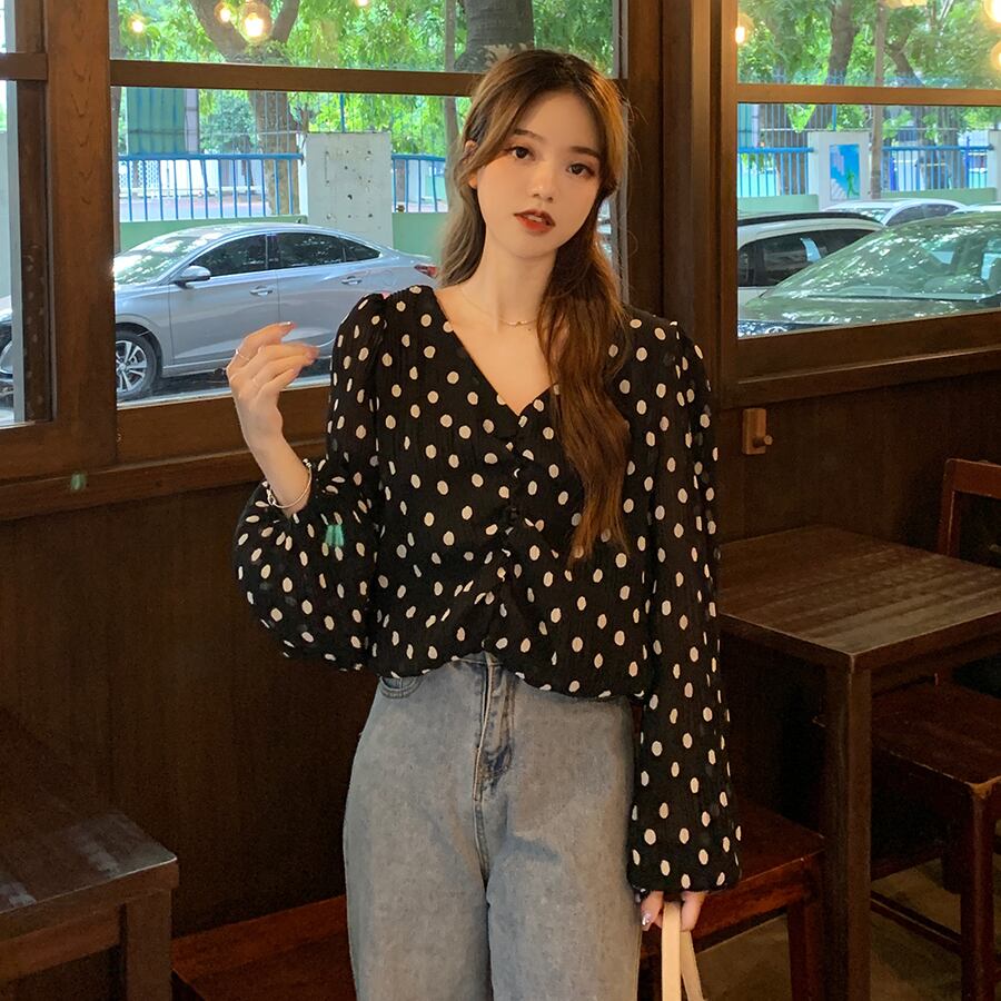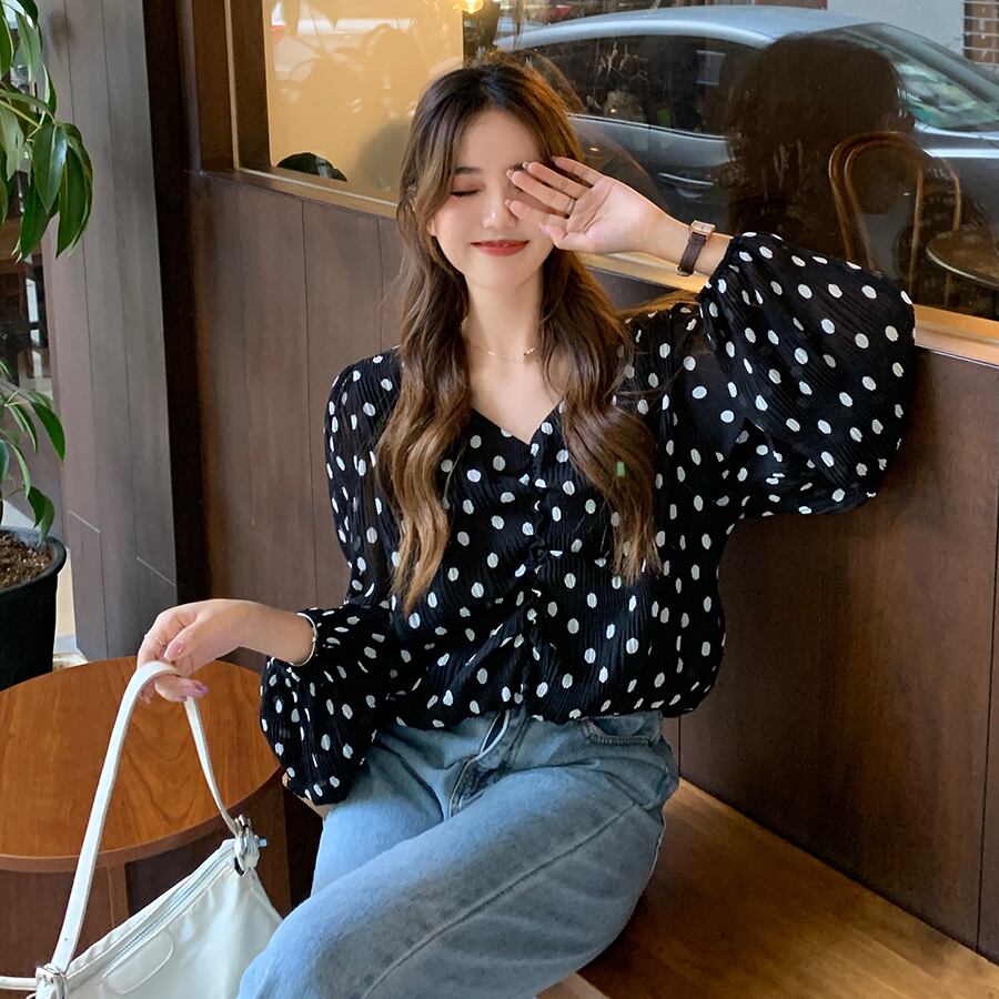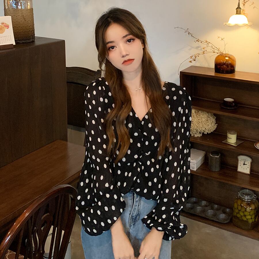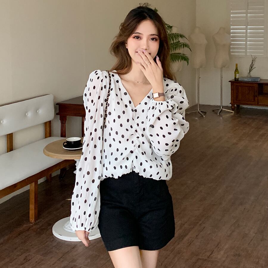 水玉シフォンシャツ サマーVネック薄手トップス ロング 夏物 YY-ファッション7144341485