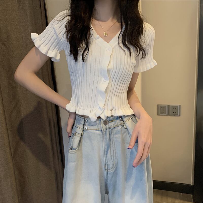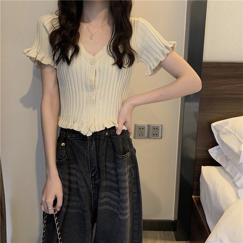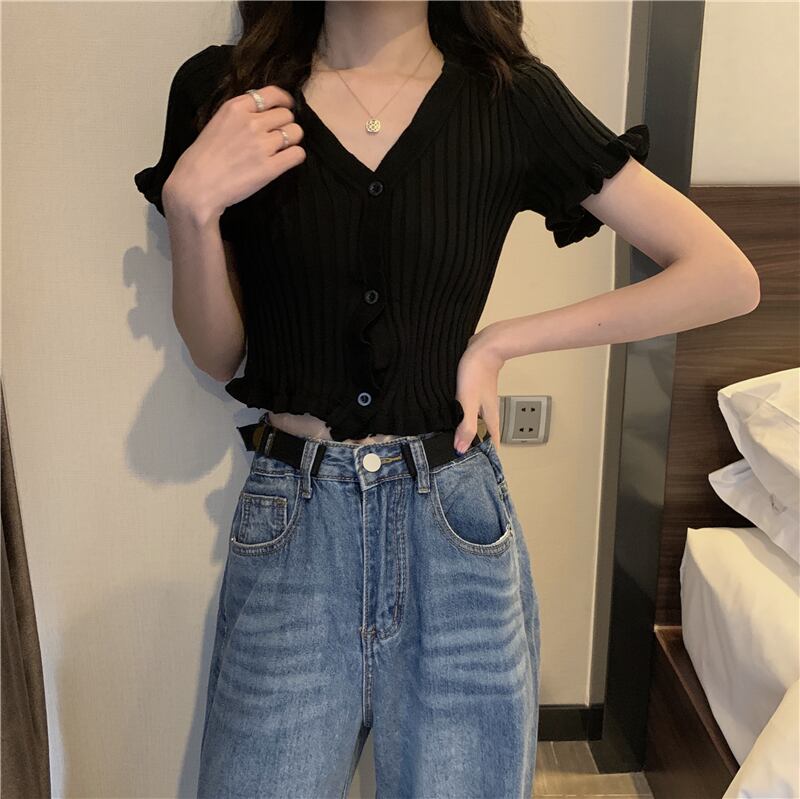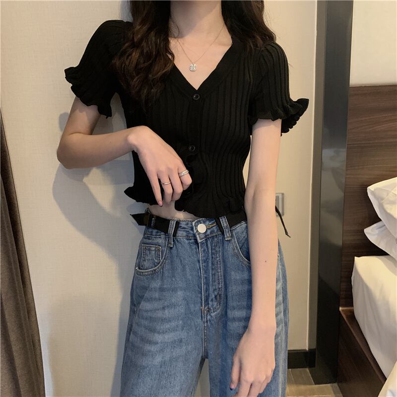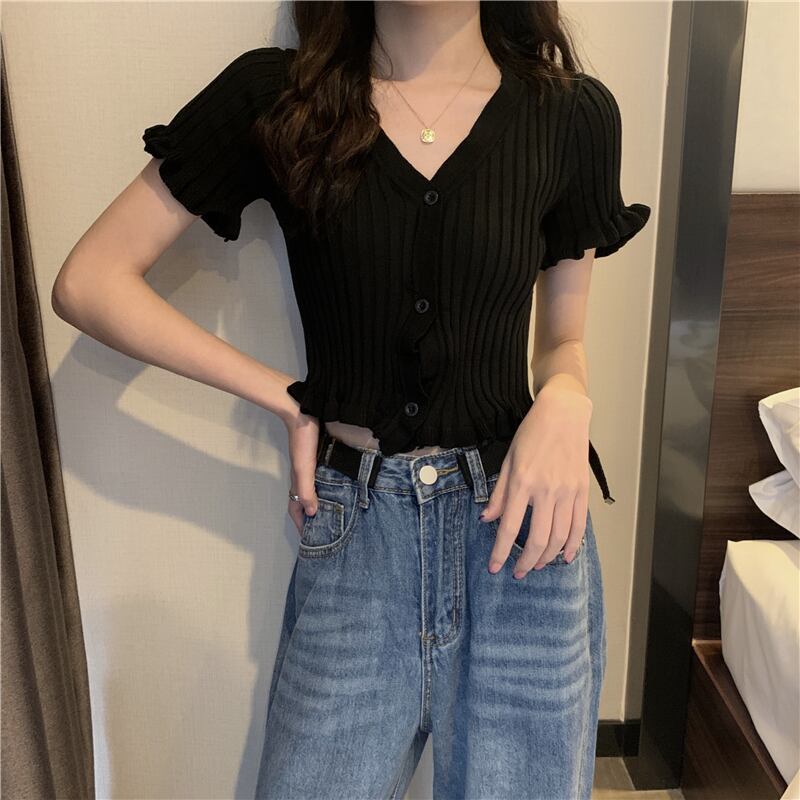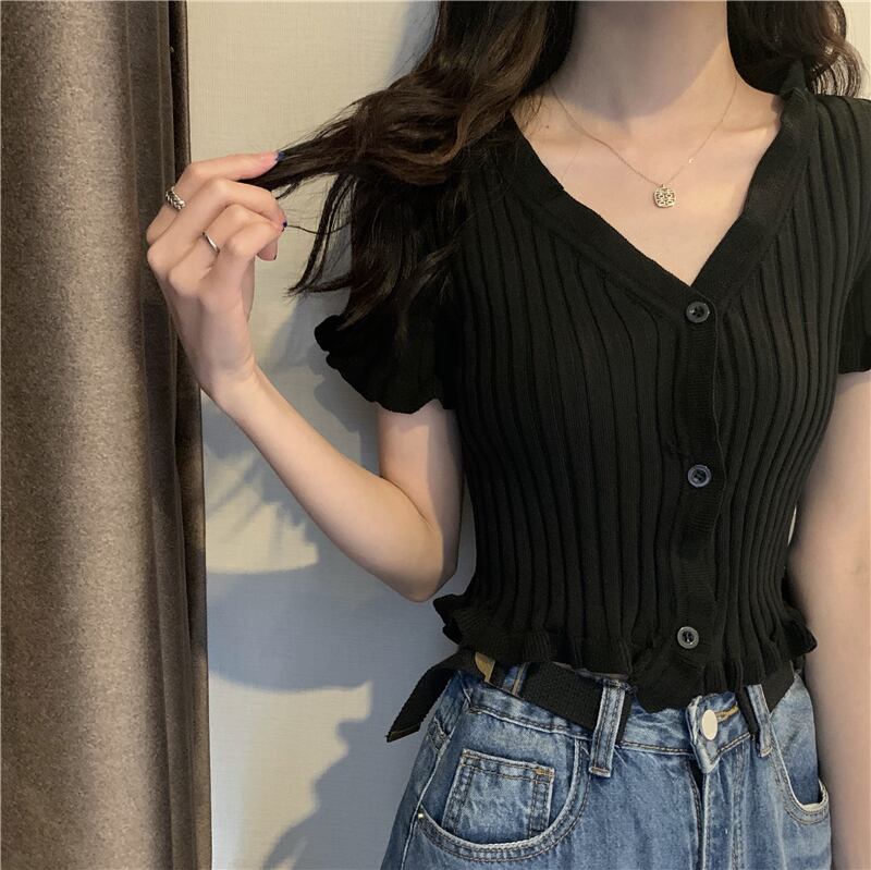 薄手ニットカーディガンサマーVネックショートトップス スリムブラックTシャツ 夏物 YY-ファッション9740737483
