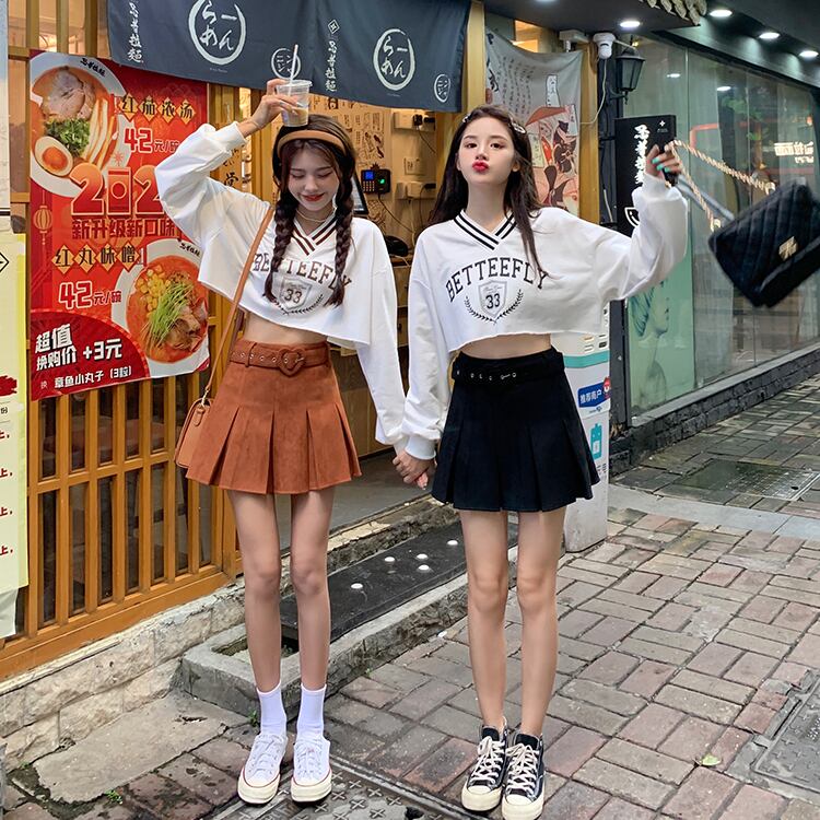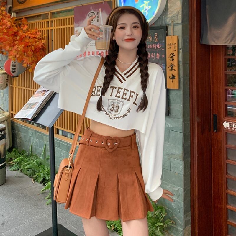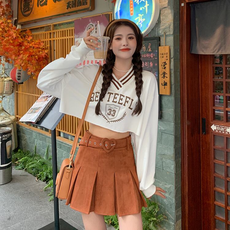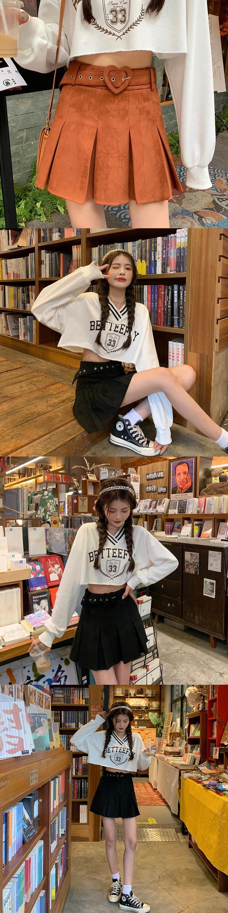 色:コーヒーカラープリントスウェットシャツ,ブラックプリントセーター,コーヒーカラーのスカート+ベルト,黒スカート+ベルト