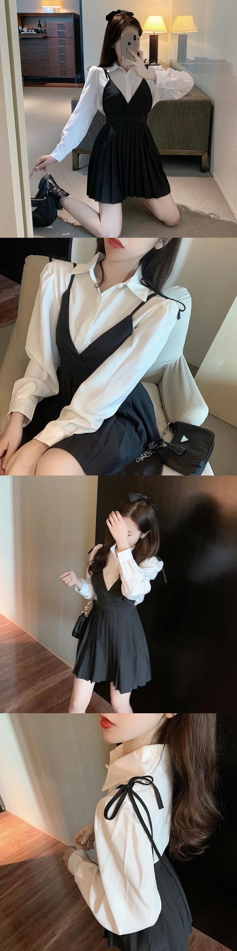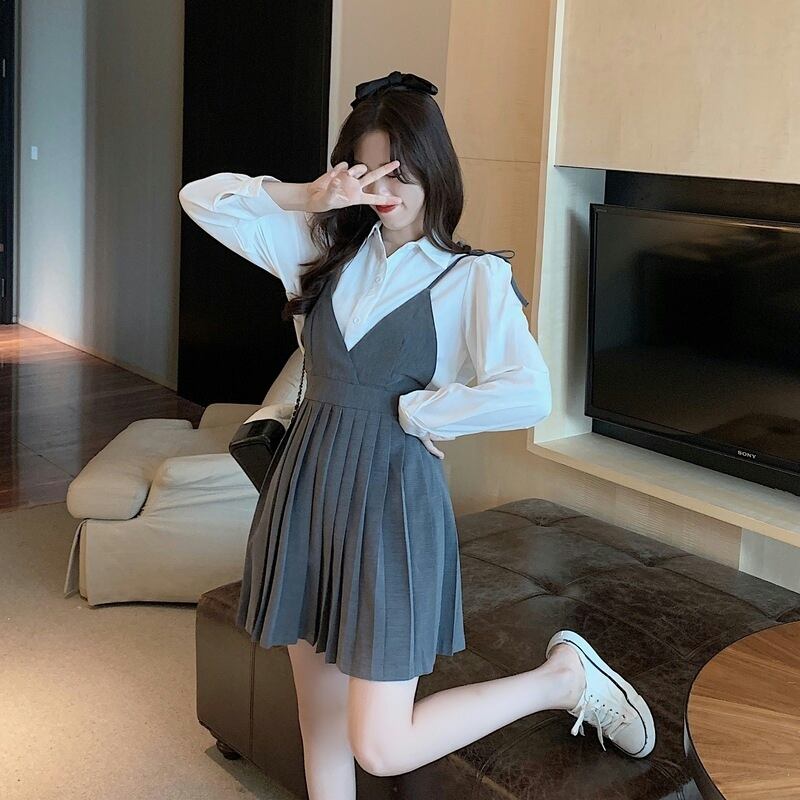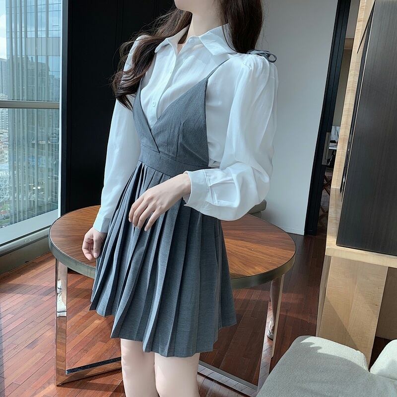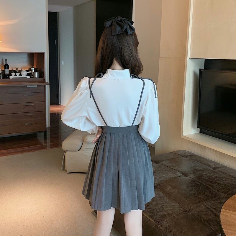 色:白のシャツ,グレーのドレス,ブラックサスペンダースカート