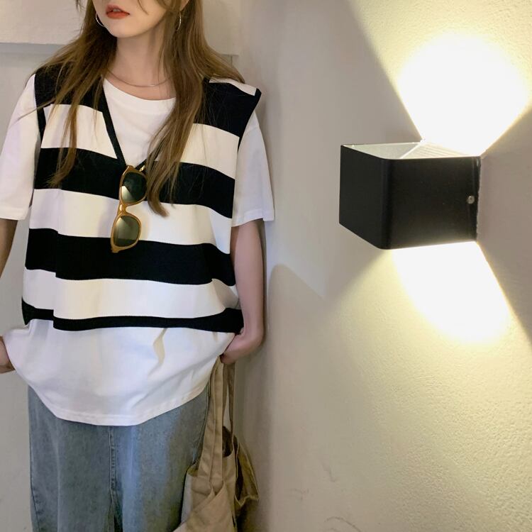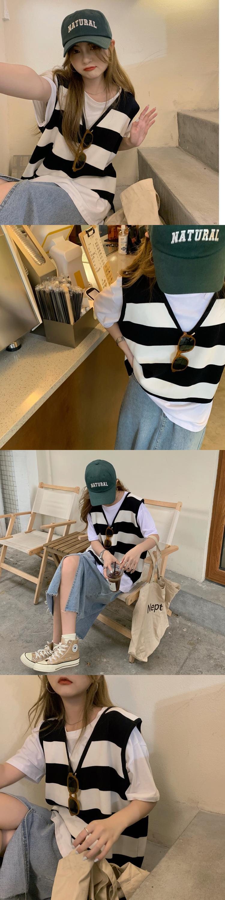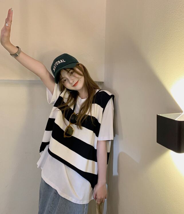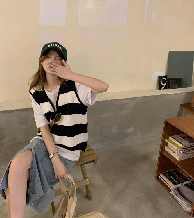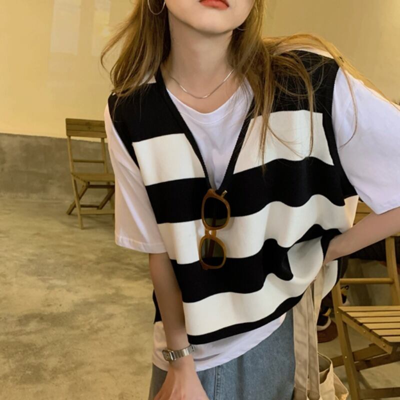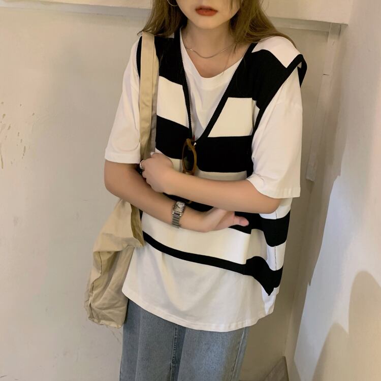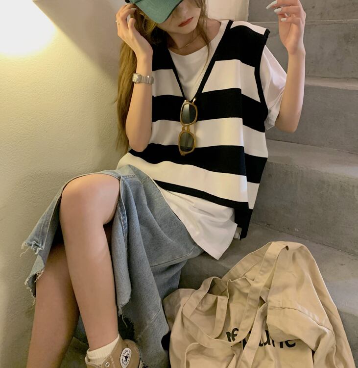 ブラックホワイトストライプルーズVネックブラウス サマーニットレディース 夏物 YY-ファッション81651123015