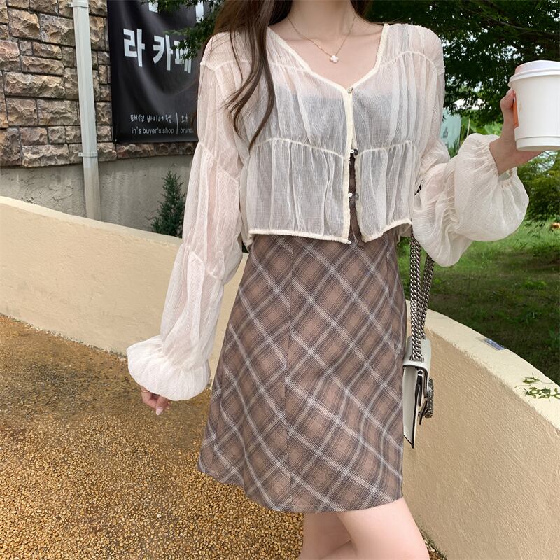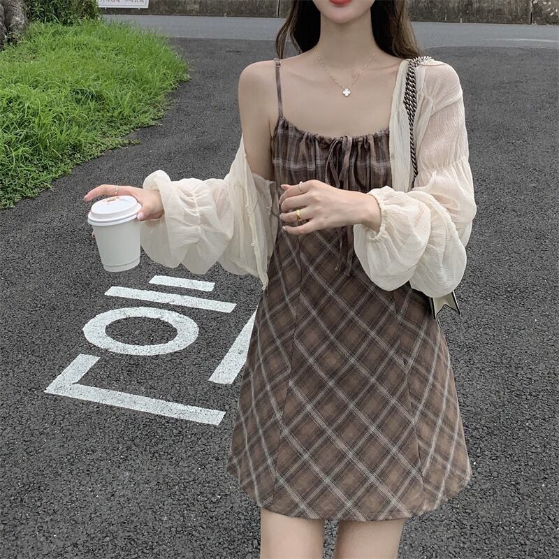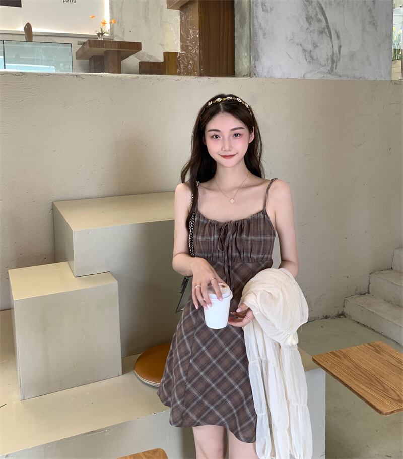 色:アプリコットカーディガン,コーヒーカラーのチェック柄サスペンダースカート