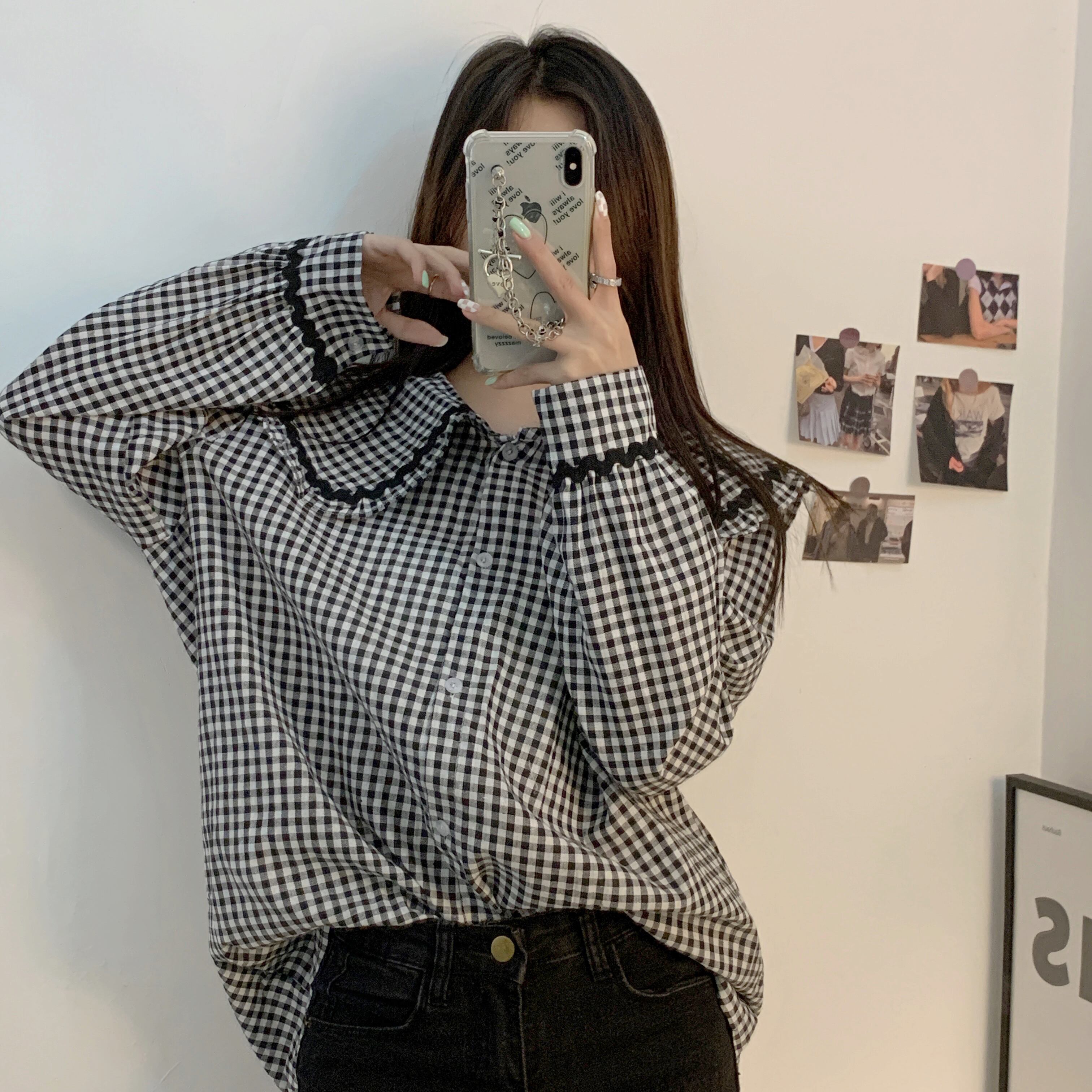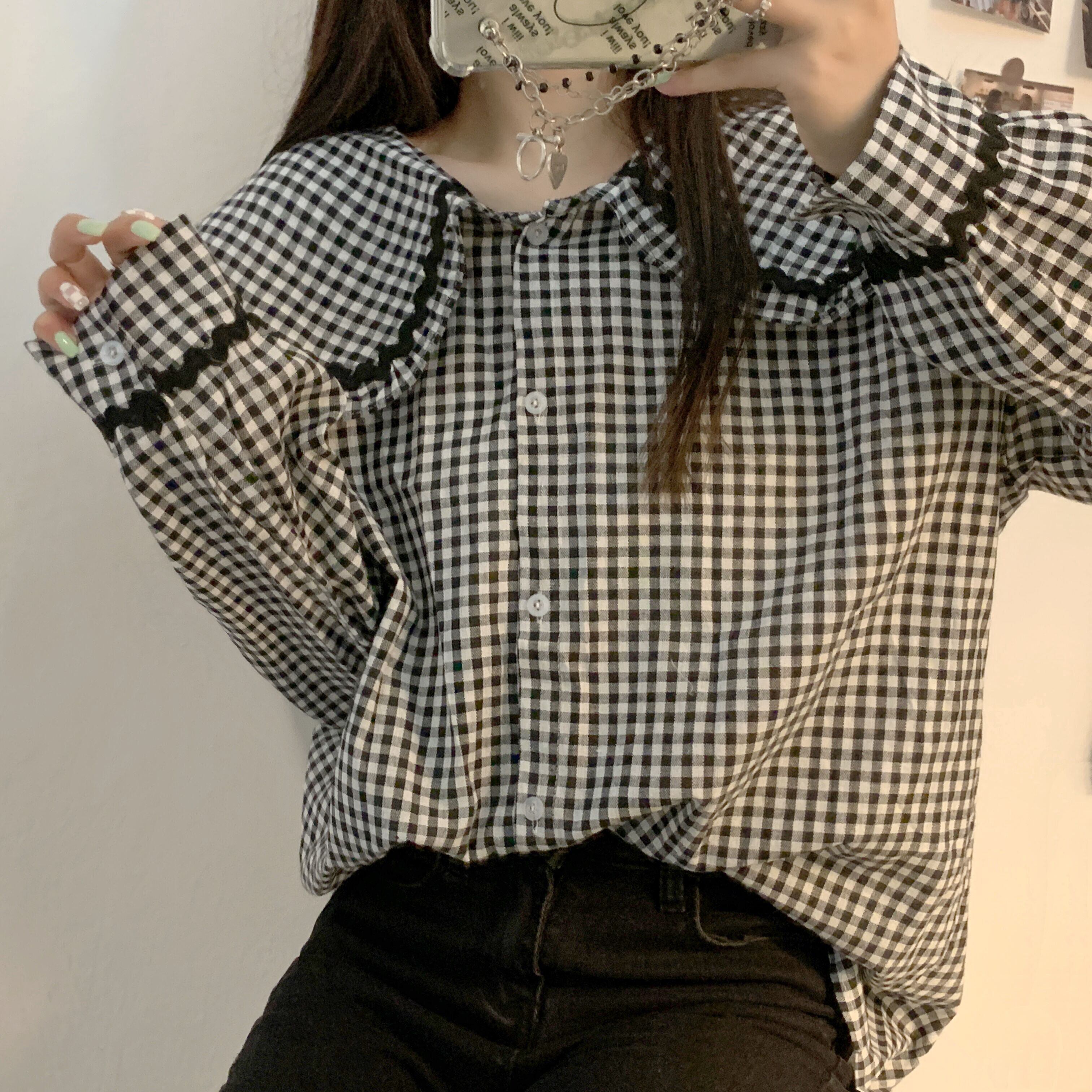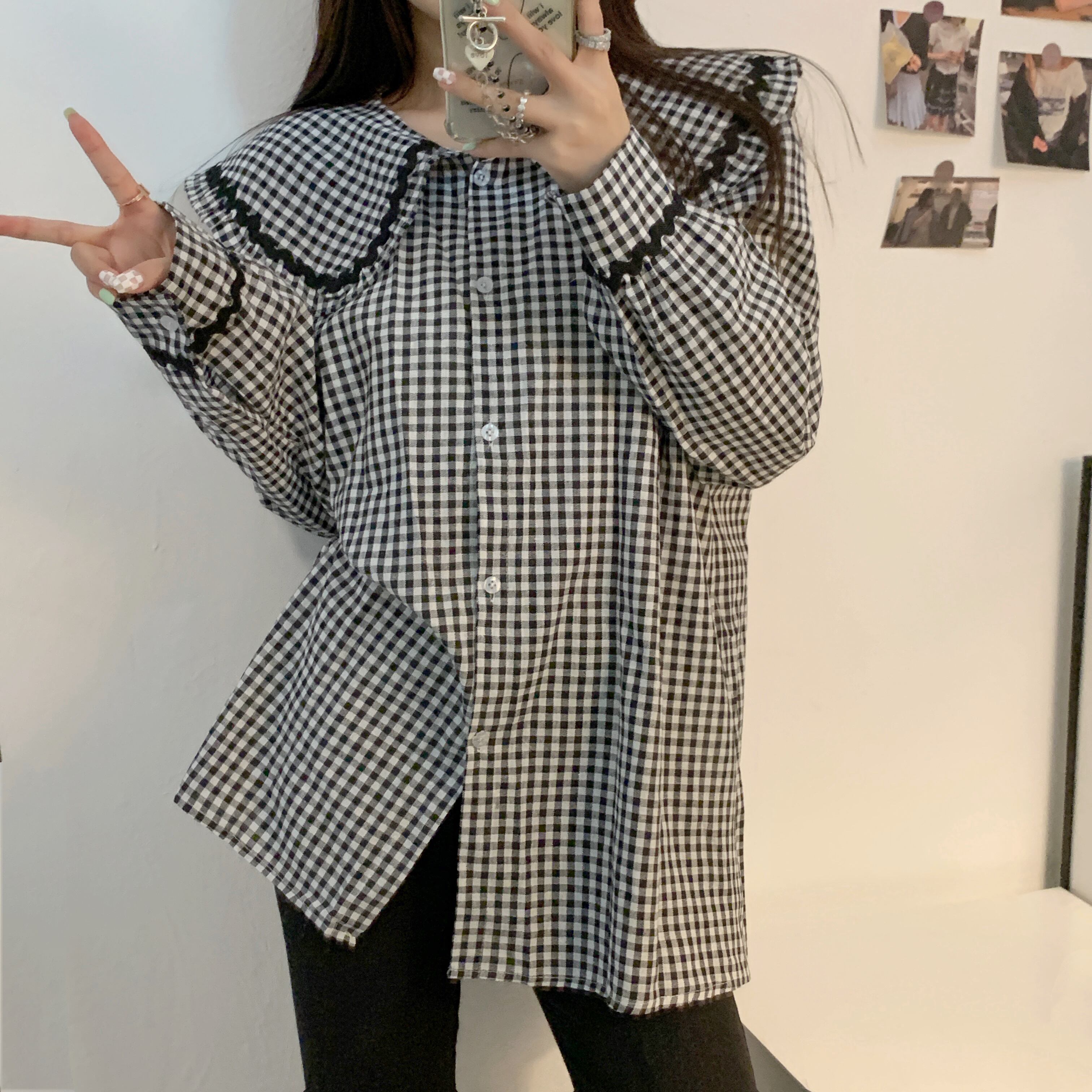 サマーラッフルカラー格子柄ソリッド 長袖スリーブルーズシャツ トップス ロング 夏物 ソリッドカラー YY-ファッション81118761682