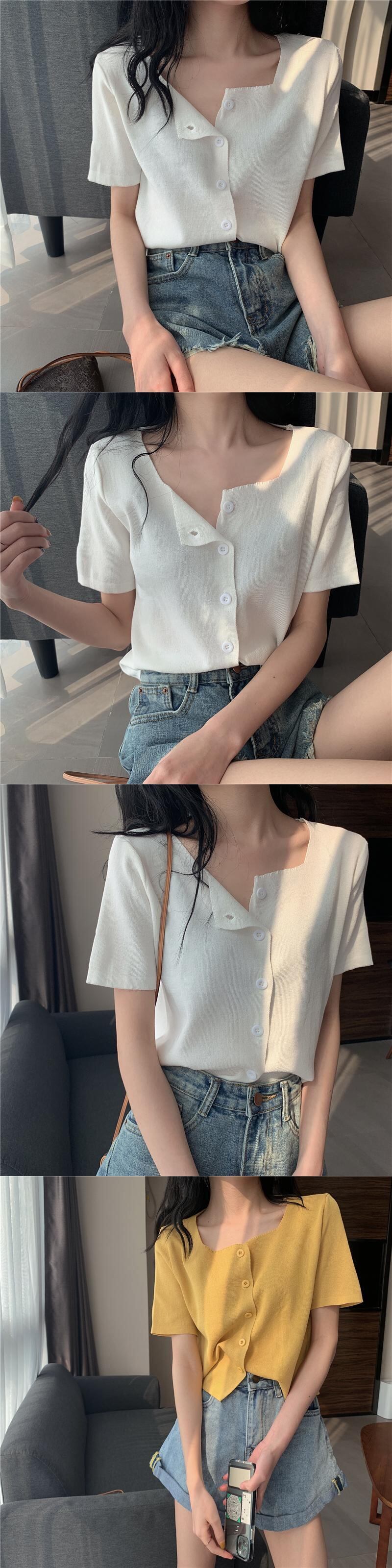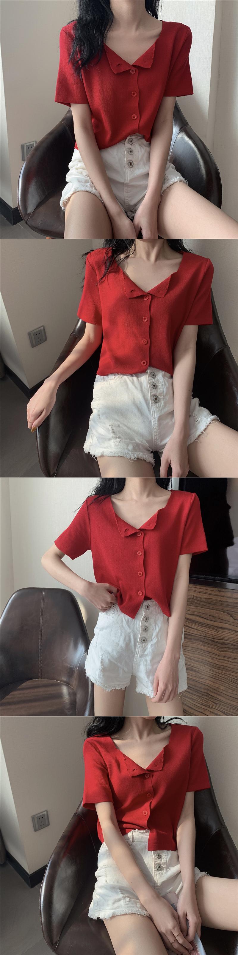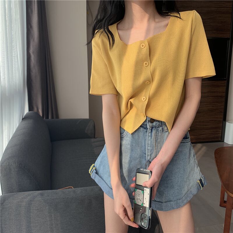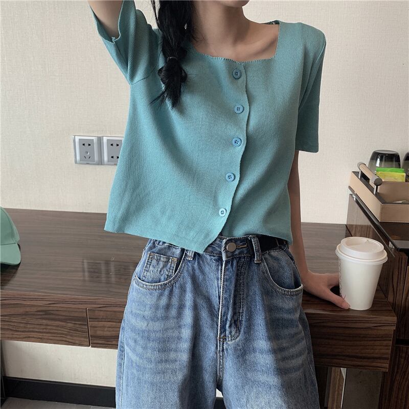 スタイルトップス サマーニットセーター カラー薄手シャツ 半袖スリーブTシャツ カーディガン ショート ハーフスリーブ 夏物 スクウェア YY-ファッション21668613977
