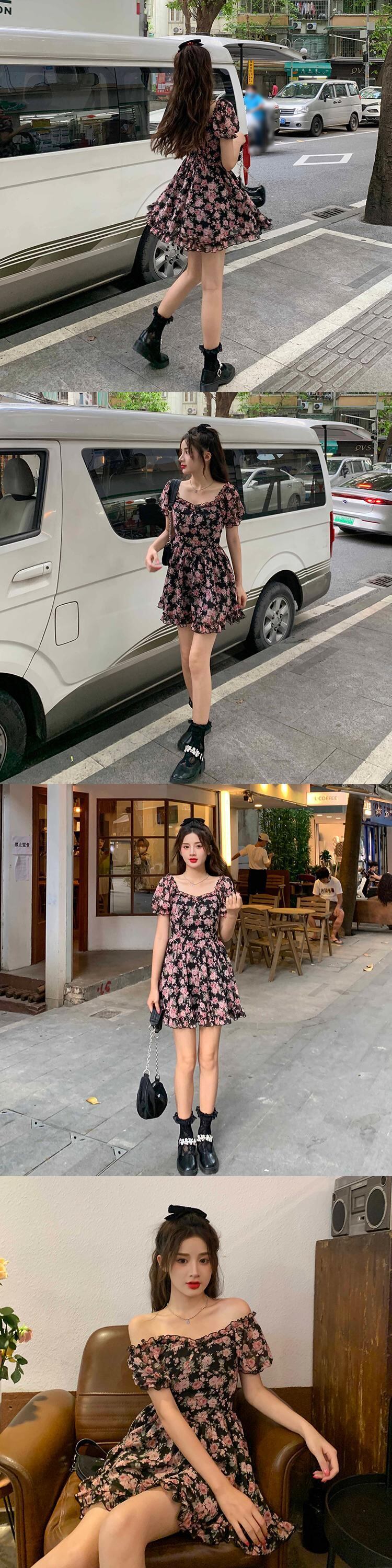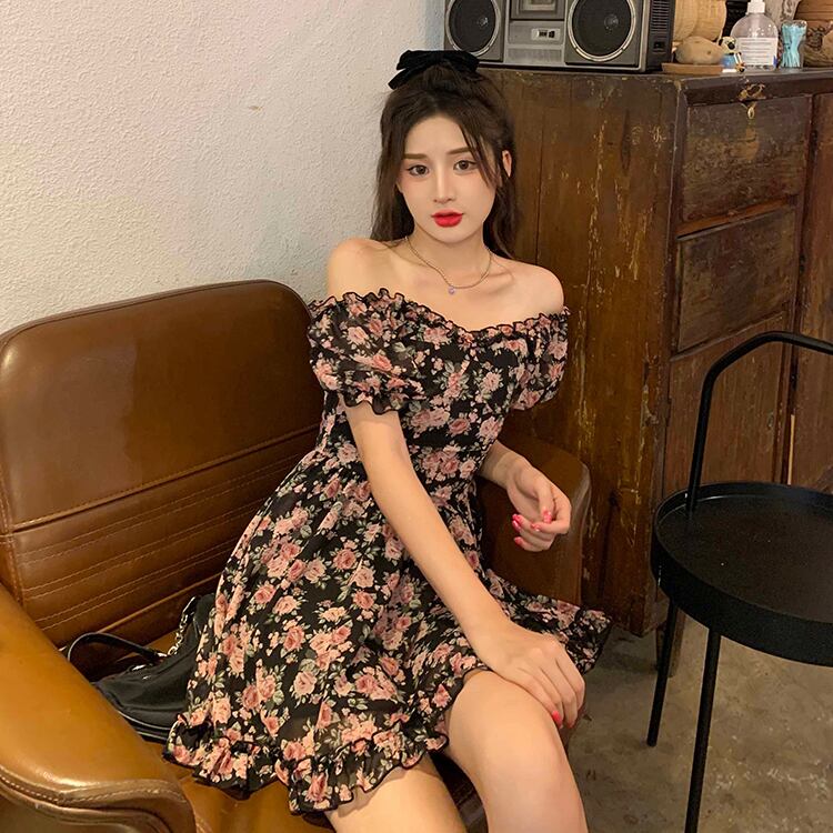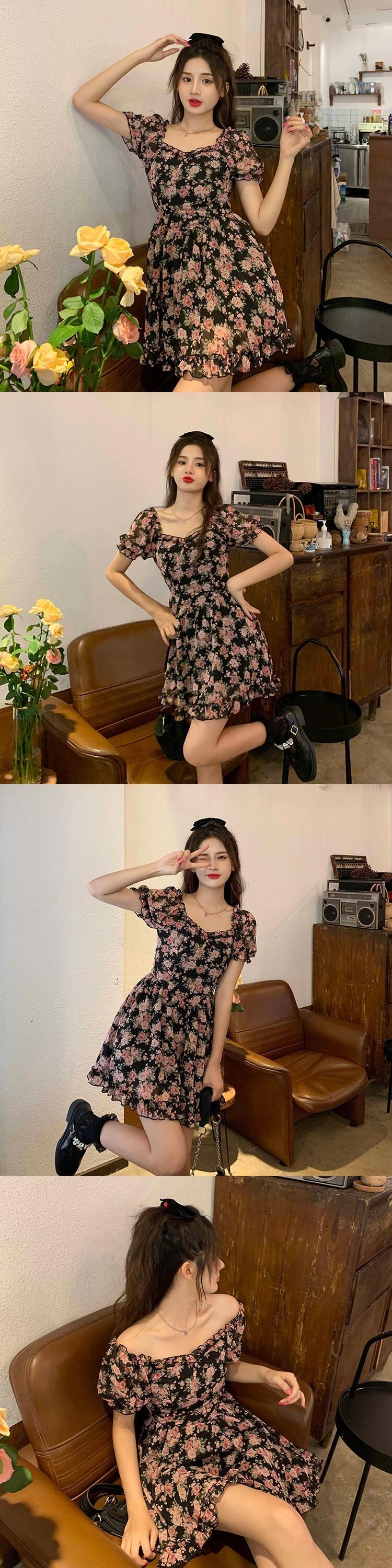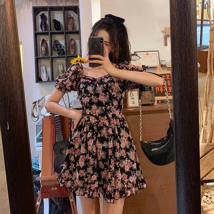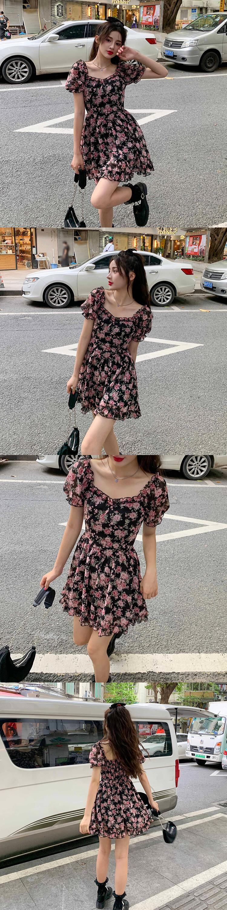 フローラルシフォンドレス サマースタンダードスリーブスカート レトロ 夏物 花柄 YY-ファッション88448052334