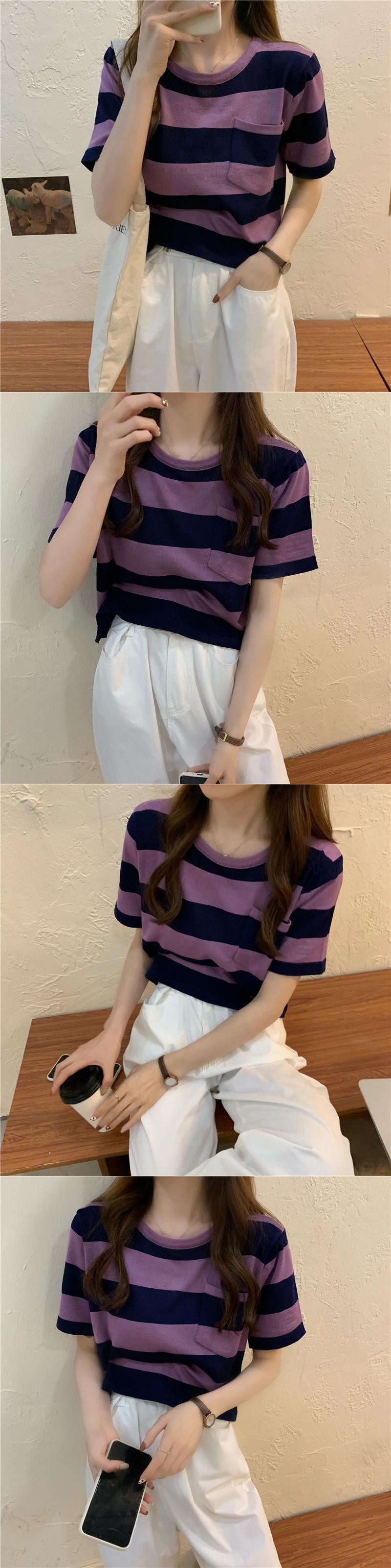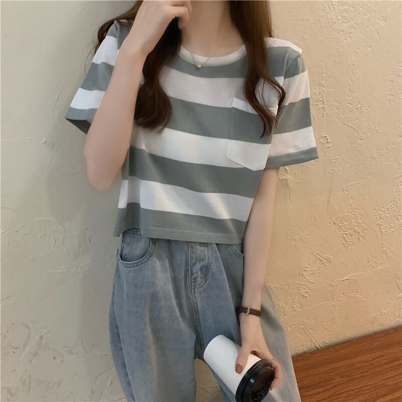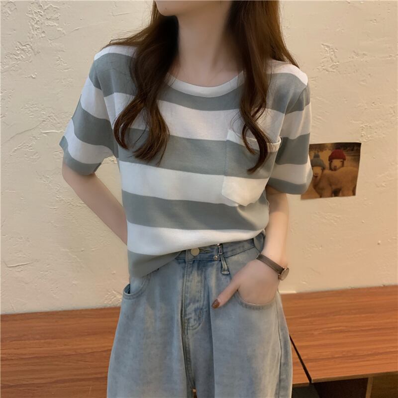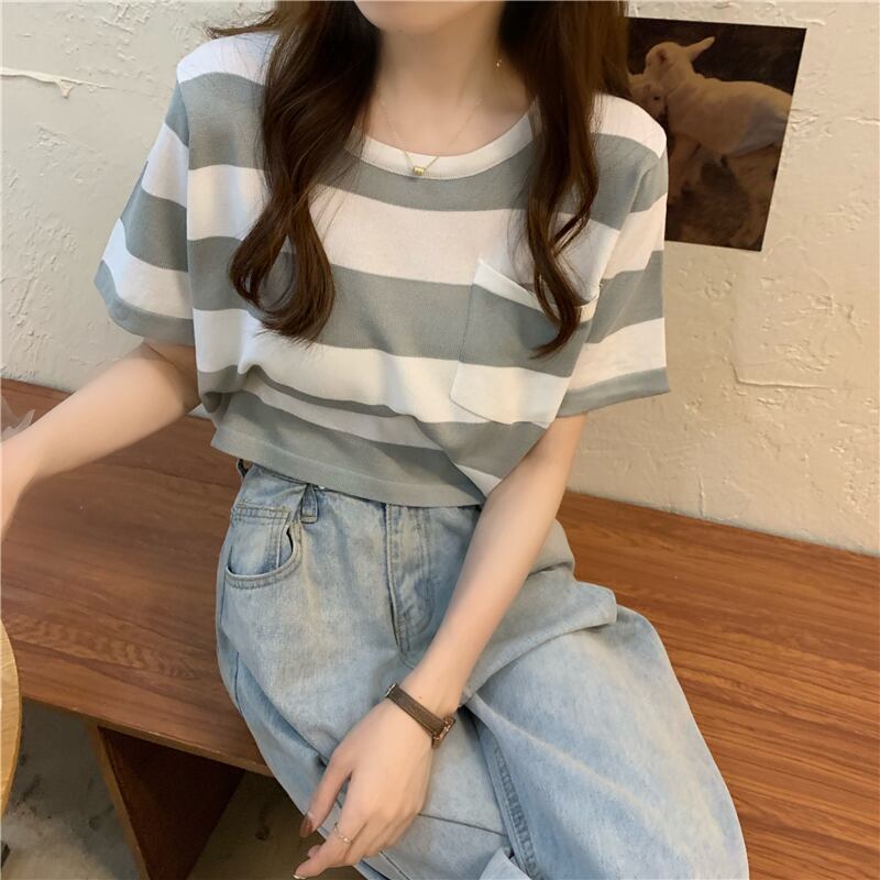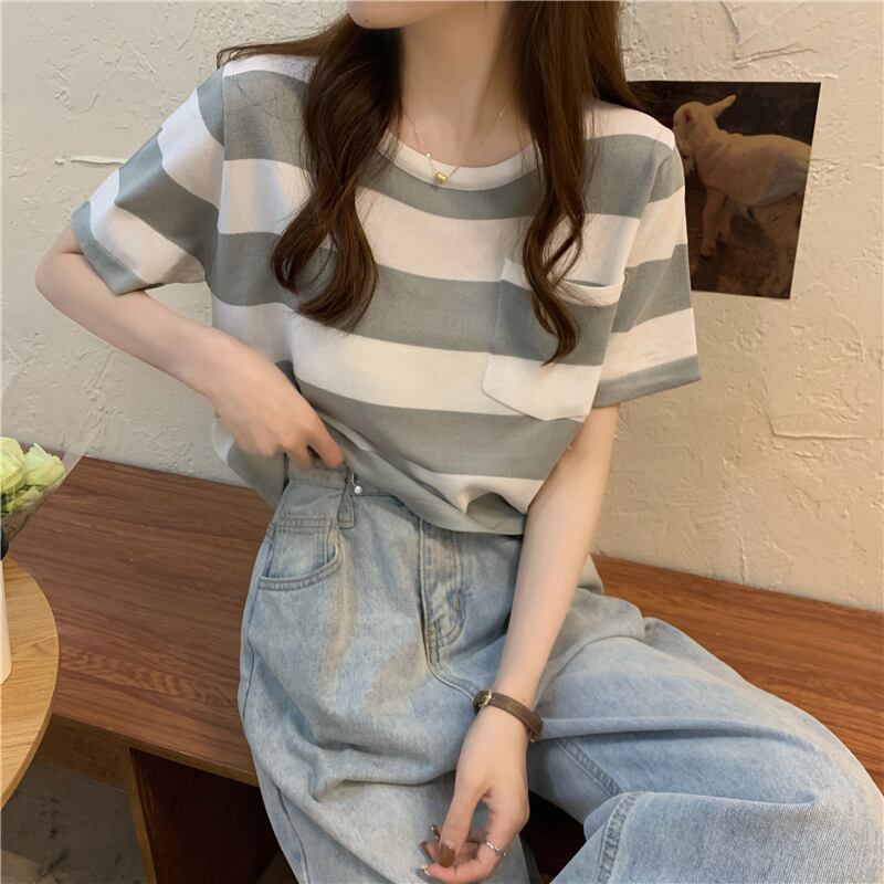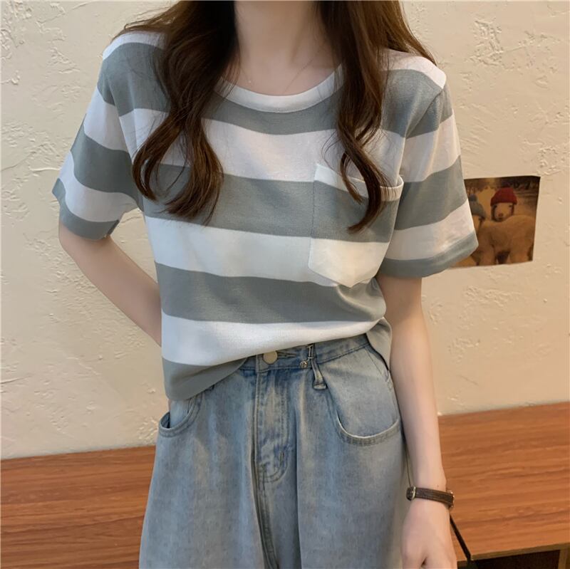 スタイルシャツ トップス スプリングサマールーズ薄手ストライプニットTシャツ 春物 夏物 YY-ファッション6241787906
