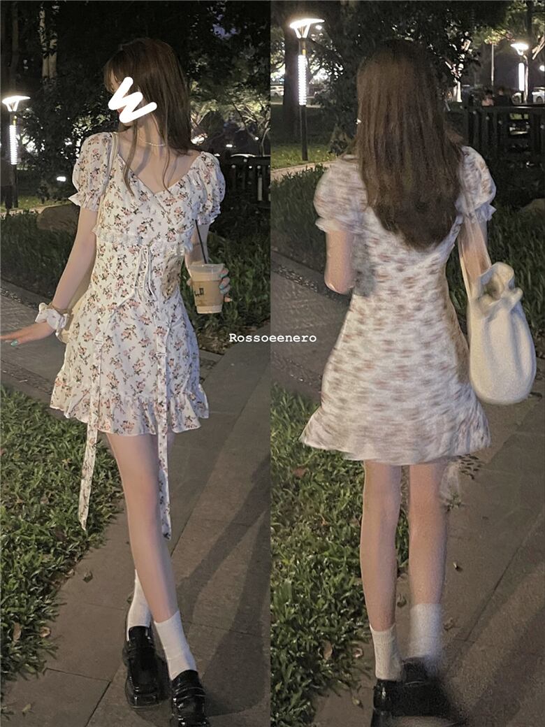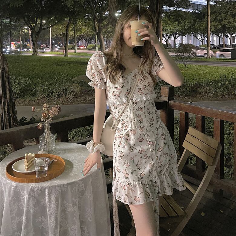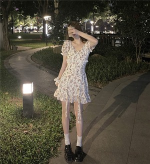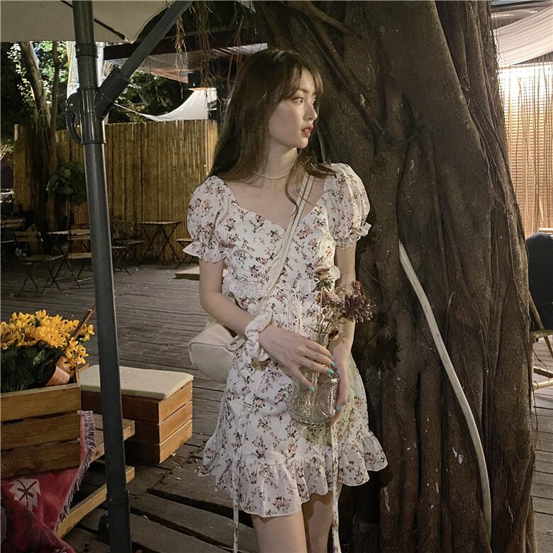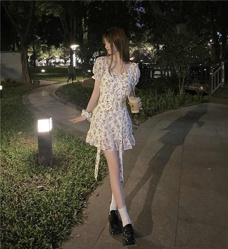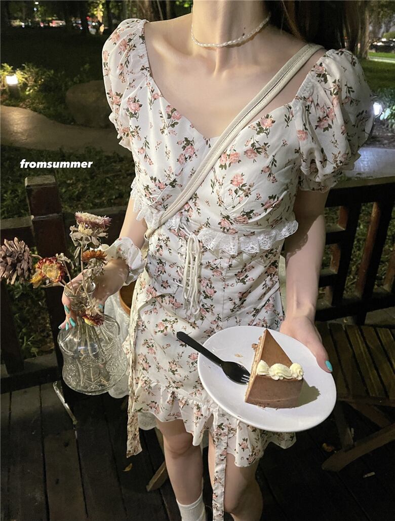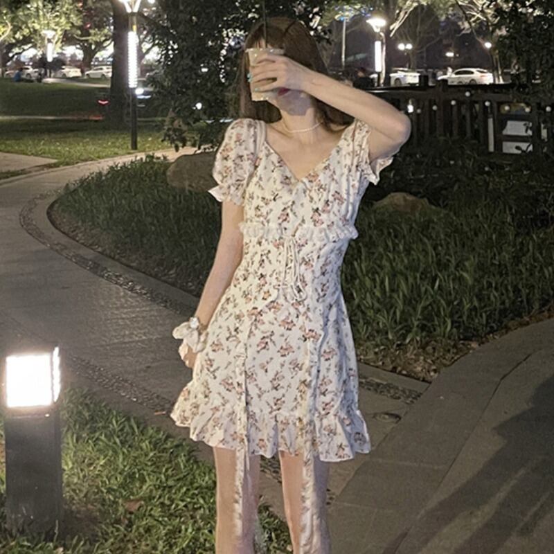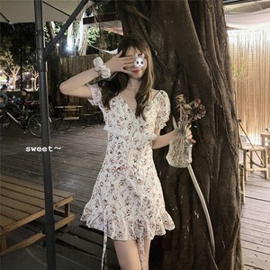 スタンダードVネックスリーブウェストドレス サマーショートフローラルスカート レトロ 夏物 花柄 YY-ファッション93349021503