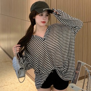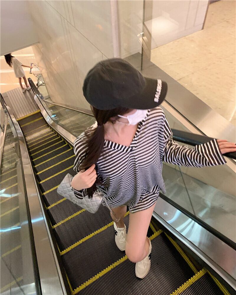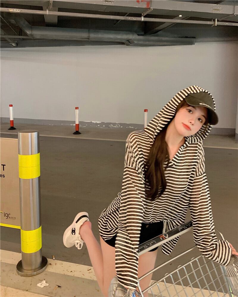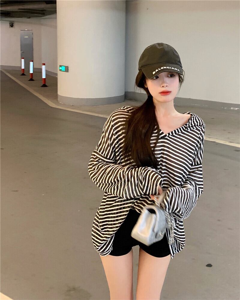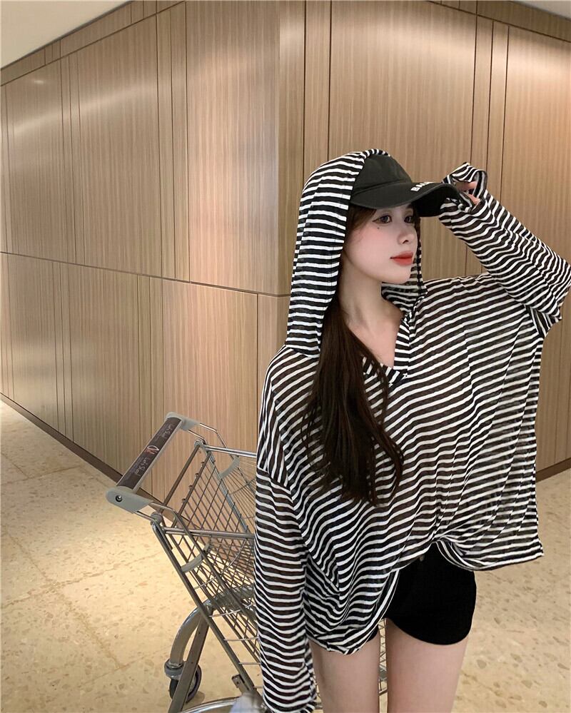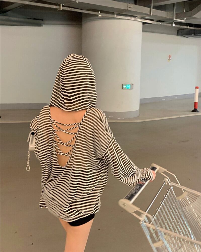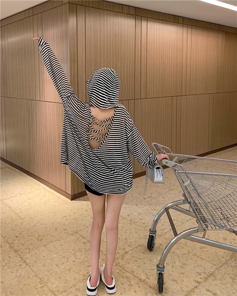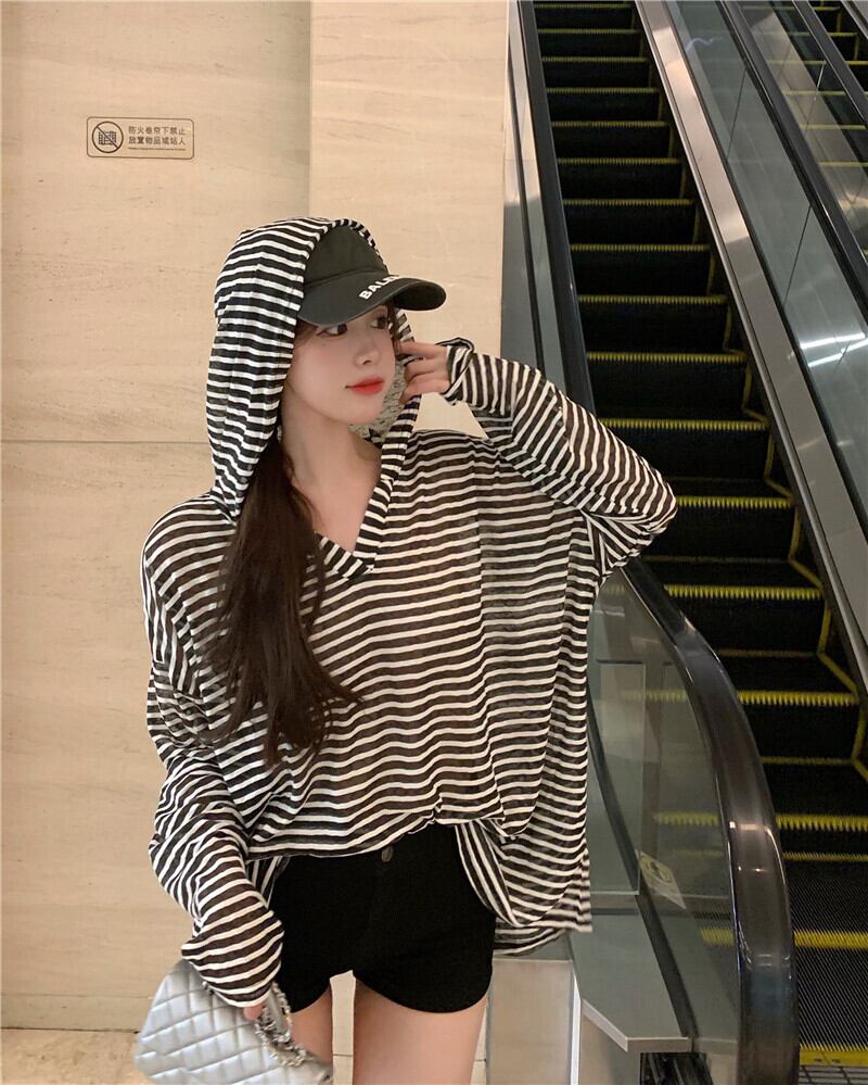 フードブラウス ストライプVネックTシャツ サマー薄手スタイルルーズバックトップス ロング 夏物 YY-ファッション51423690150