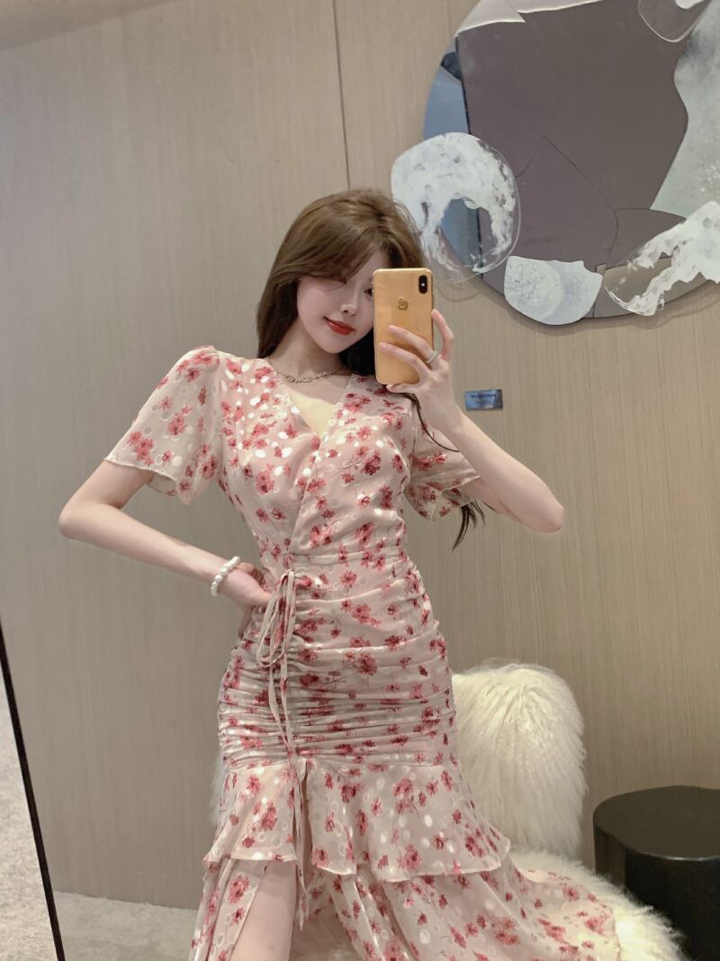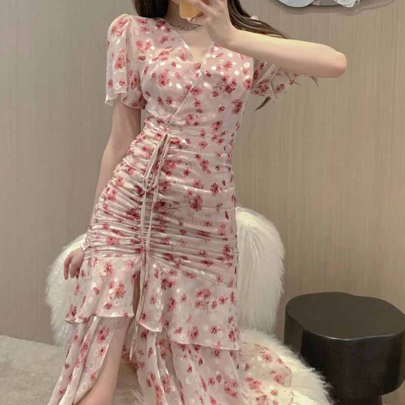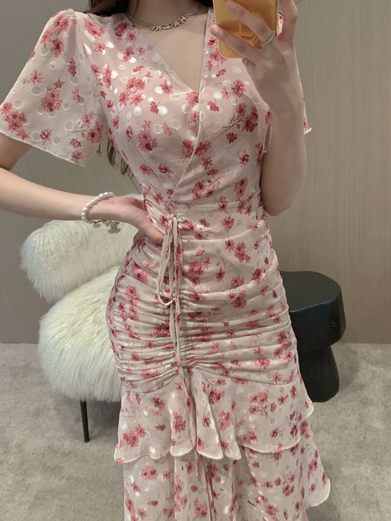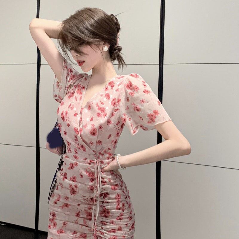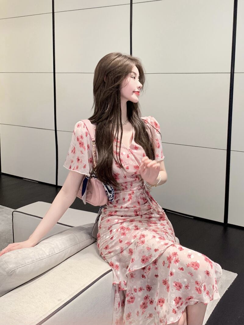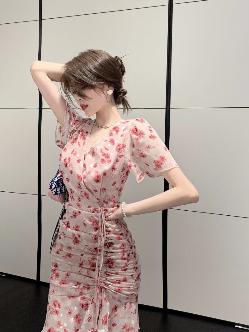 フローラルドレス スカート サマーVネック ピンク 夏物 花柄 ピュア YY-ファッション82013118056