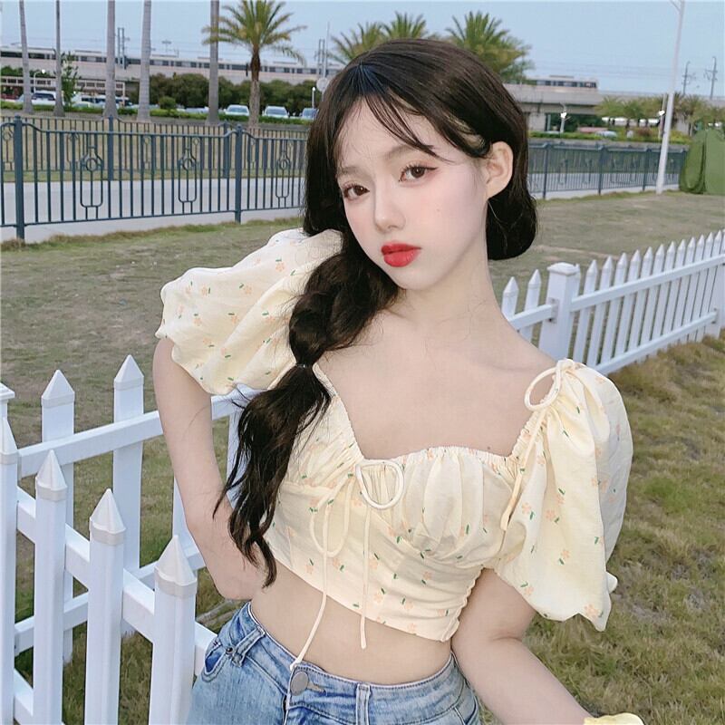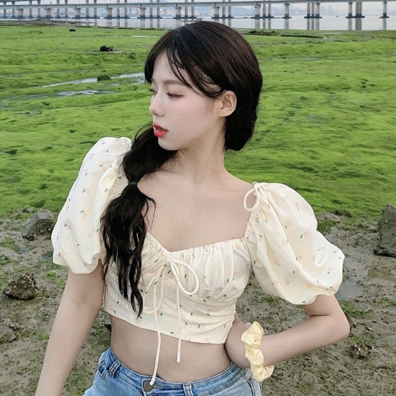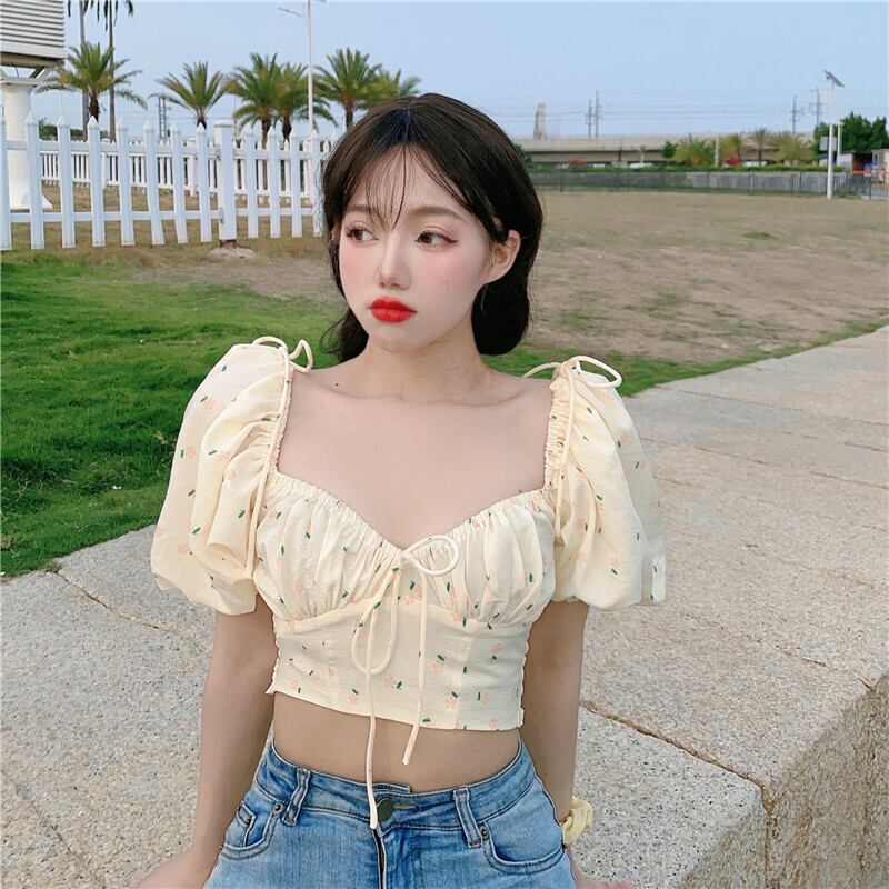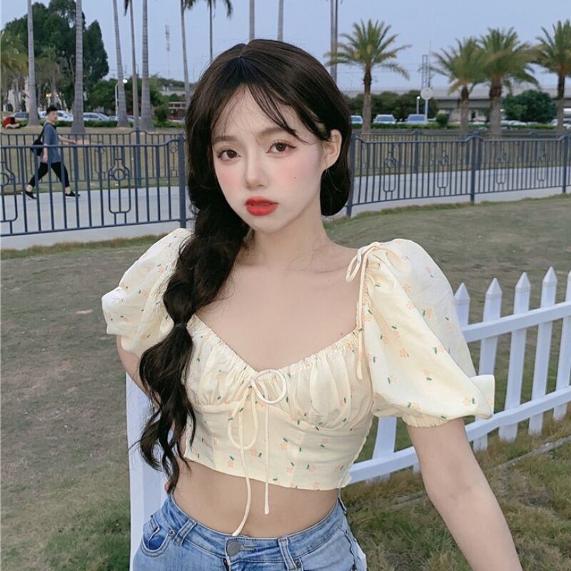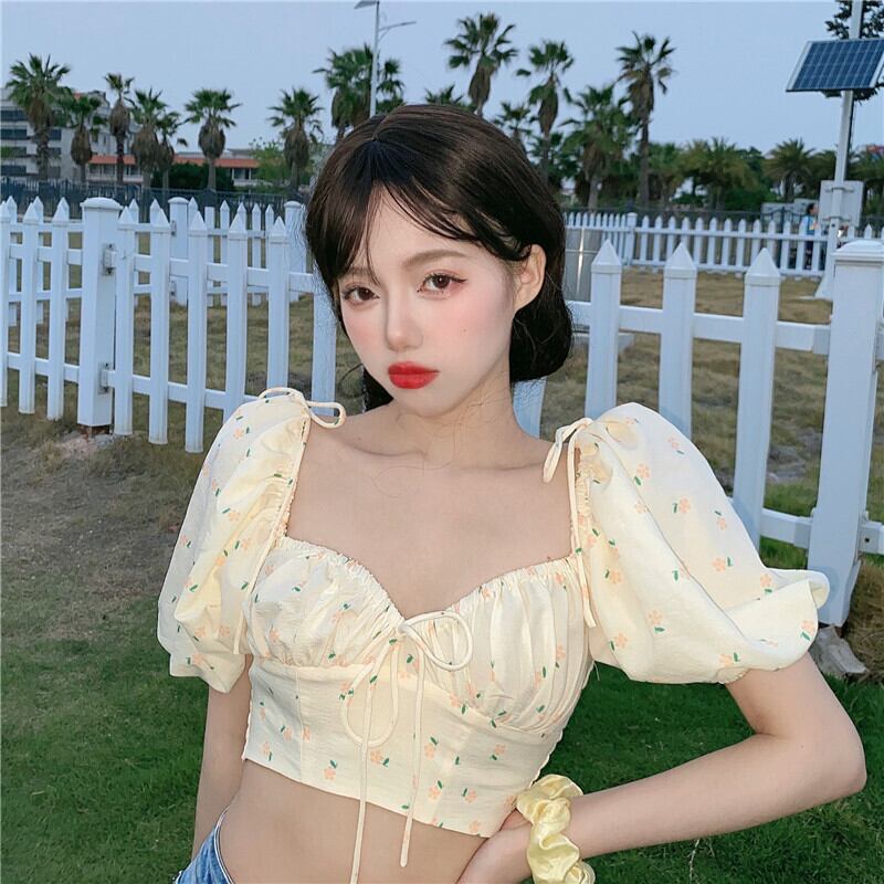 フローラルスリーブシャツ レディースサマーVネックスリムショートクロップトップ トップス レース 夏物 花柄 レースアップ YY-ファッション34212939038