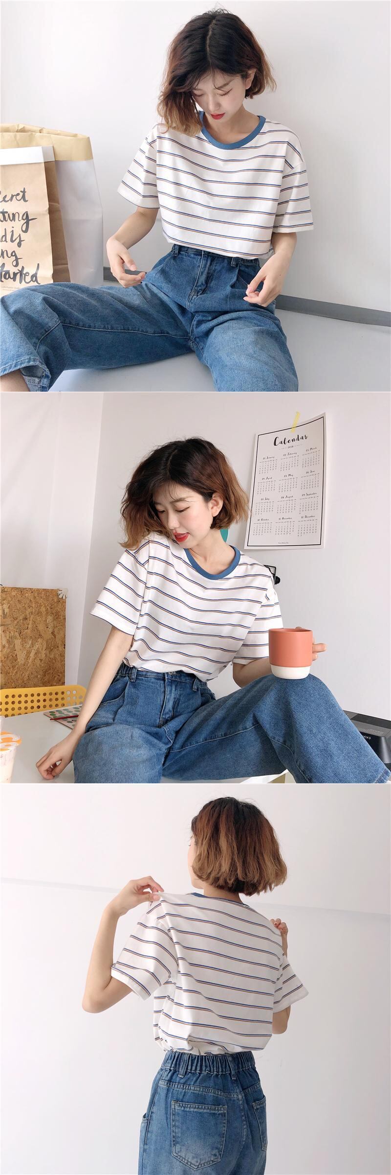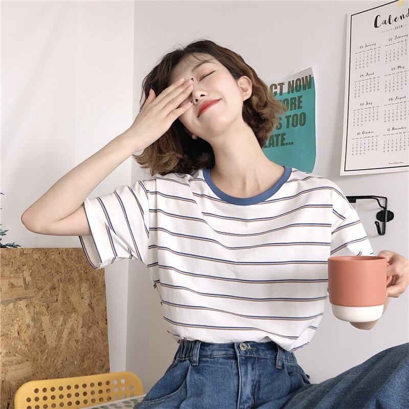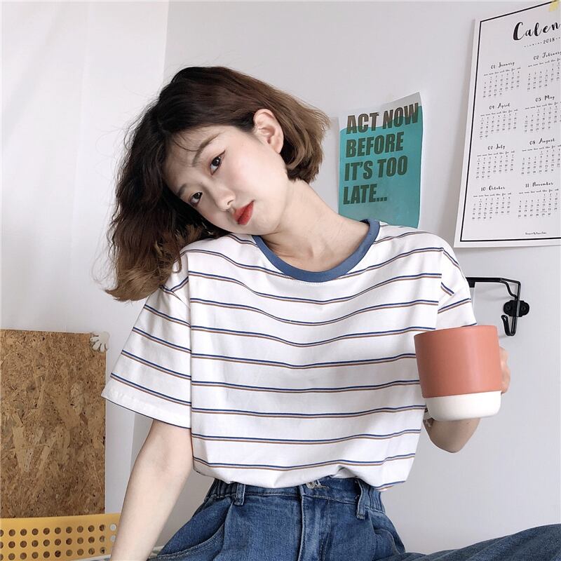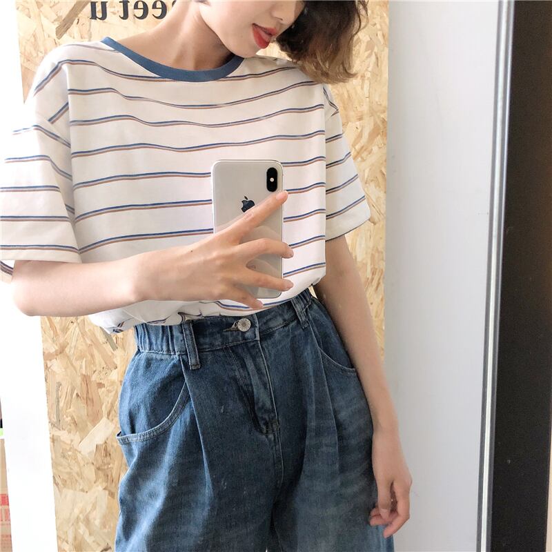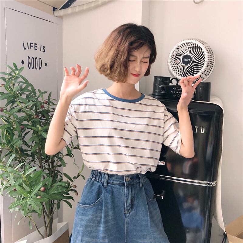 ショートサマーストライプTシャツ ルーズスリムカジュアルトップス 夏物 YY-ファッション27603444779