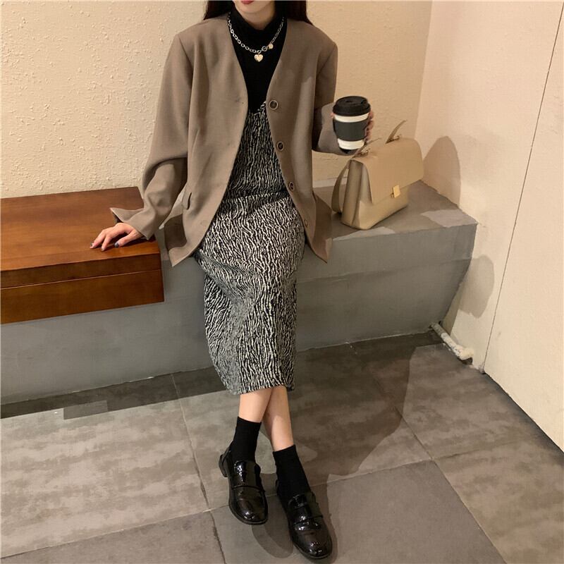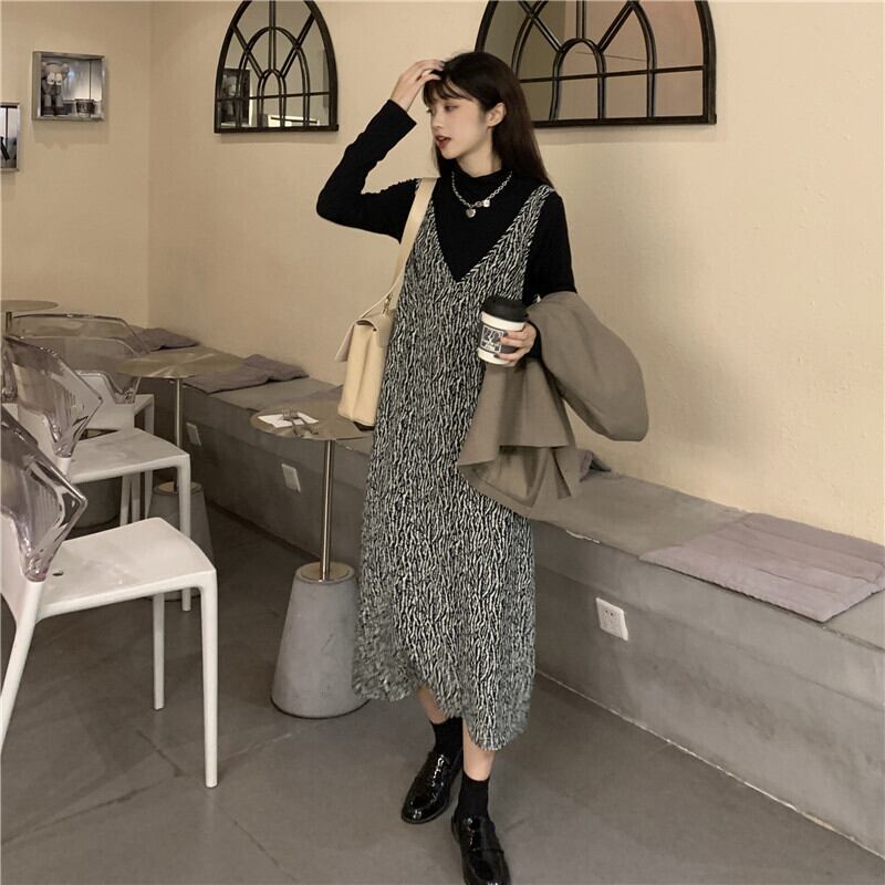 オータムスタンダードプリント柄スカート ブラックシャツ レディース レトロ 秋物 YY-ファッション87432017145