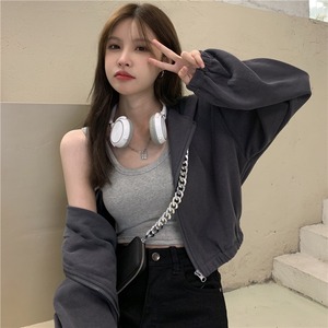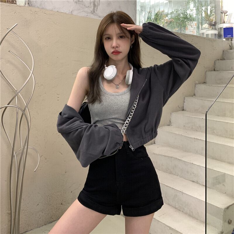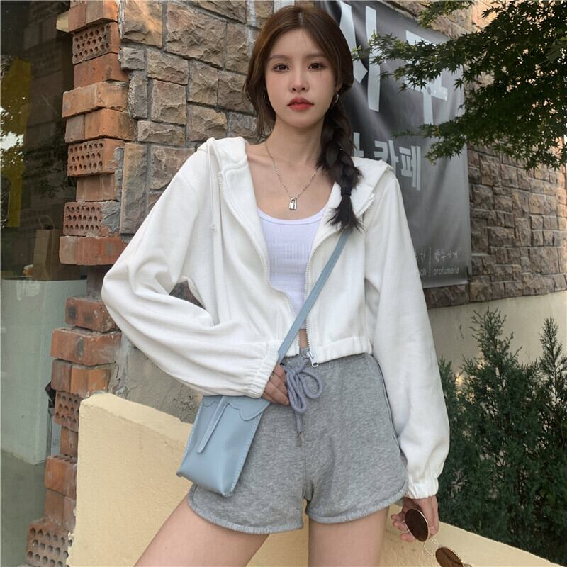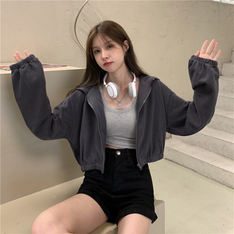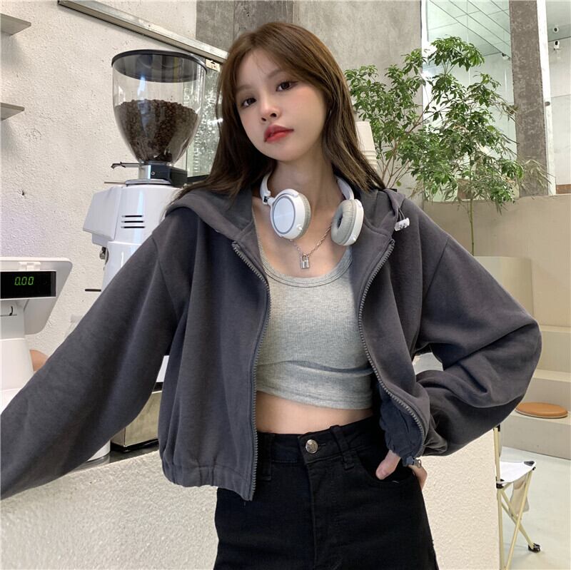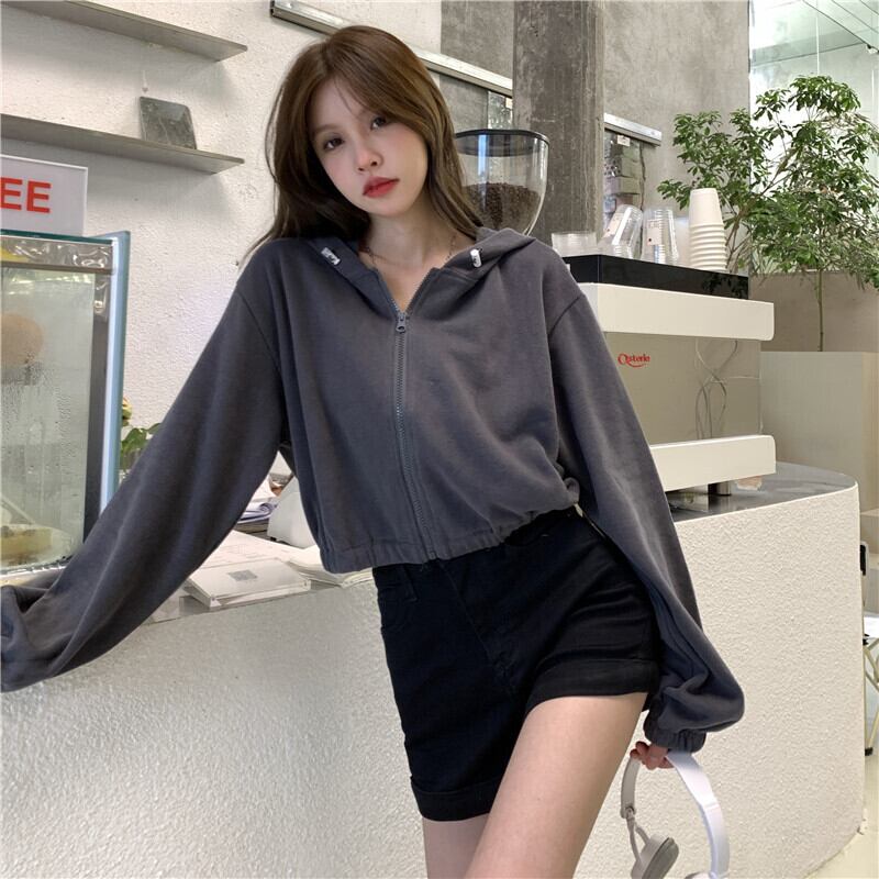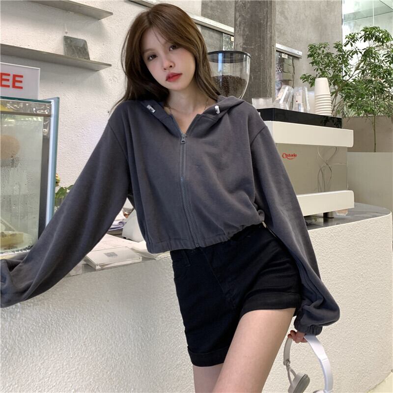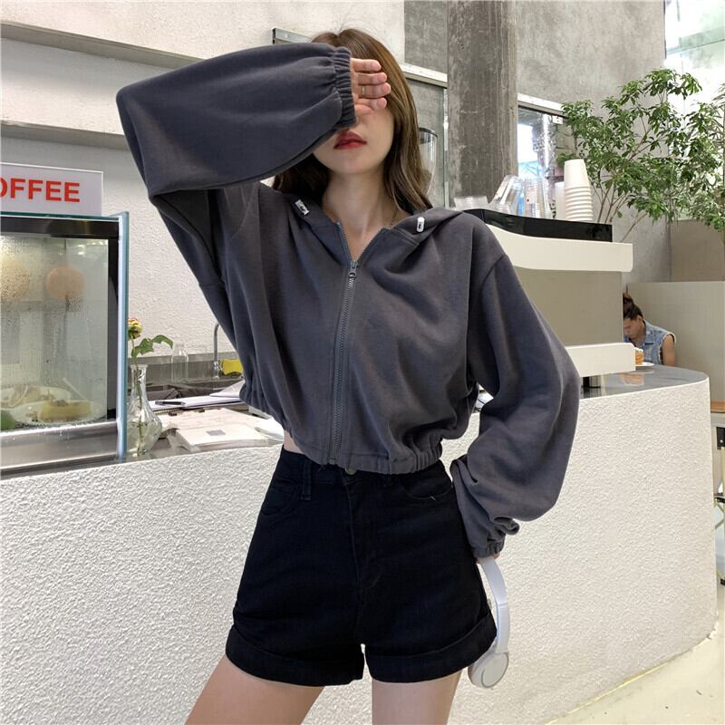 カラーハイウェストウェストショートフードセーター レディースオータムスリム薄手ジッパーカーディガンジャケット 秋物 YY-ファッション31287598096