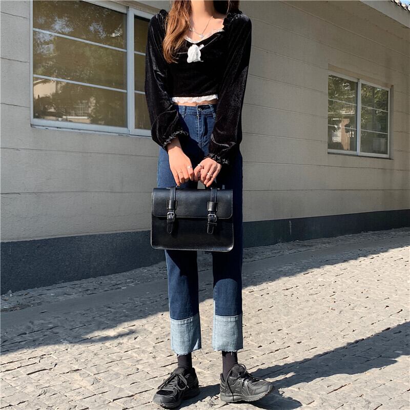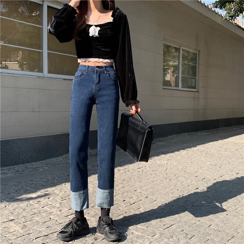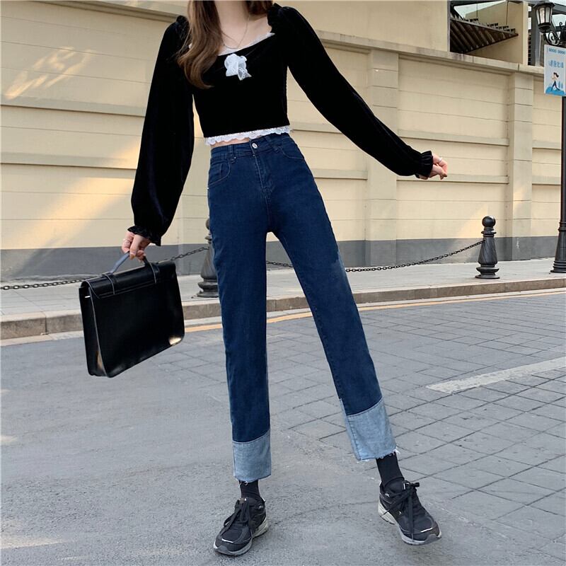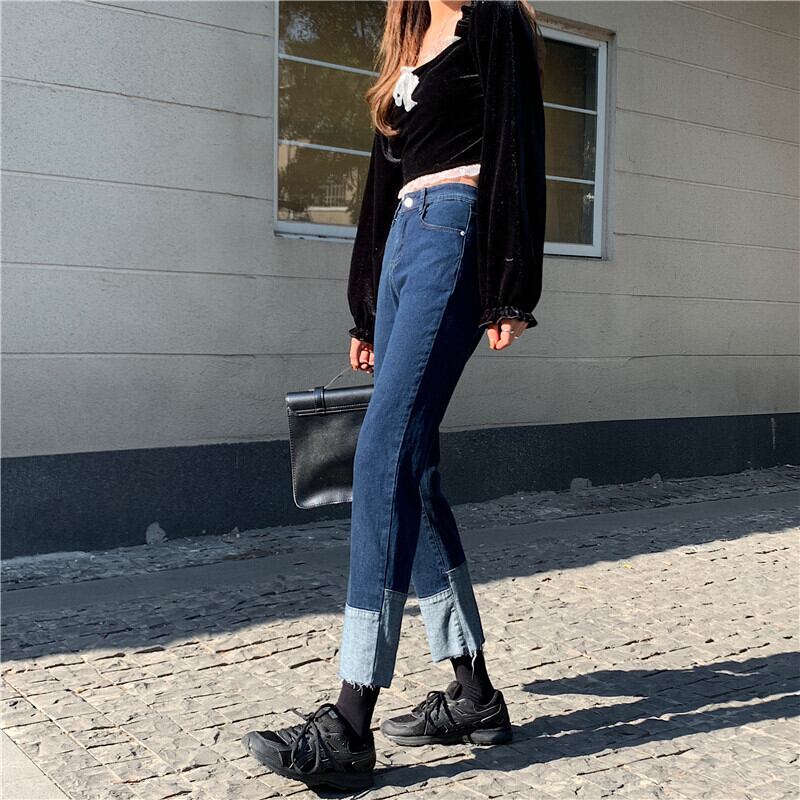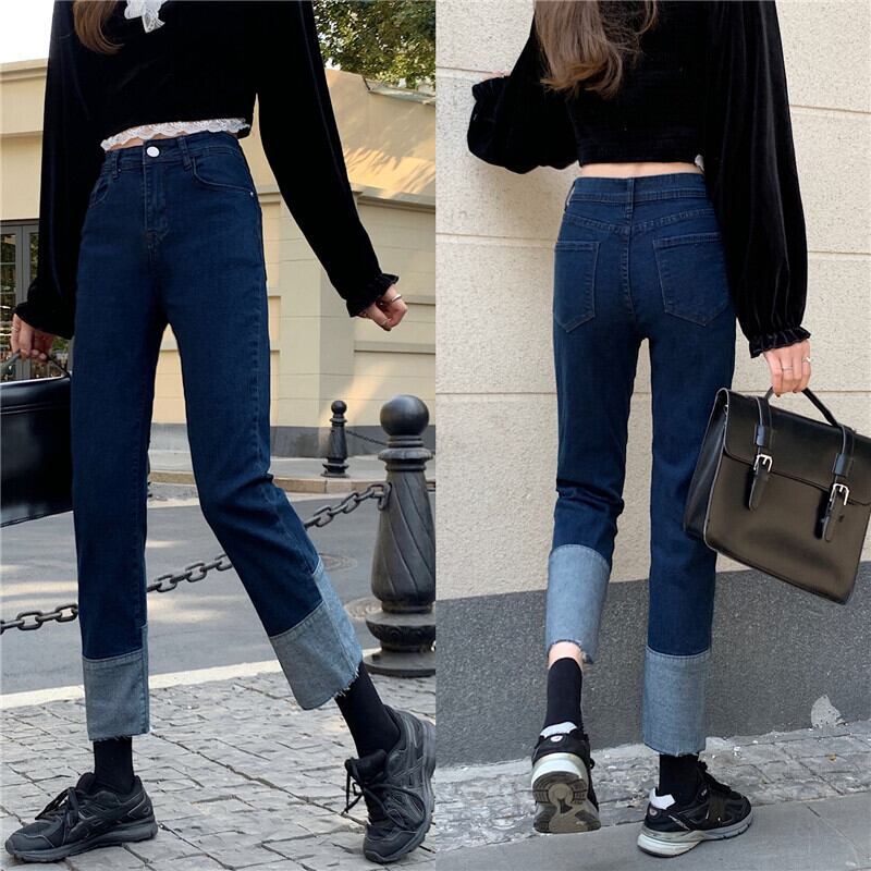 カラージーンズ オータムハイウェスト薄手パンツ クロップド 秋物 ステッチ YY-ファッション12730134830