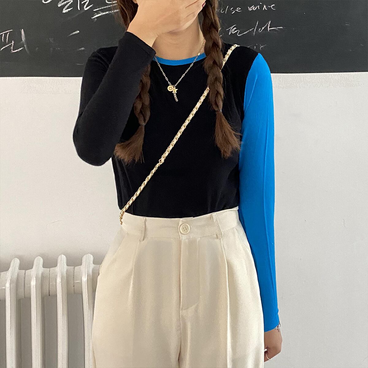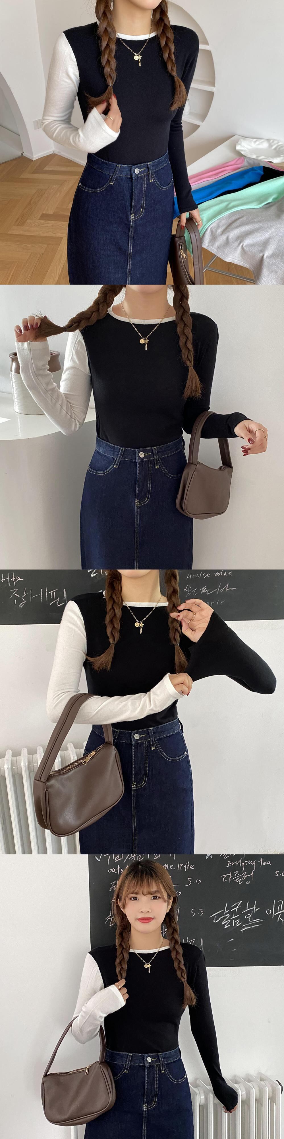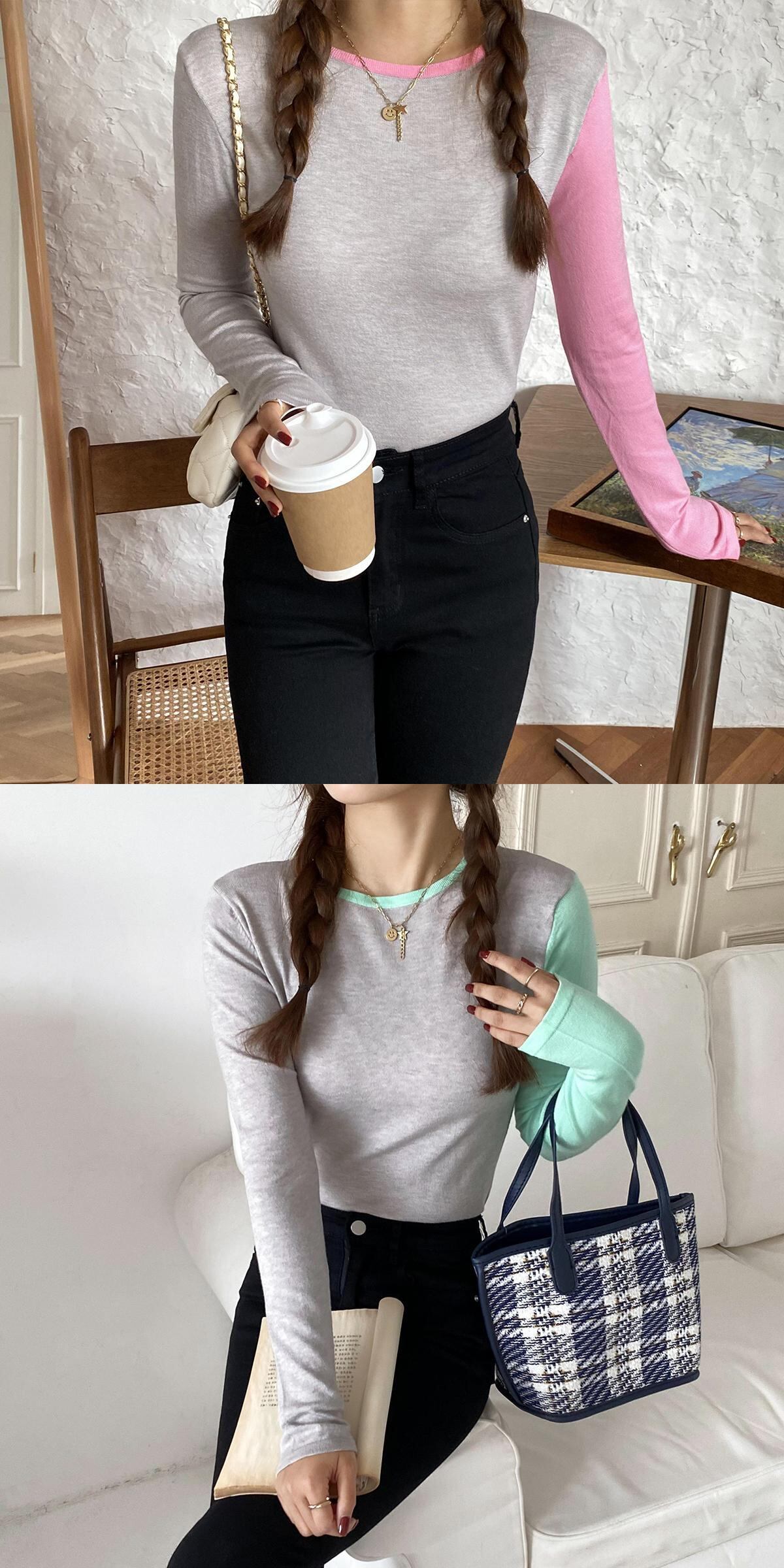 カラーラウンドネックニットシャツ スプリングオータムスリム ロング 春物 秋物 Oネック ステッチ YY-ファッション8515103671