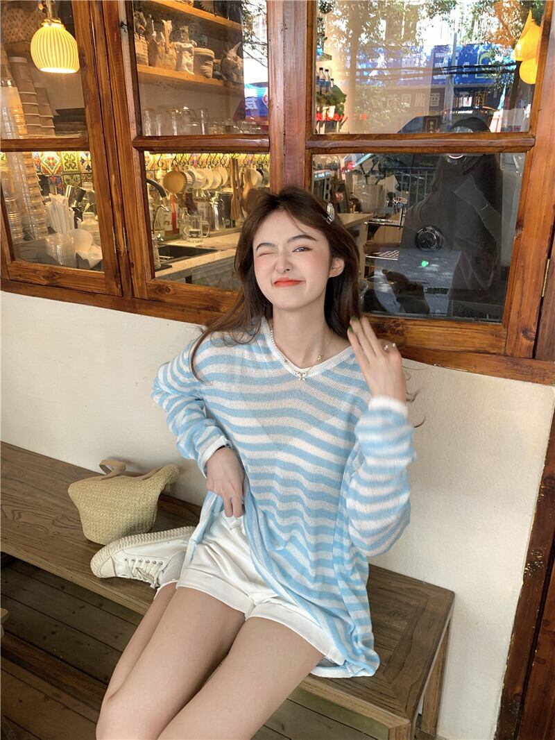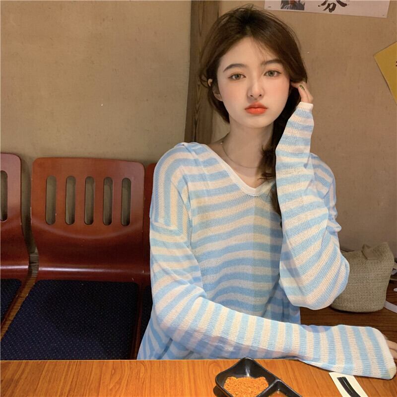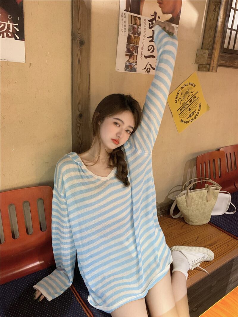ルーズブルーホワイトストライプフードVネックニットシャツ ロング YY-ファッション18869456169