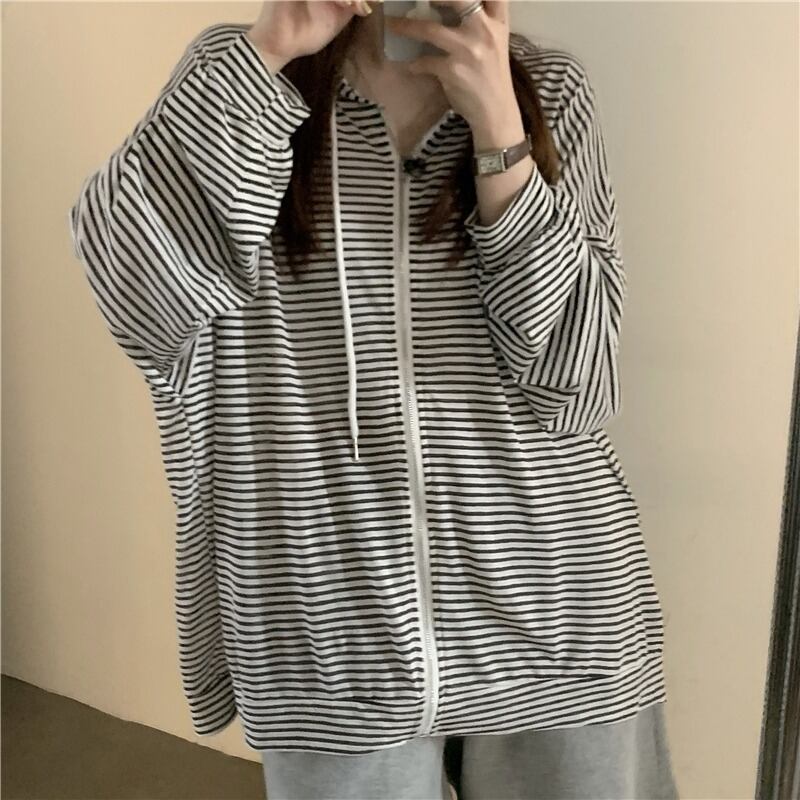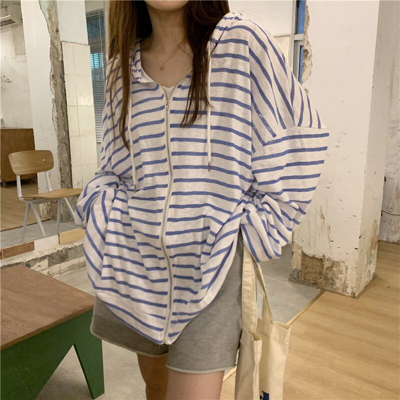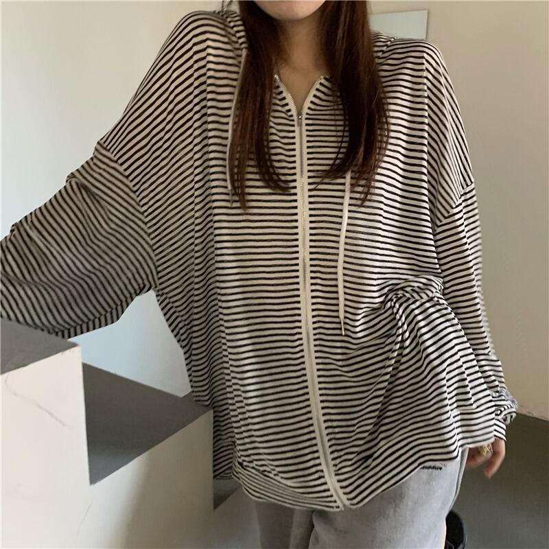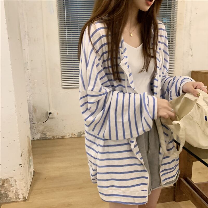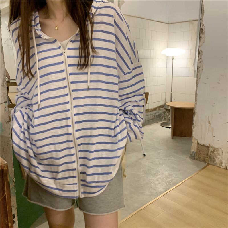 ストライプフードジャケット サマー薄手ルーズトップス ロング 夏物 YY-ファッション14213131417