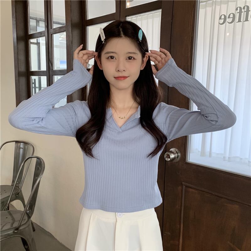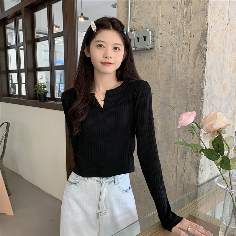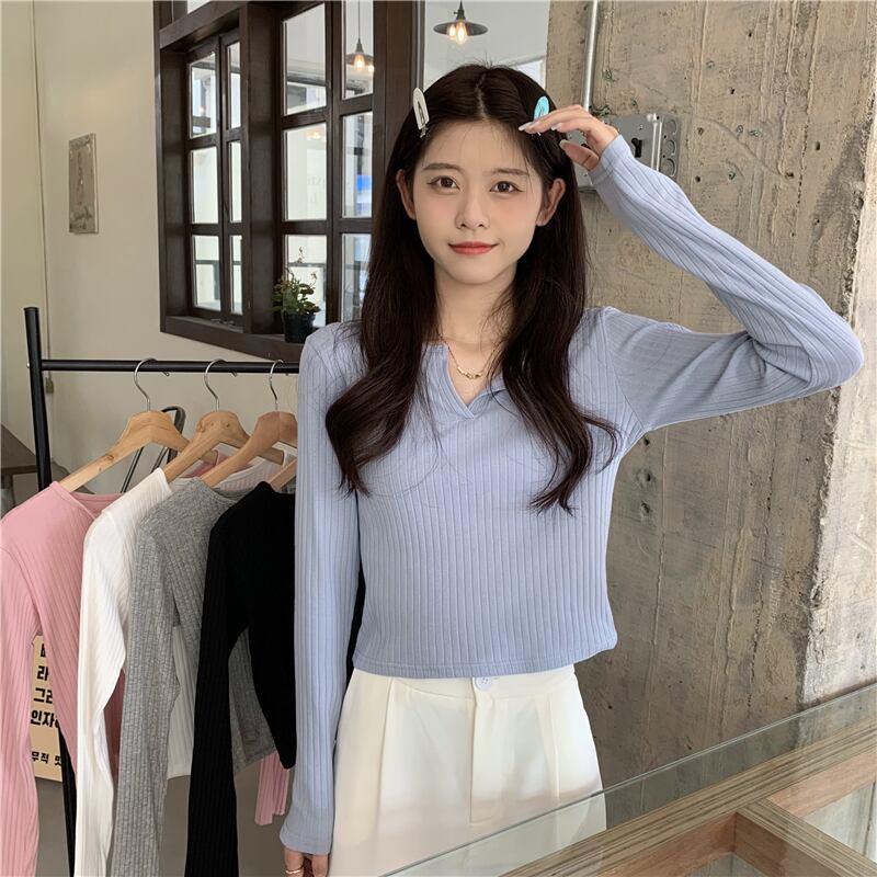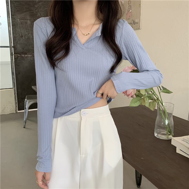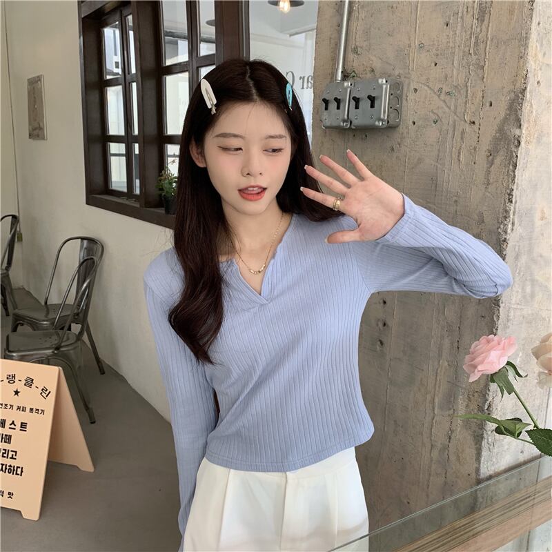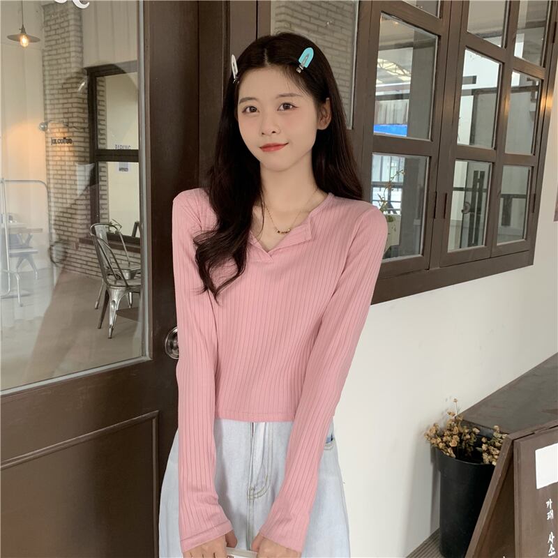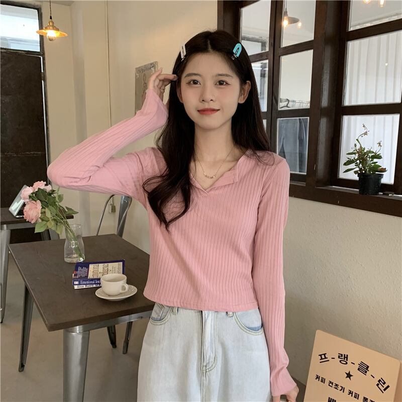 オータムスリムVネックTシャツ ブラウス 大人ガーリー スウィート キュート カジュアル 秋物 YY-ファッション10914365216