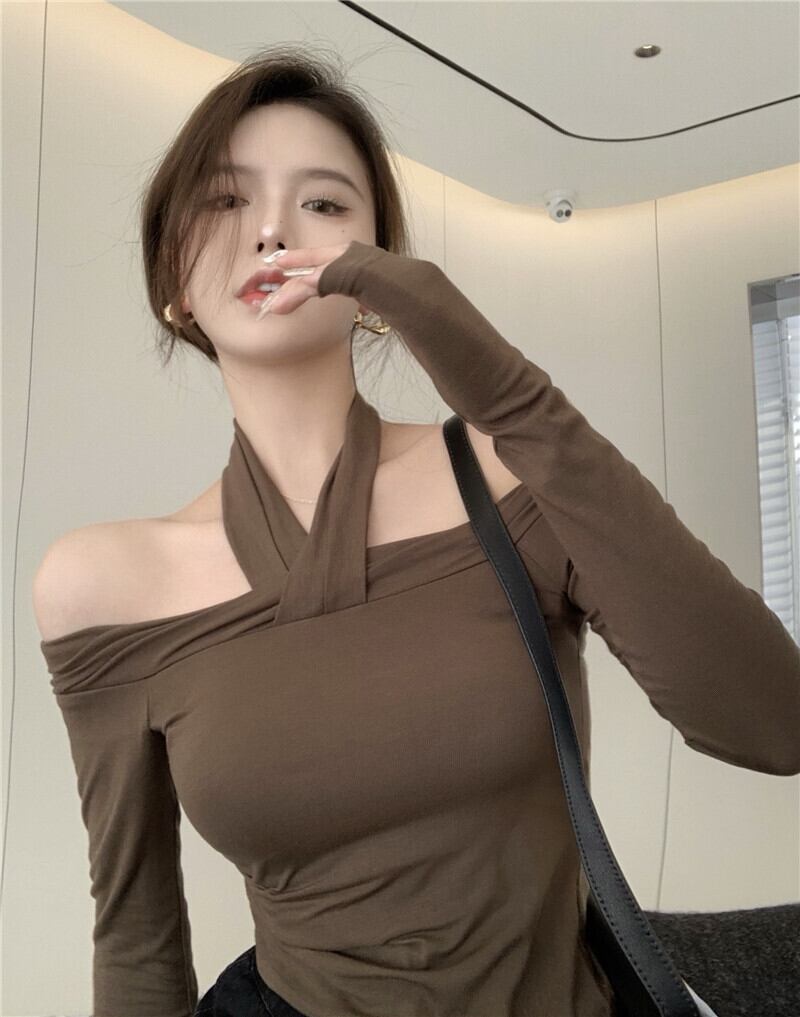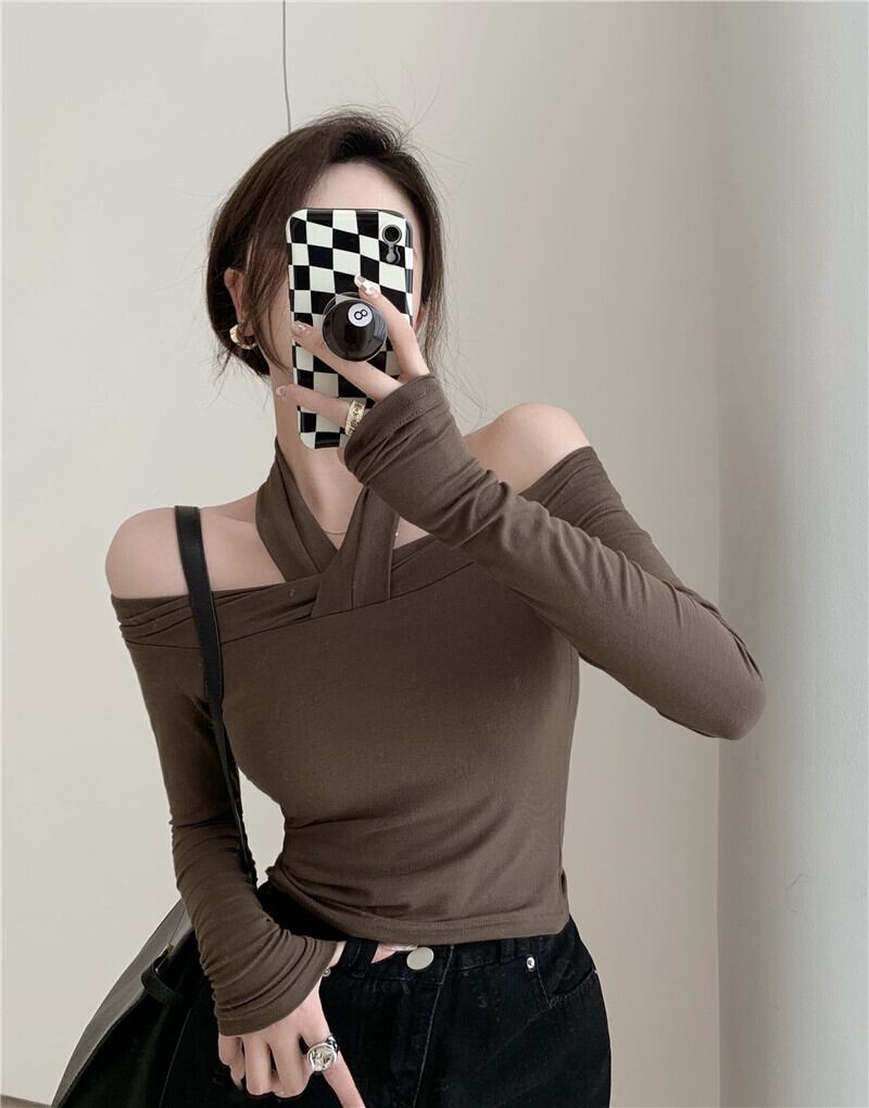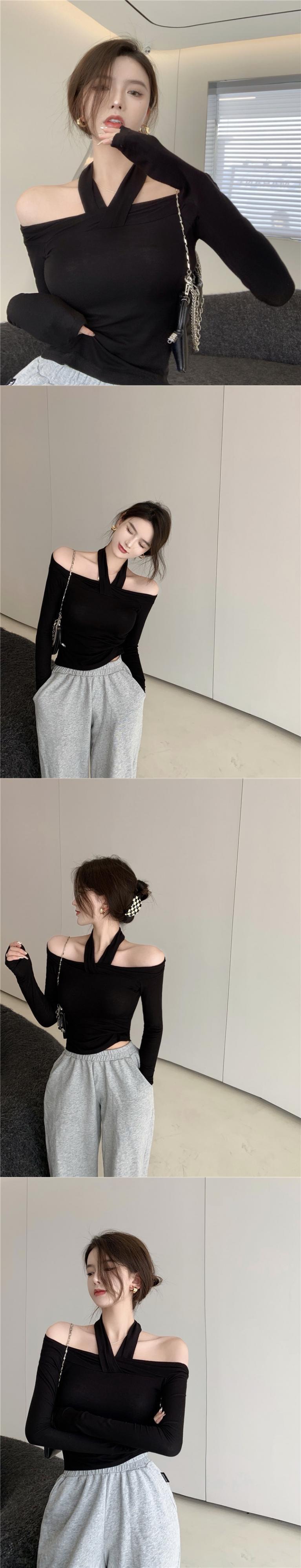 ストラップレススリムTシャツ オータムスタンダードショートブラックトップス ロング レトロ 秋物 ピュア YY-ファッション50541117884