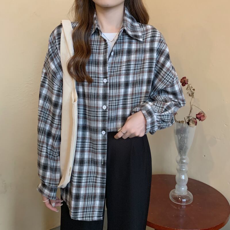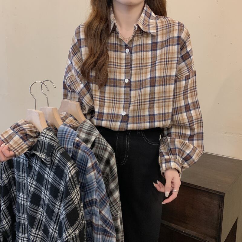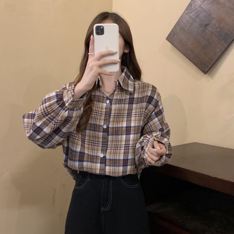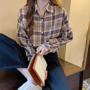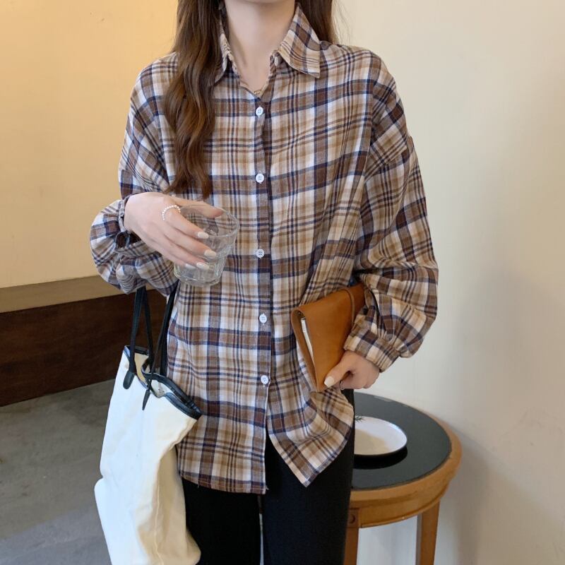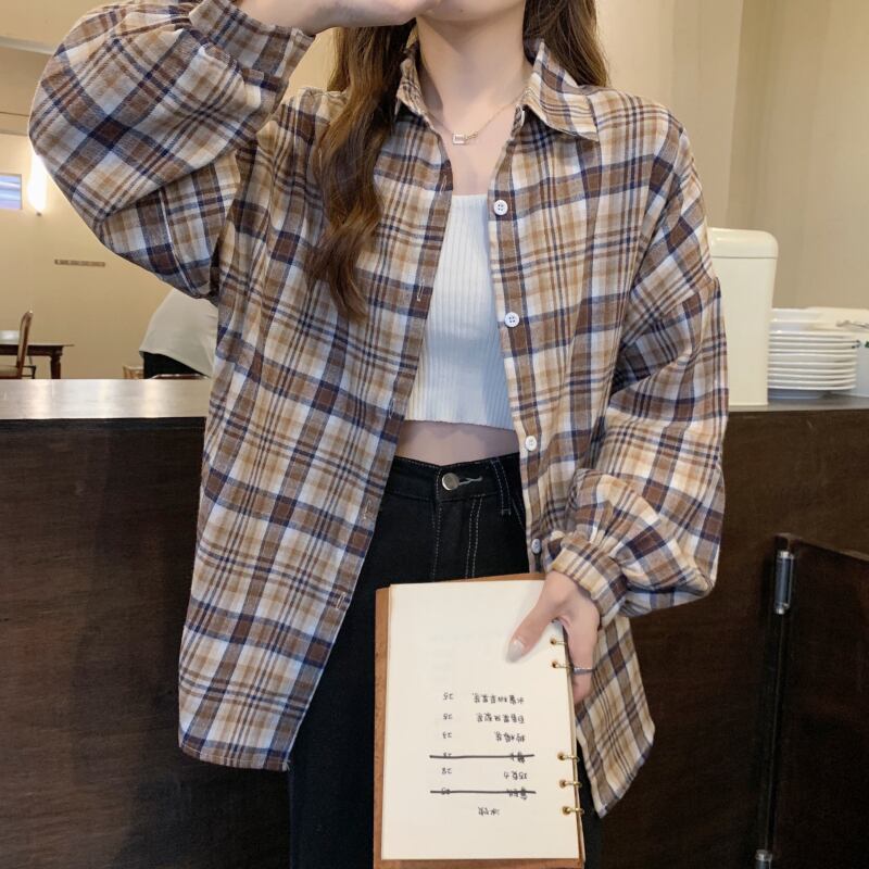 オータムスタンダード格子柄ルーズ薄手カジュアルスリーブシャツ レトロ 秋物 YY-ファッション32514297532