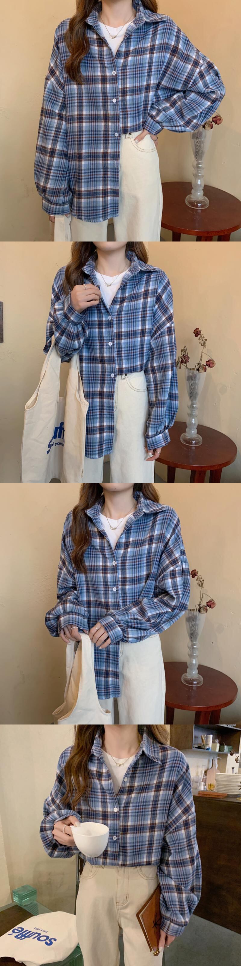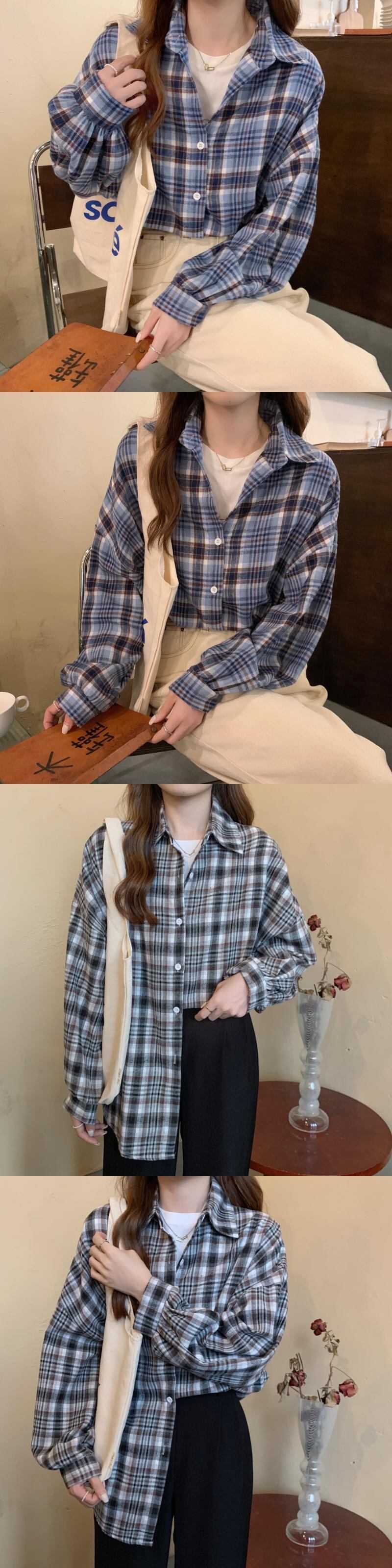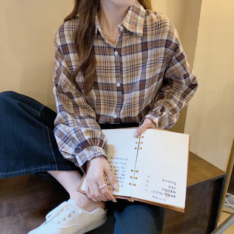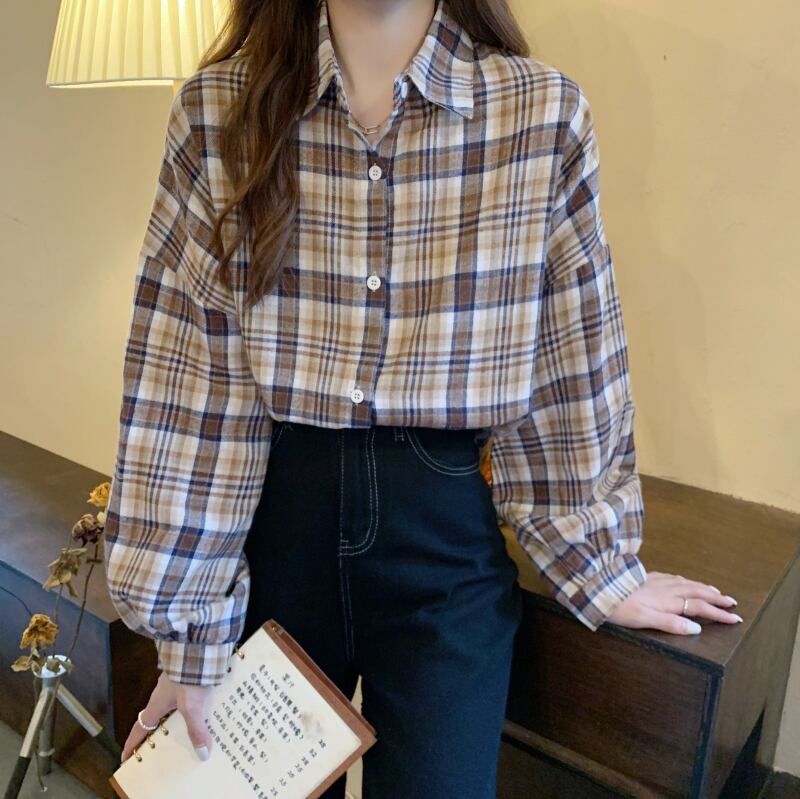 オータムスタンダード格子柄ルーズ薄手カジュアルスリーブシャツ レトロ 秋物 YY-ファッション32514297532
