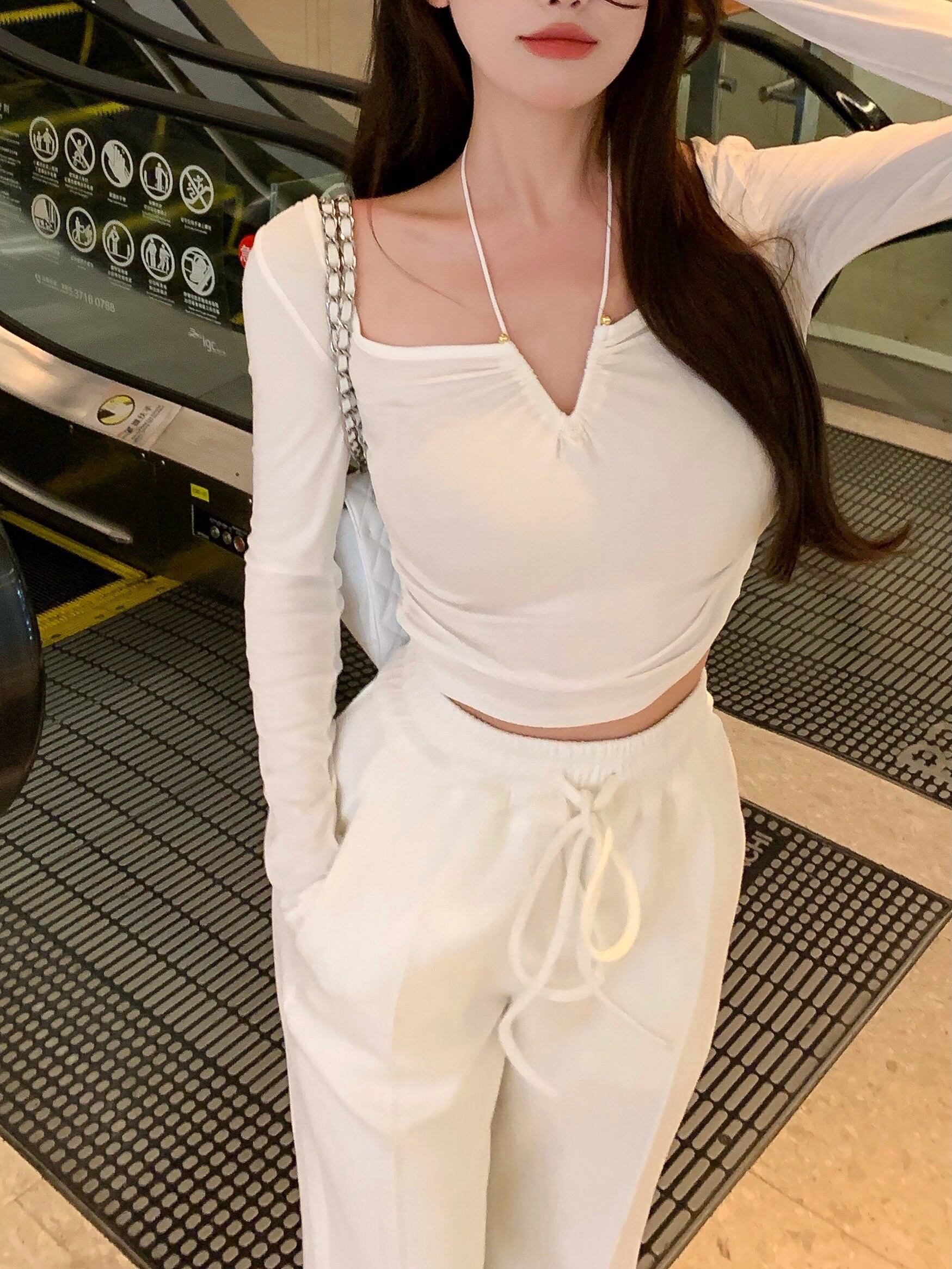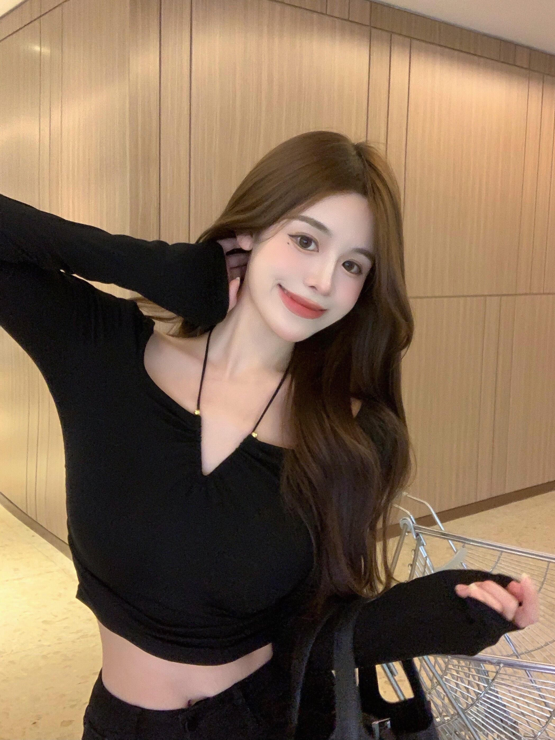 Tシャツ シャツ ショートブラックホルターオータムトップス ロング 秋物 ピュア YY-ファッション30900893536