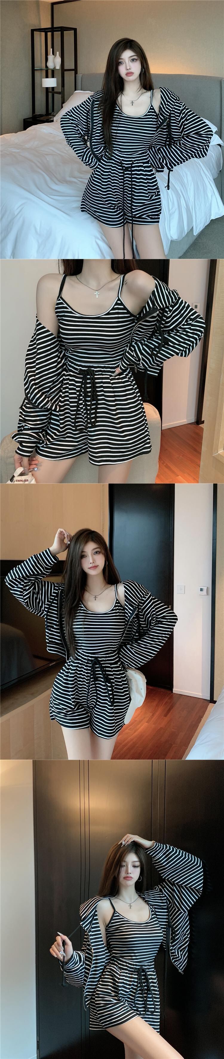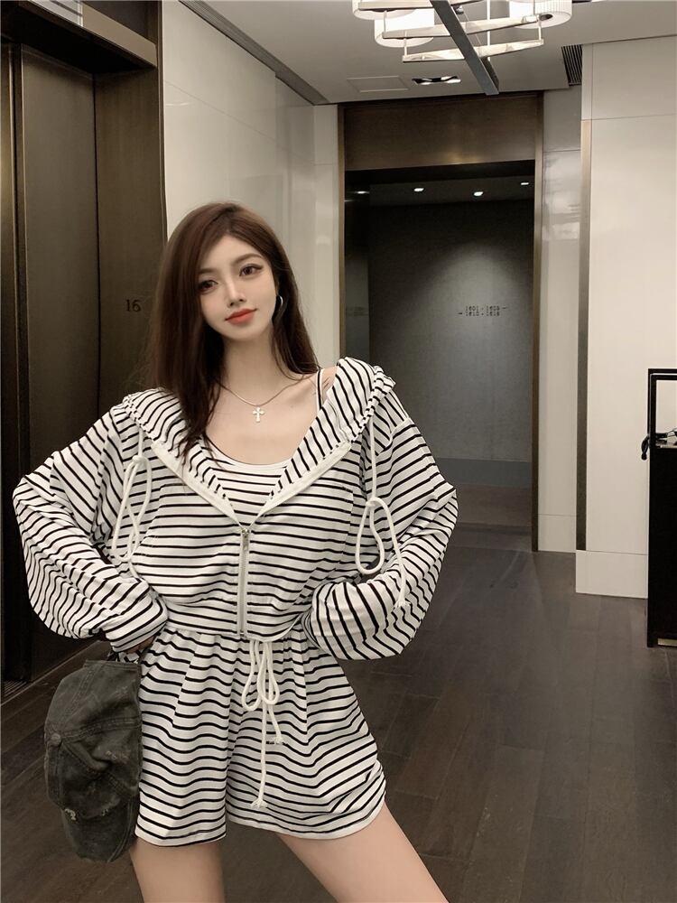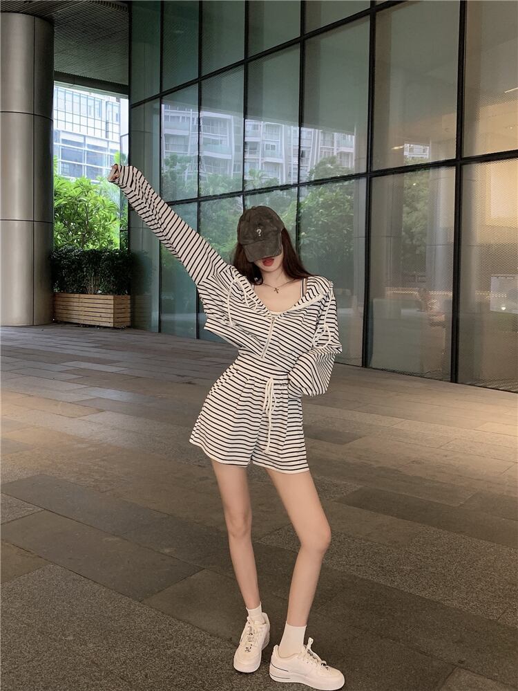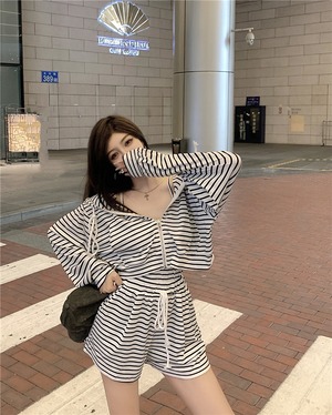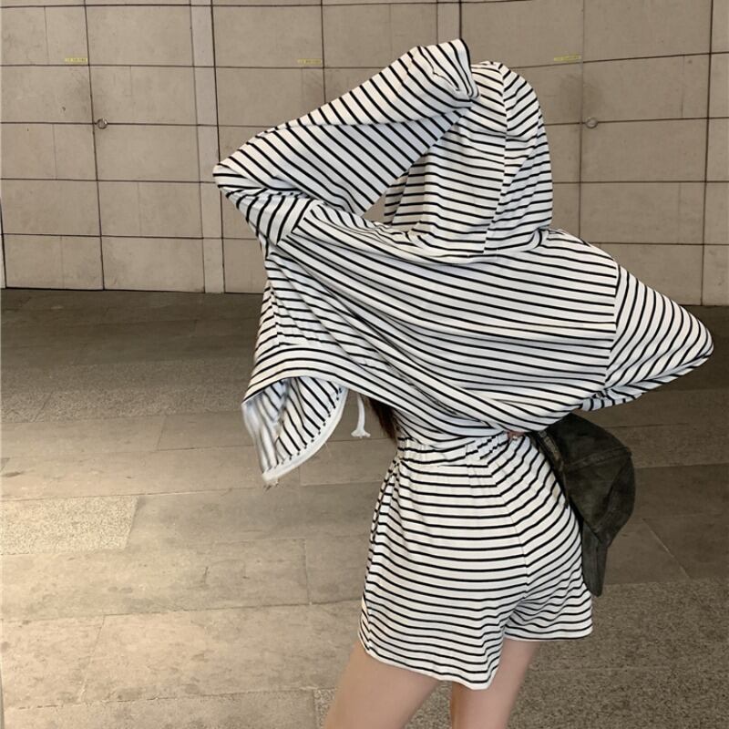 スプリングオータムストライプフードカーディガンルーズショートジャケット 薄手ウェストショーツ セット 春物 秋物 ブルマー YY-ファッション34153808269