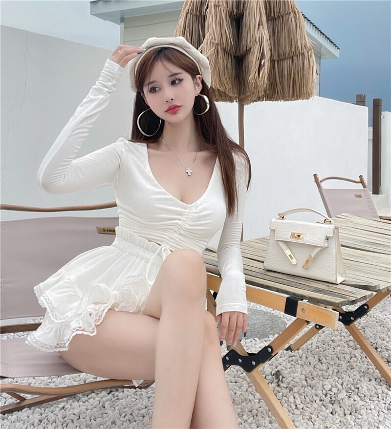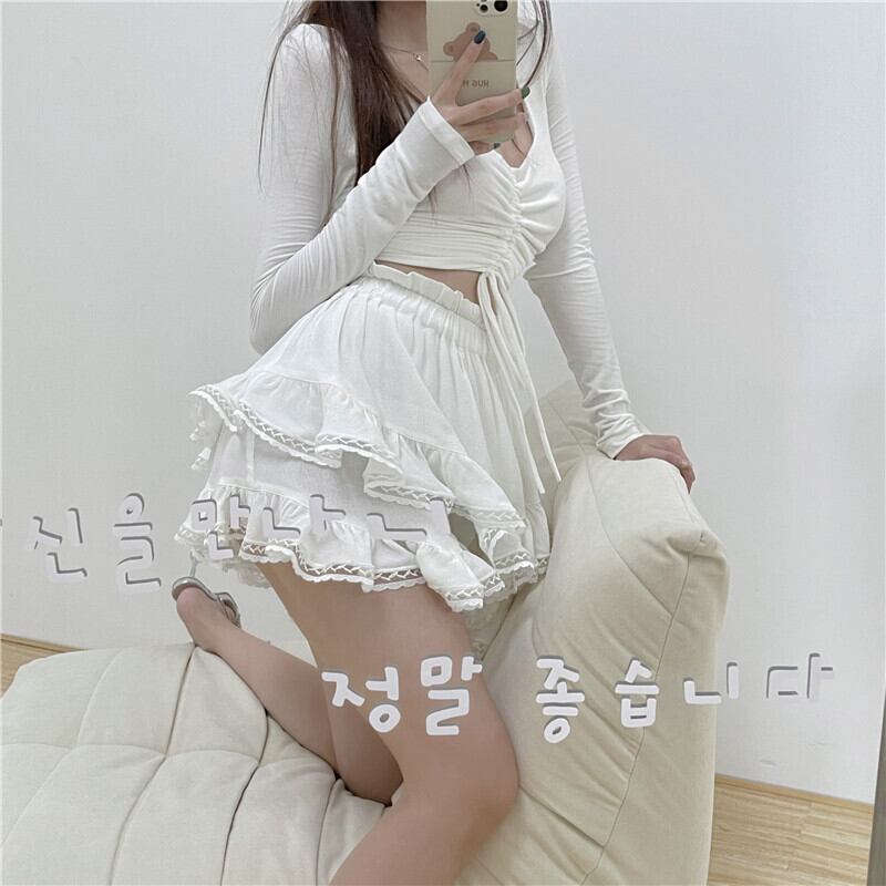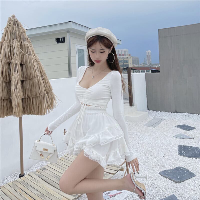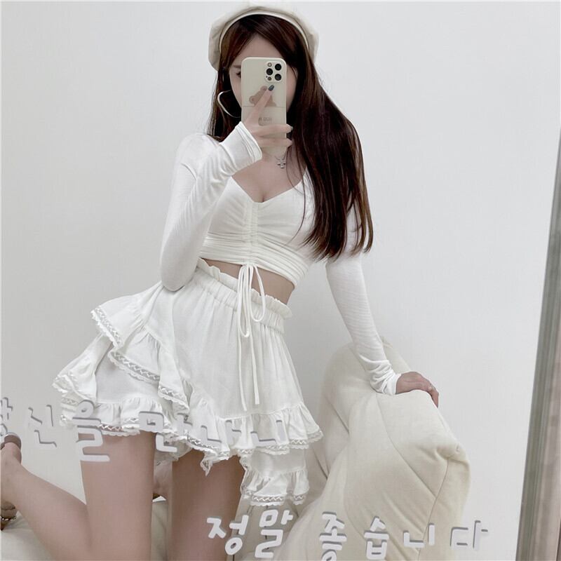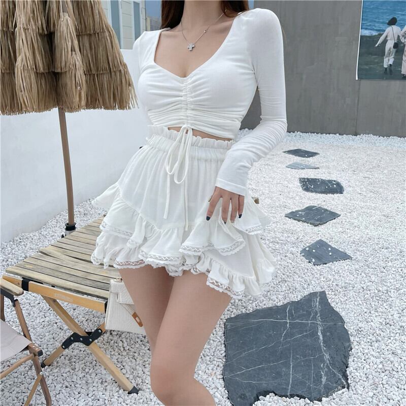 スタイルギャザーダブルショートトップス ハイウェストウェストレーススカート レディース ピュア YY-ファッション33867006758