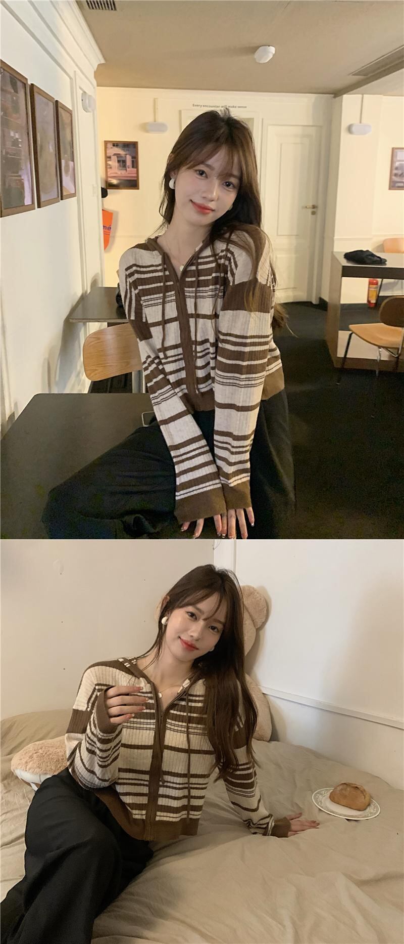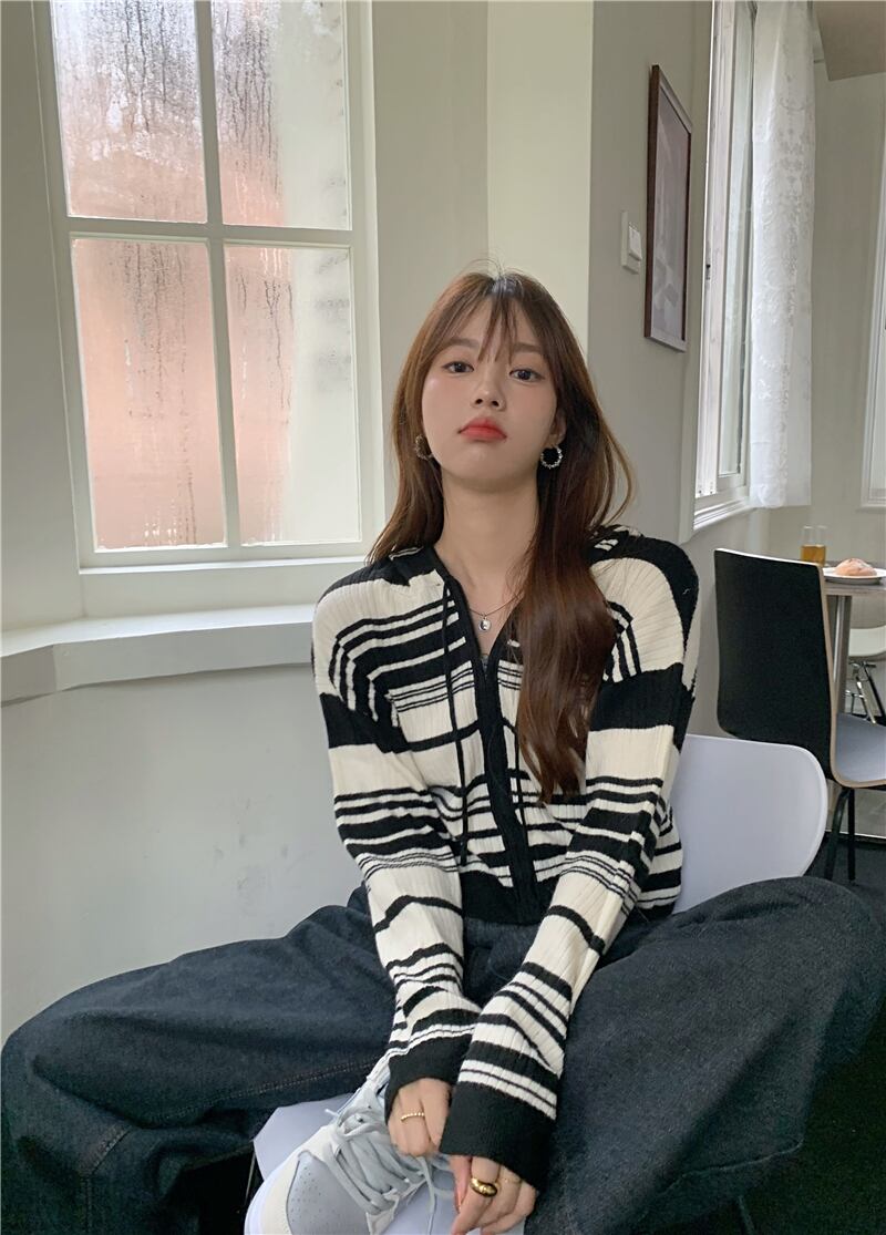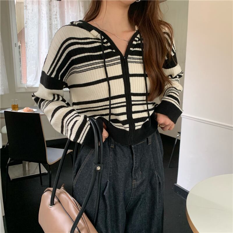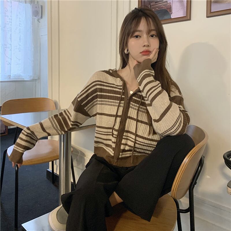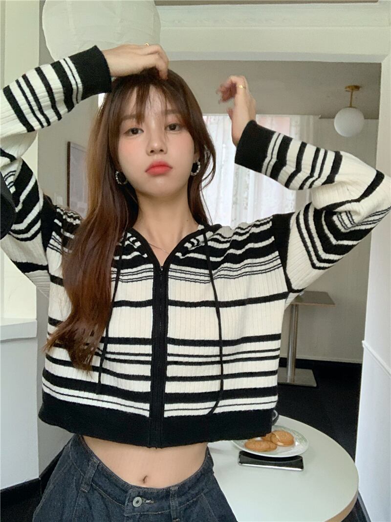 セーター ジャケット フードカーディガンスプリングオータムストライプニットギャザーショートトップス ロング 春物 秋物 YY-ファッション67898341575