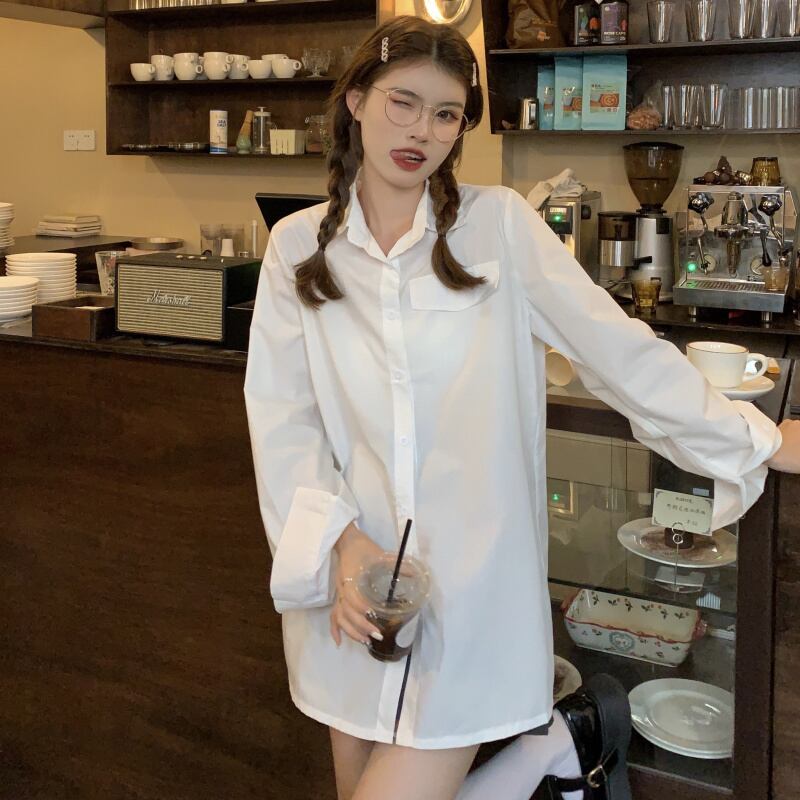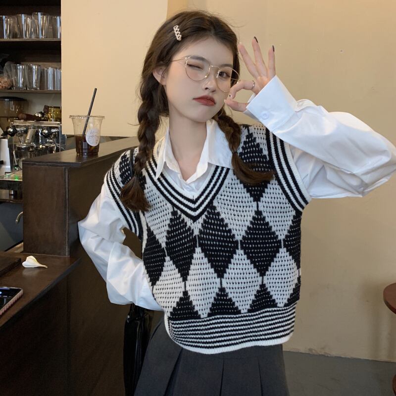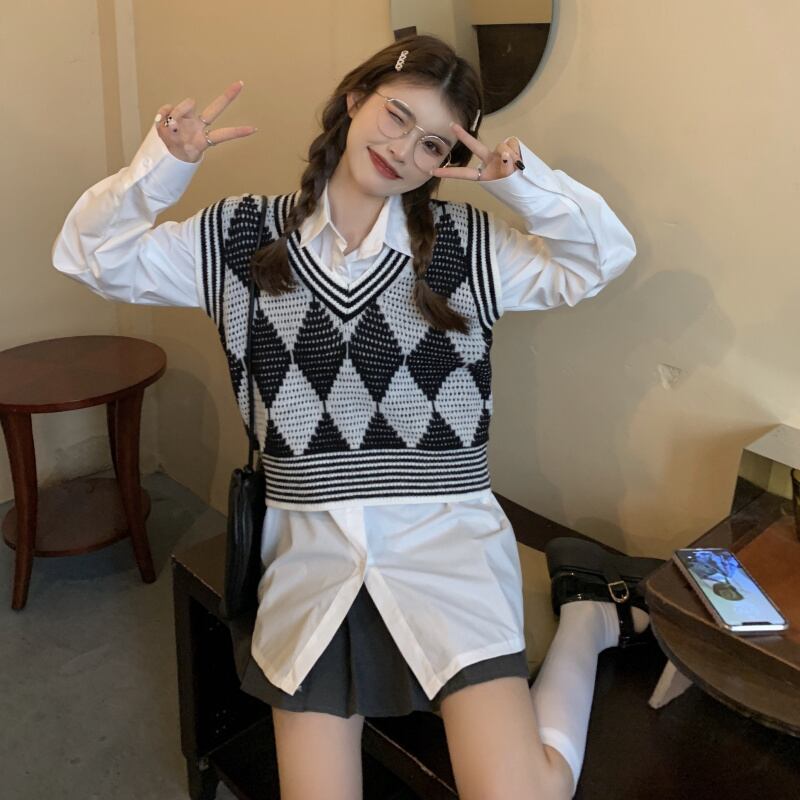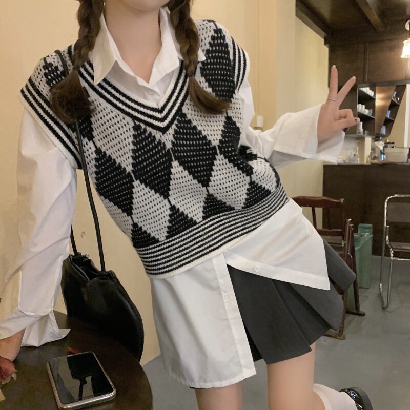 ルーズホワイトシャツ 格子柄ニットセーター オータム ロング 秋物 YY-ファッション98652807521