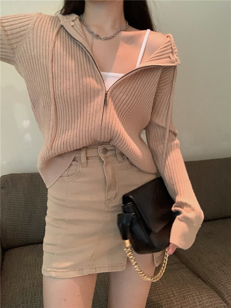 セーター レディースルーズフードジッパーカーディガンジャケット オータムカーキトップス 秋物 YY-ファッション62118960403