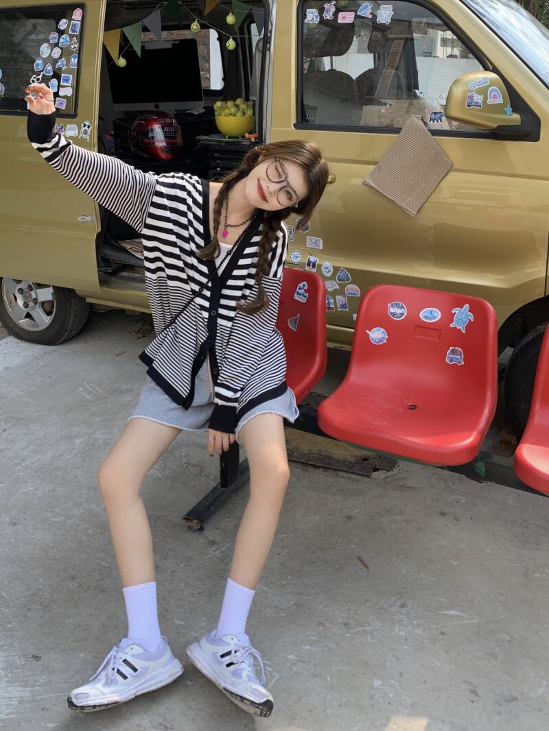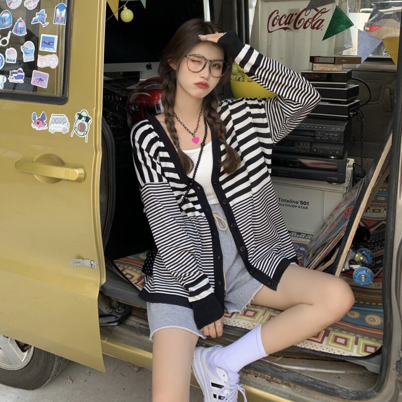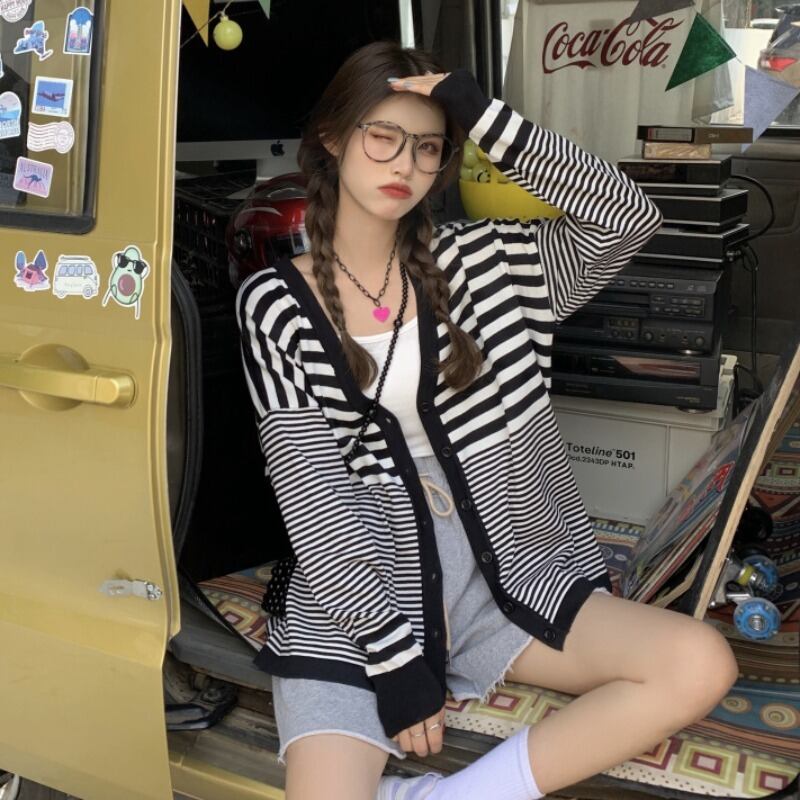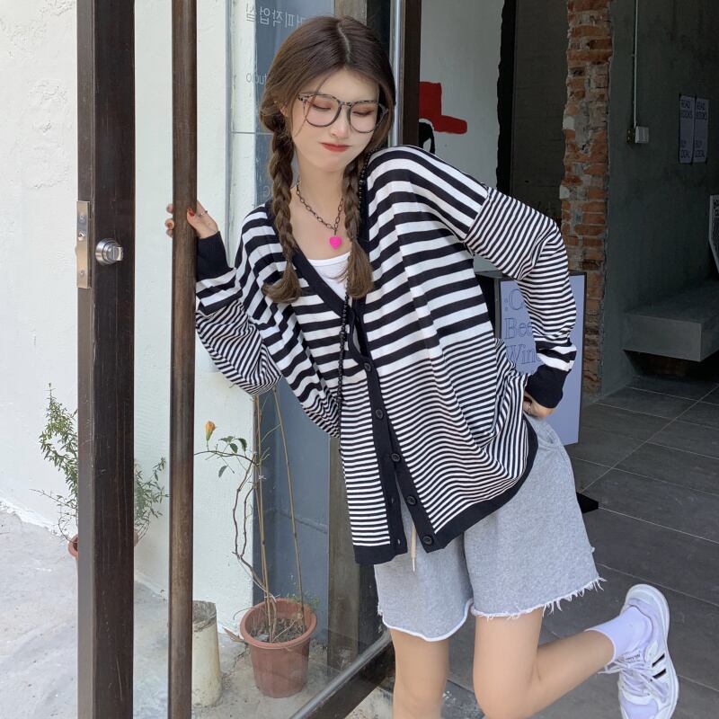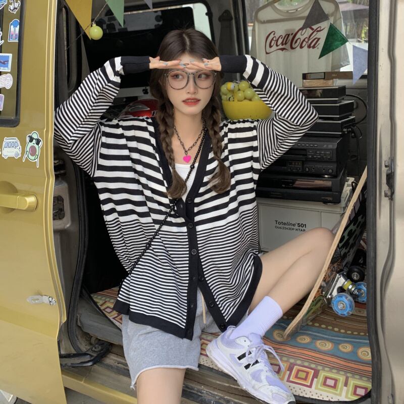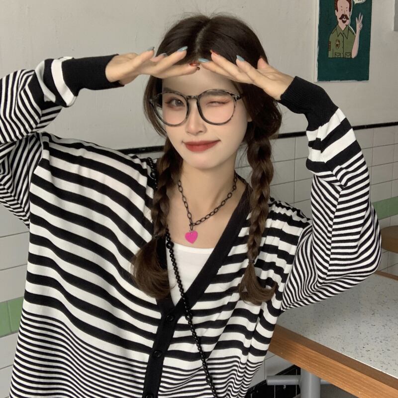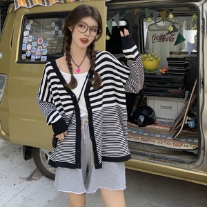 ブラックホワイトストライプニットカーディガンオータム薄手トップス カジュアルジャケット ロング 秋物 YY-ファッション94115130295