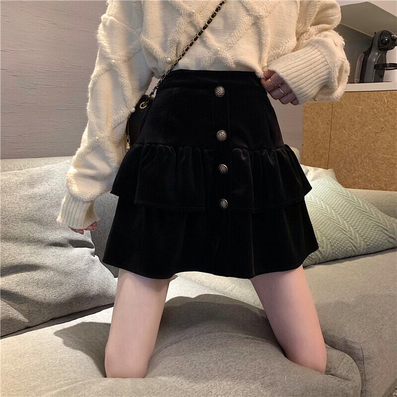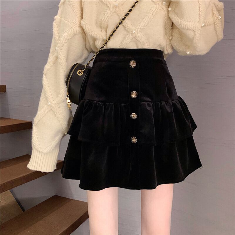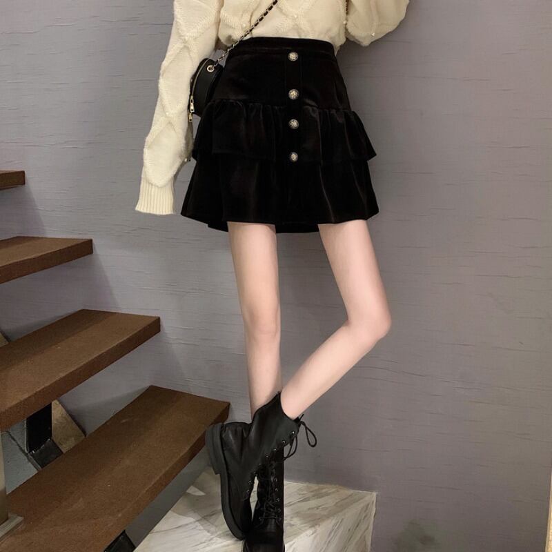 ゴールドベルベットスカート スプリングオータムボタンハイウェストウェストスリムAラインショート 春物 秋物 YY-ファッション38834416213
