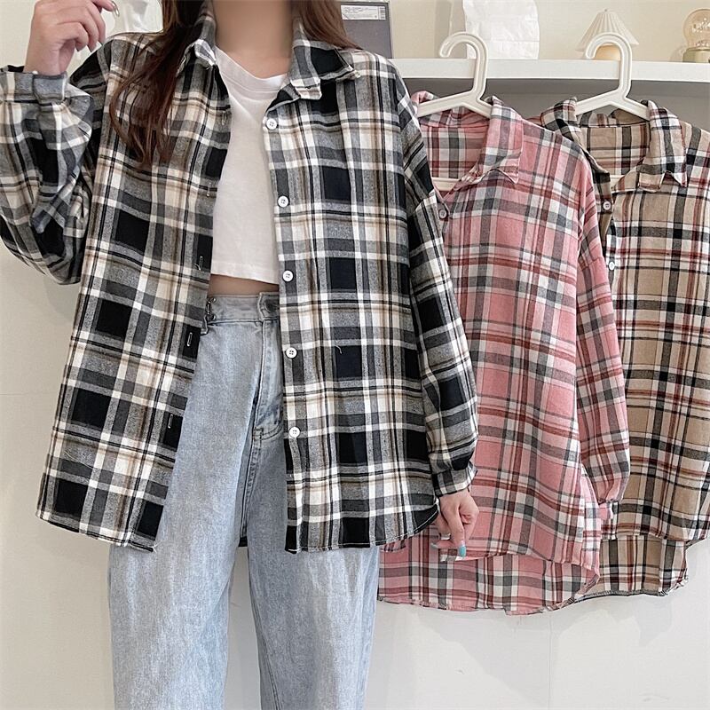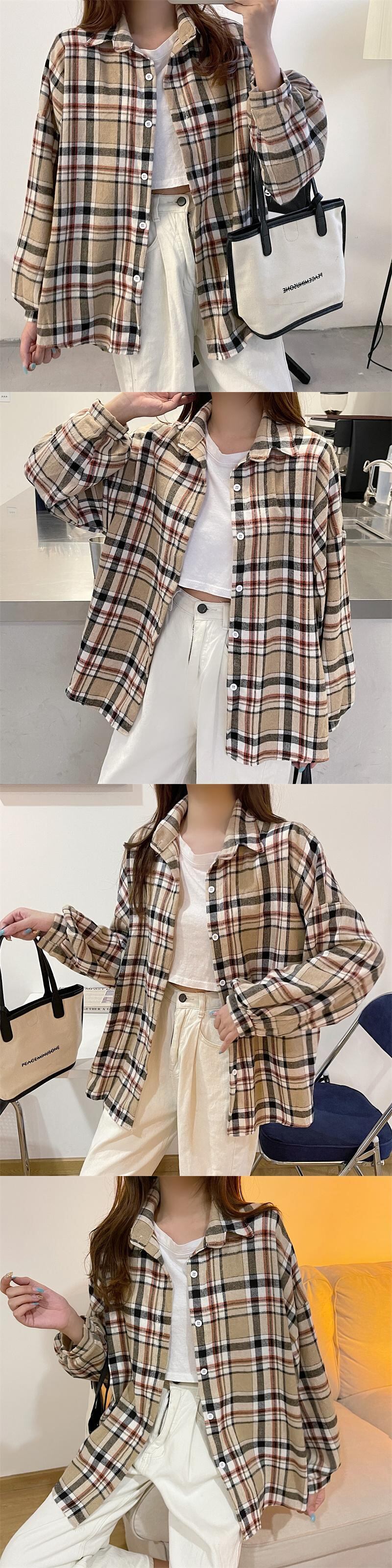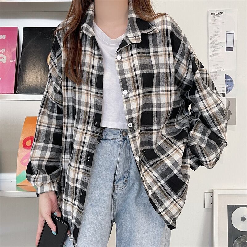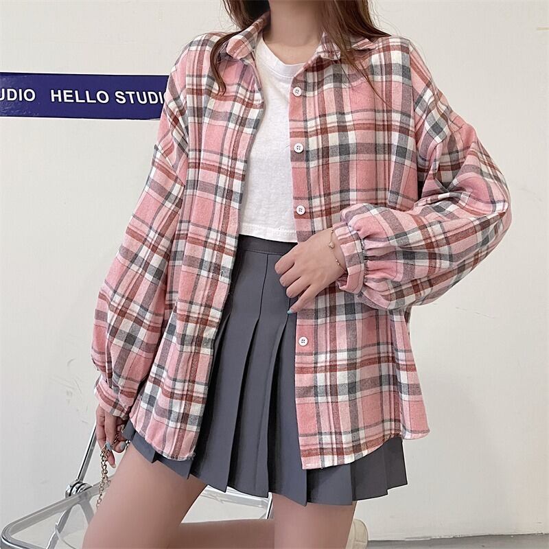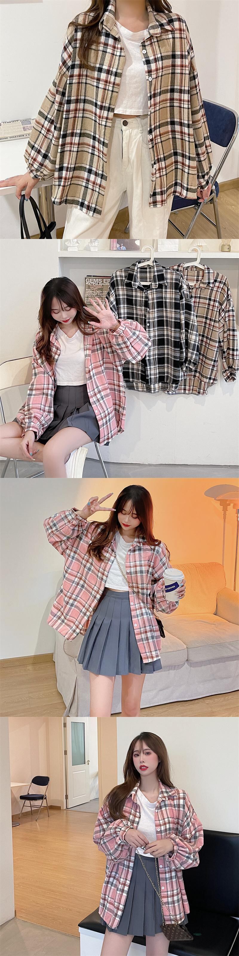 格子柄シャツ ブラウス オータムウィンタースタンダードスタイルルーズ ロング レトロ 秋物 冬物 YY-ファッション23209710179