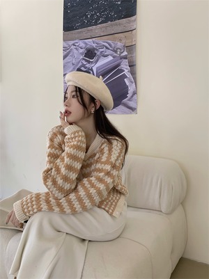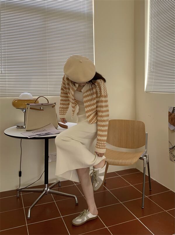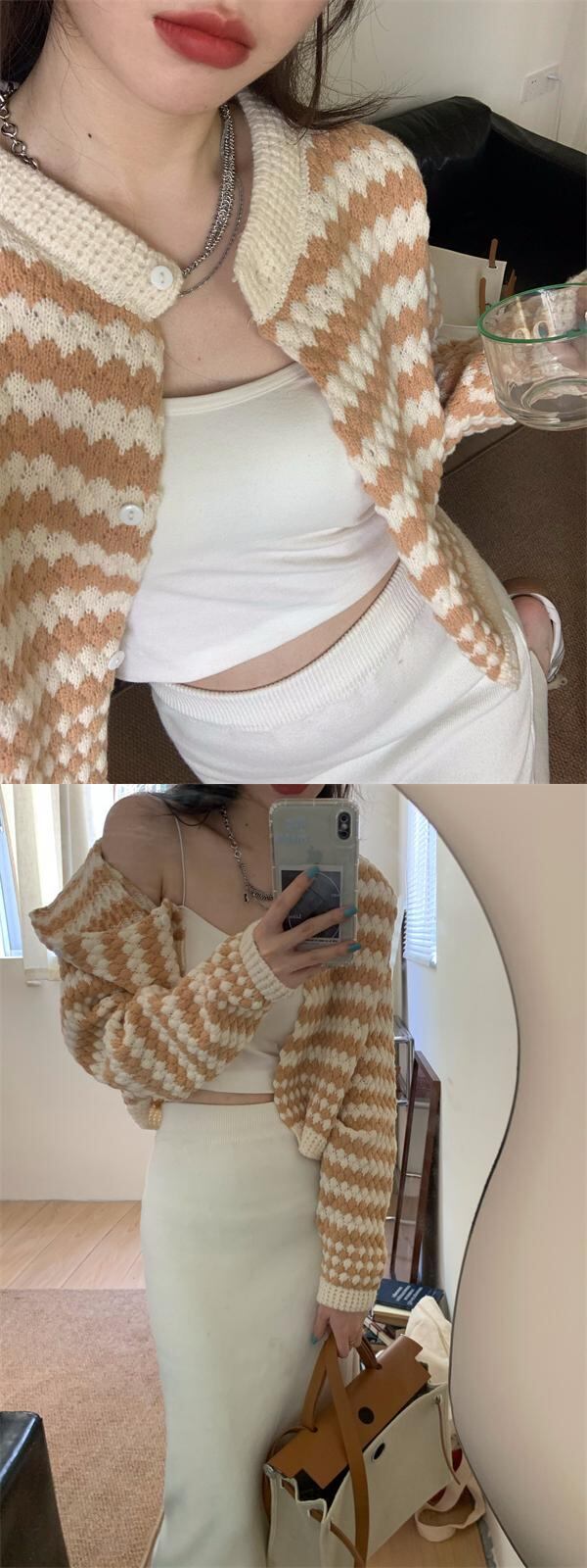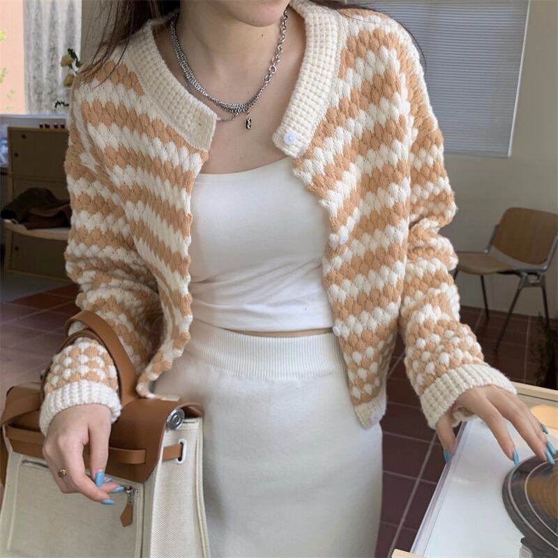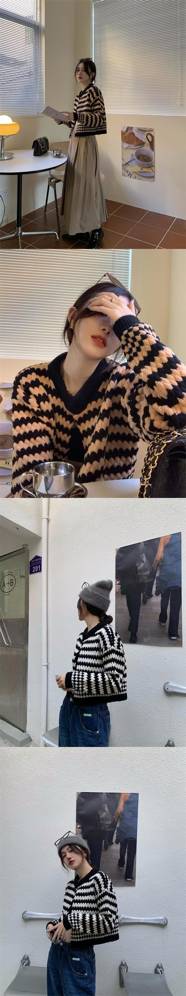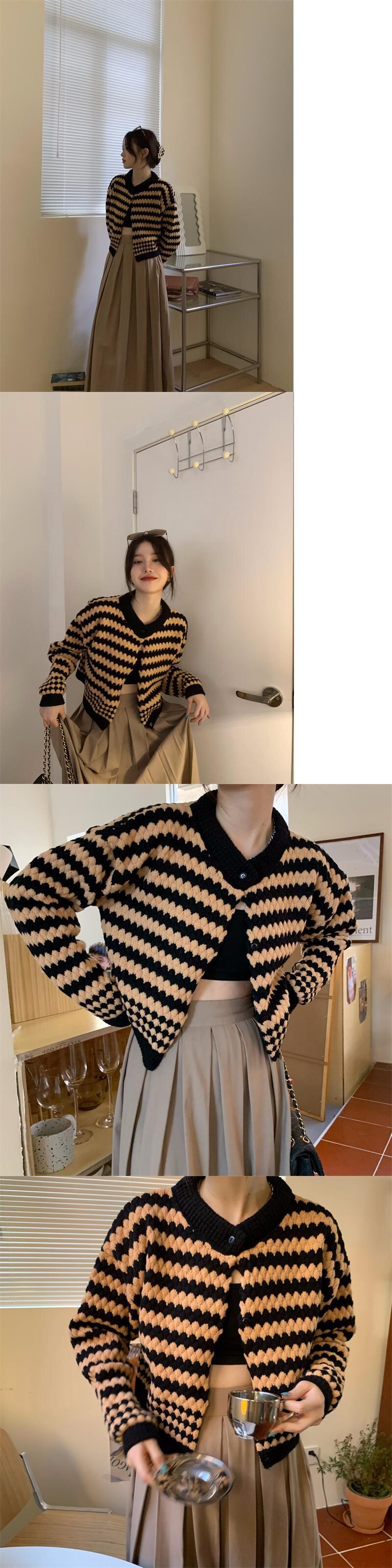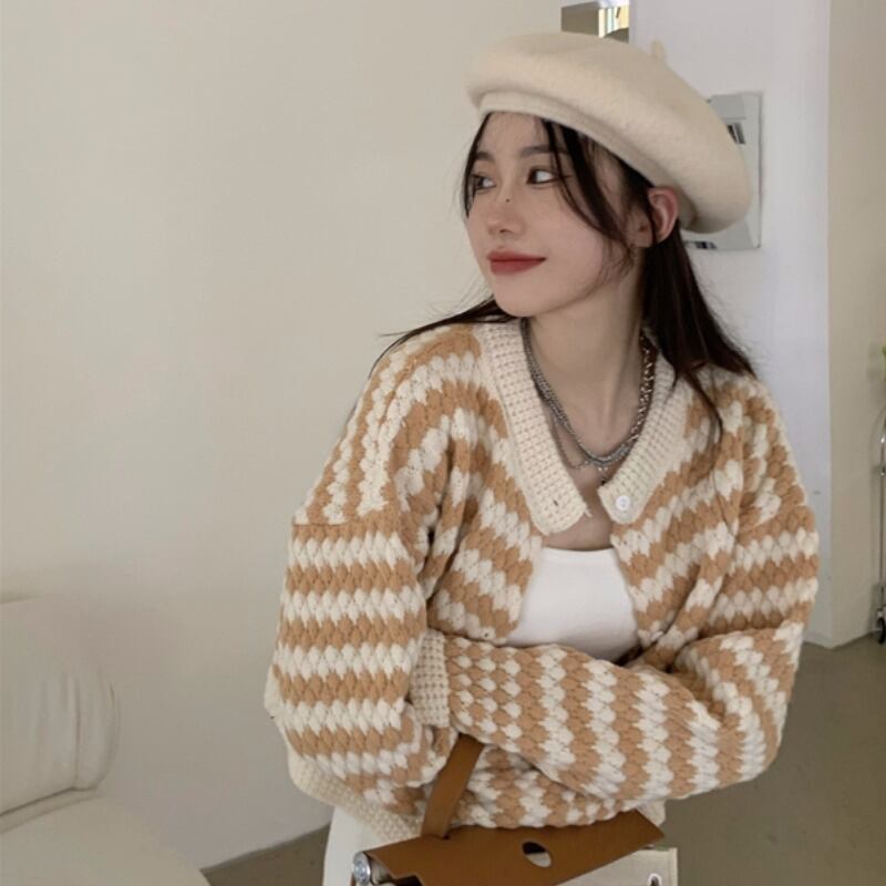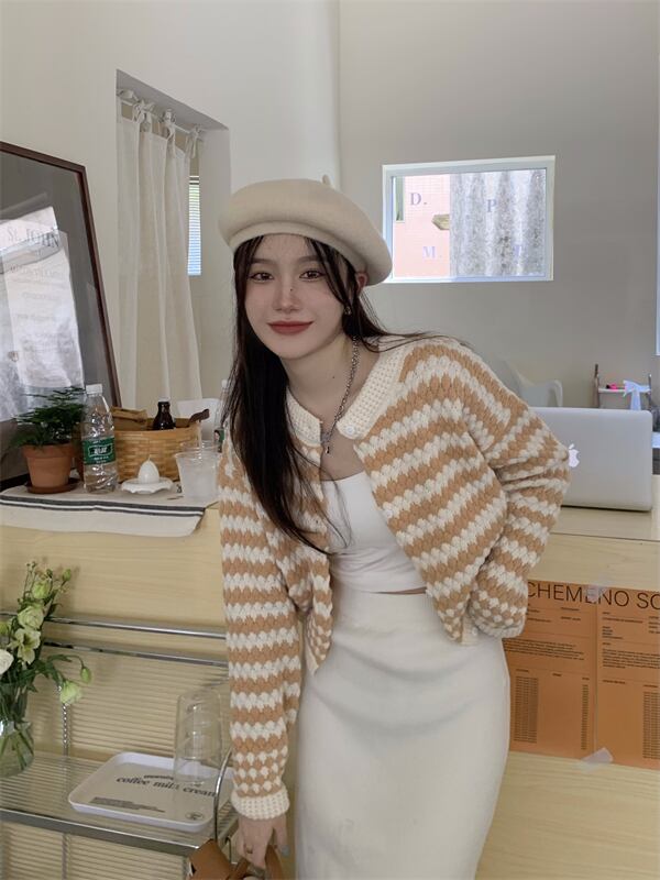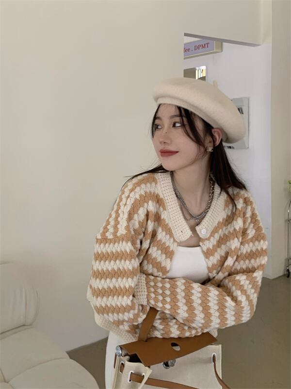 スタンダードストライプセーター コート スプリングオータムスタイルレッドショートニットカーディガン レトロ 春物 秋物 YY-ファッション5637515853